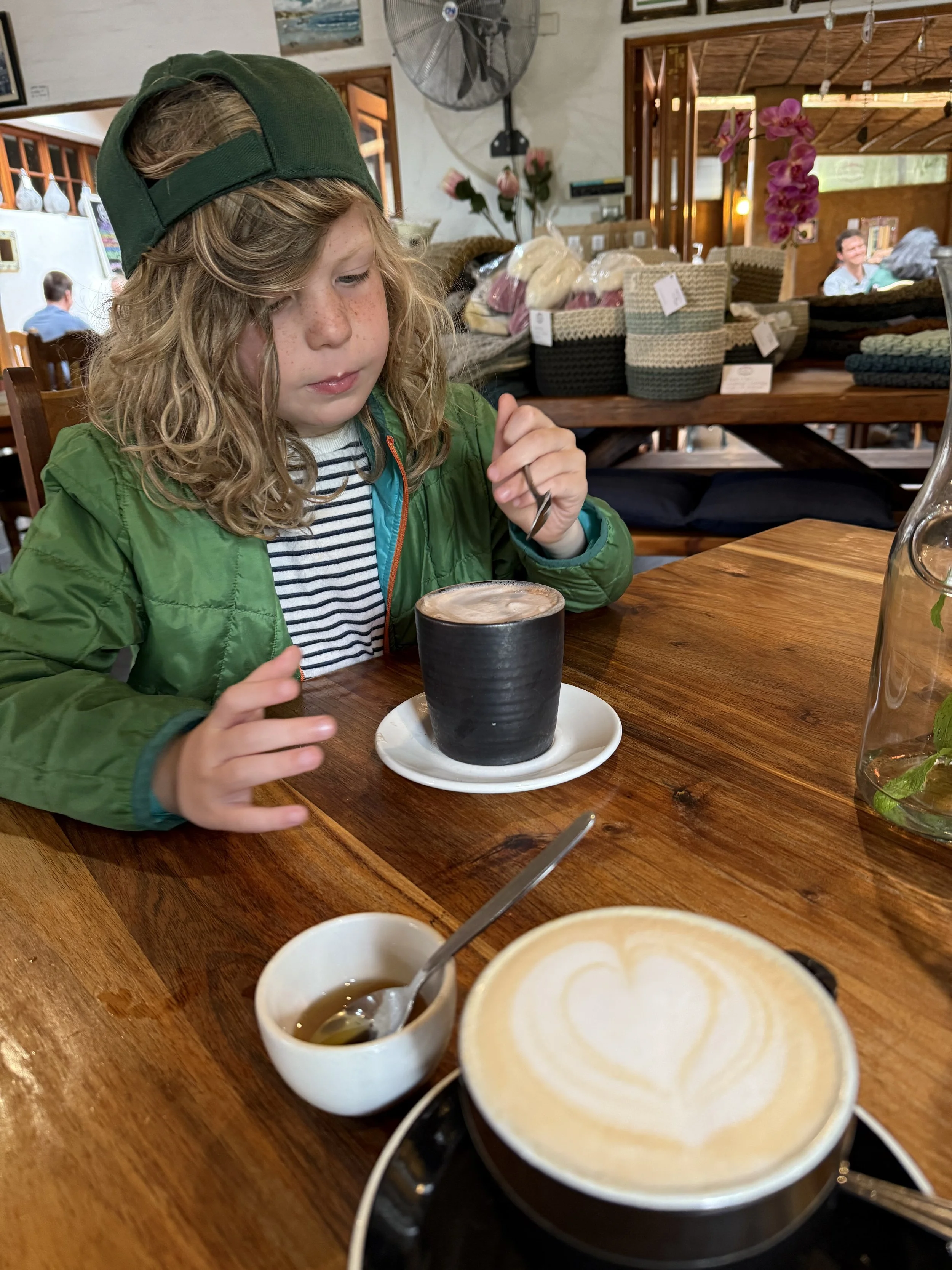 The hot chocolate obsession continues but in typical 4 year old style, Len hardly sipped his today. Kyle had a seared tuna steak with a super spicy pineapple salsa that he loved. Rambling Rose offers takeaway rotisserie chickens that we’re considering for dinner tomorrow night.
