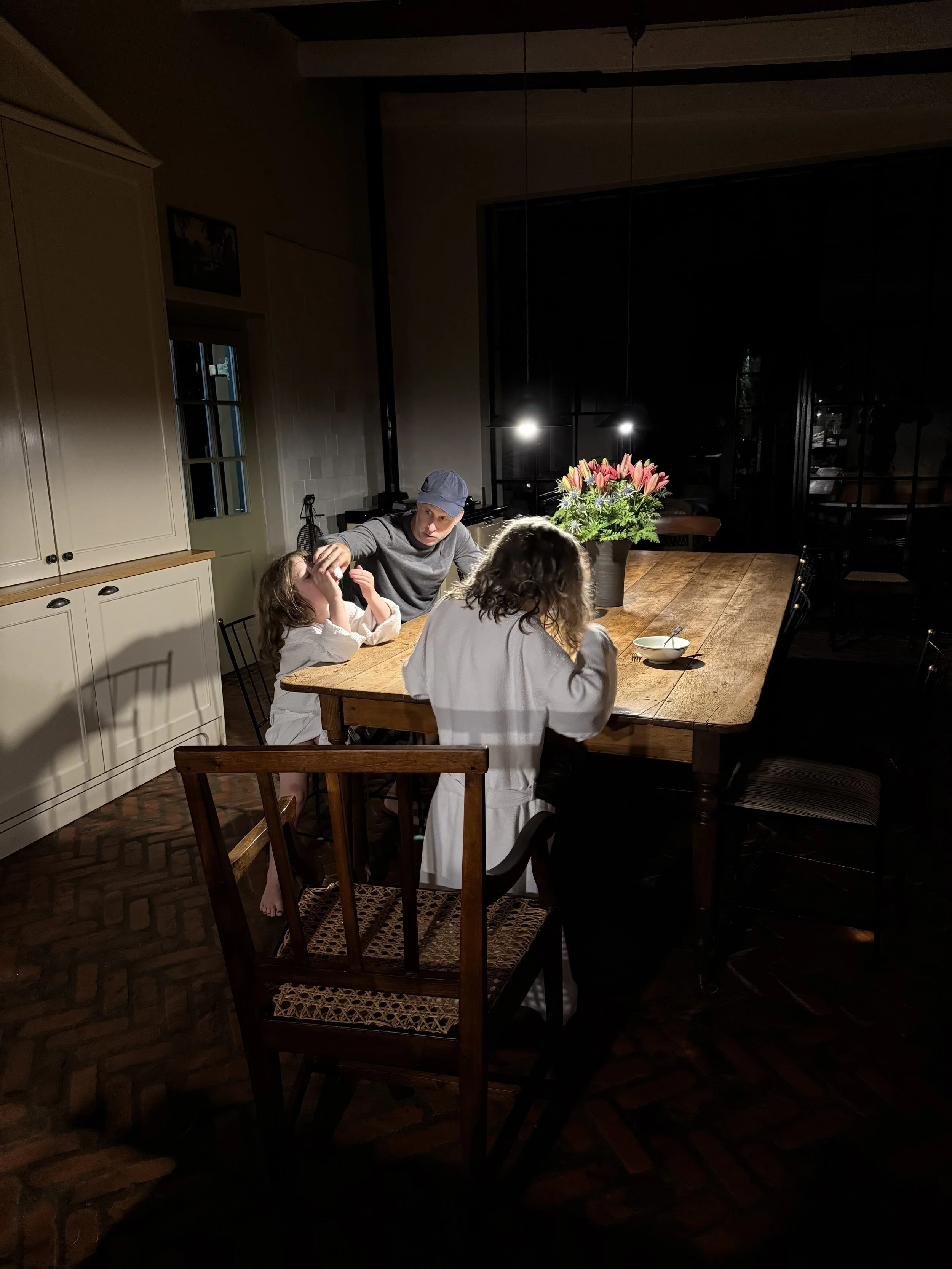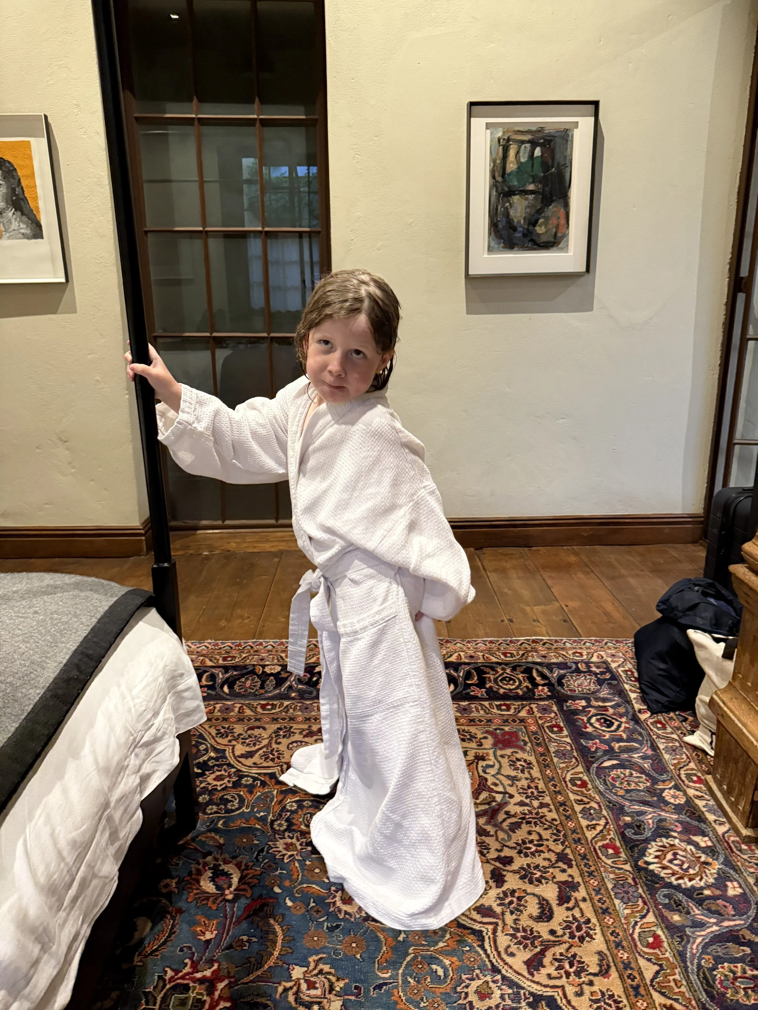 We ended the night at home by giving the boys a bath in one of the big bath tubs which they love. They also love that the house came with robes for them to wear and dance around in. Dinner was takeaway steak and escargot for Kyle and simple noodle soup and fruit for me and the kids. My stomach has been off so I haven’t been an adventurous dining partner for Kyle the past few days but am finally feeling on the mend. The kitchen is quite dark and moody at night and the groundskeeper, James, gave us a jump when he entered to close the shutters for the evening.