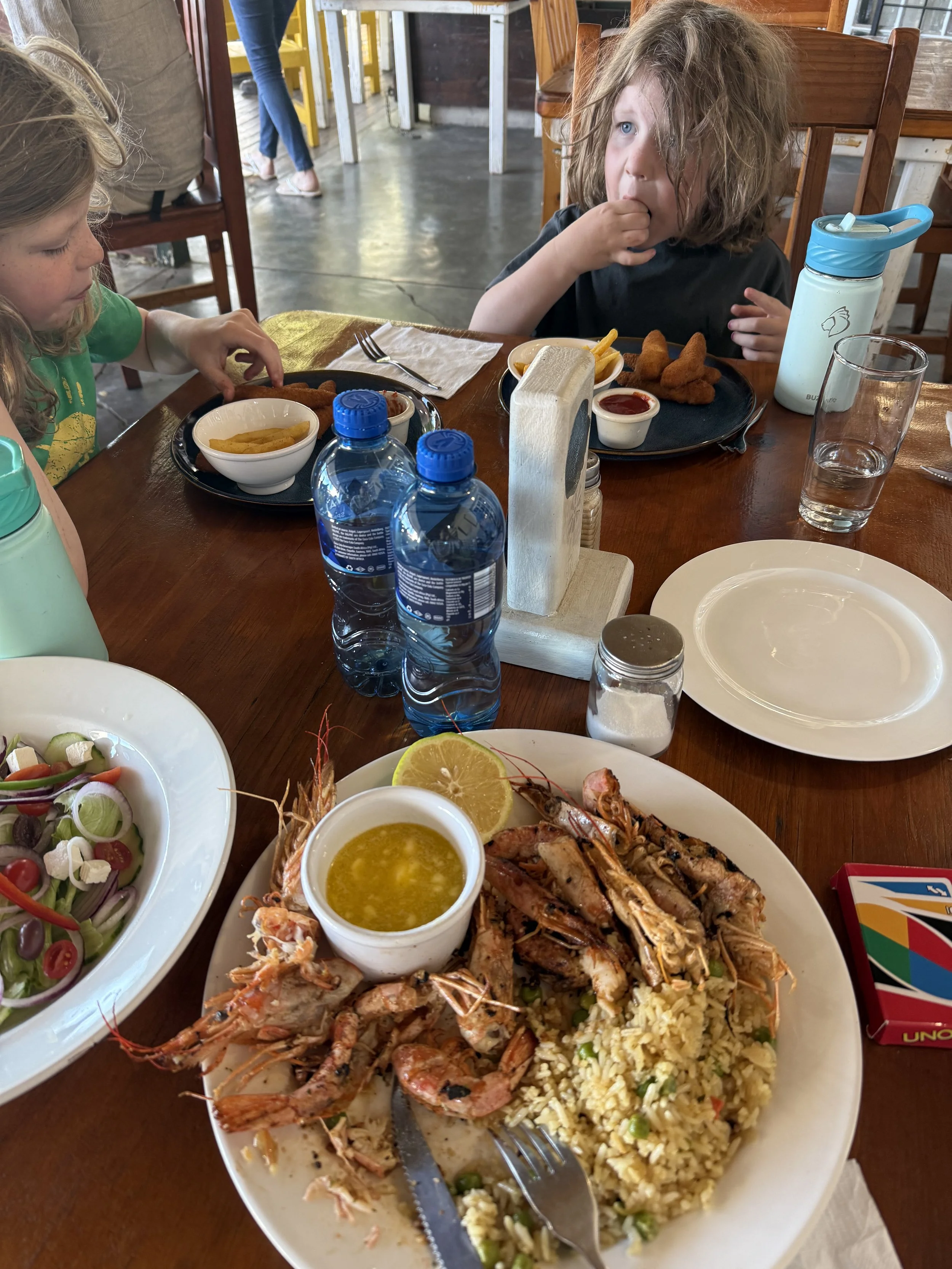 The price of food continues to shock Kyle and I as my lunch of 6 large barbecued (braaied) prawns plus sides was just $8 USD.