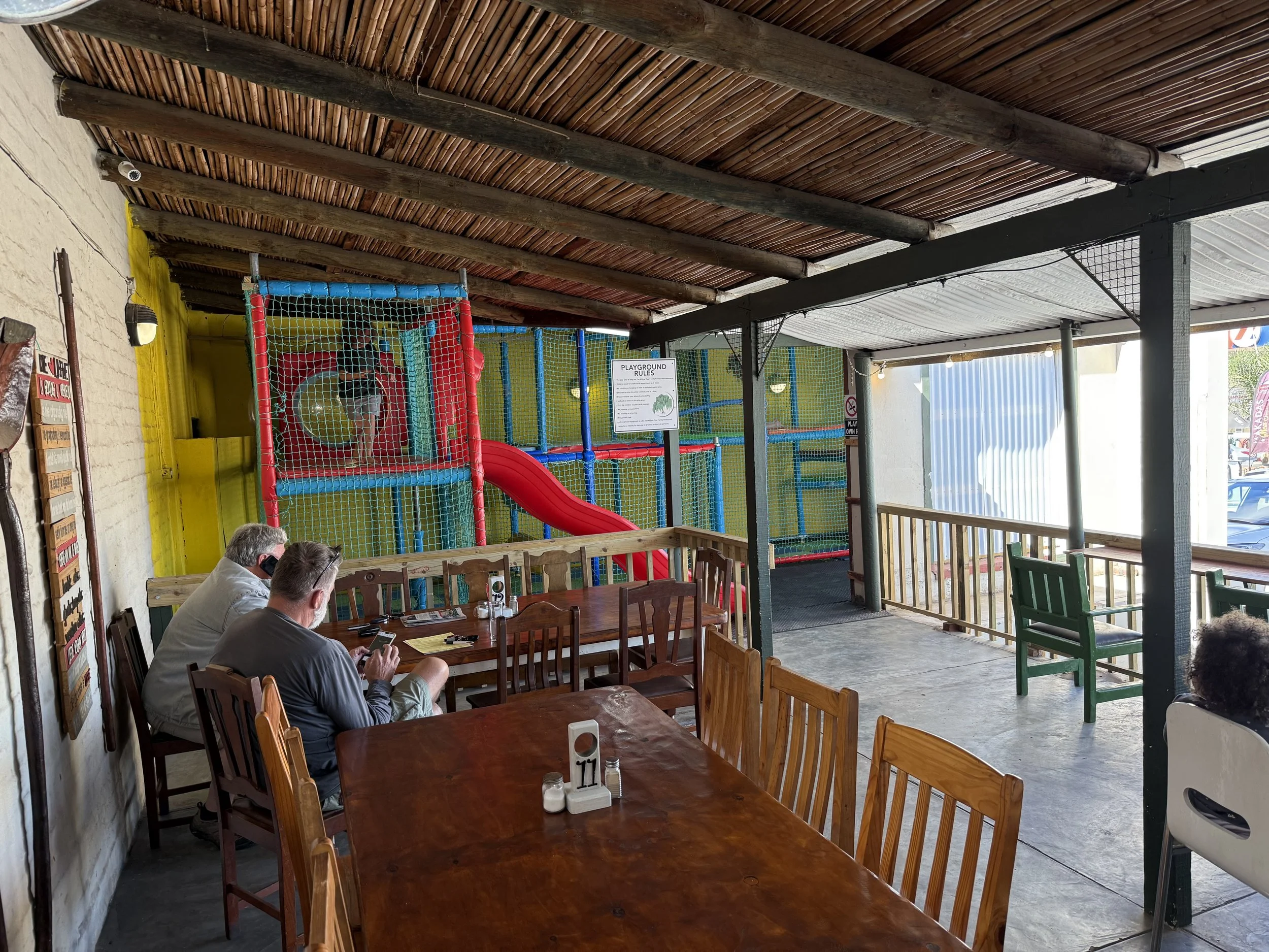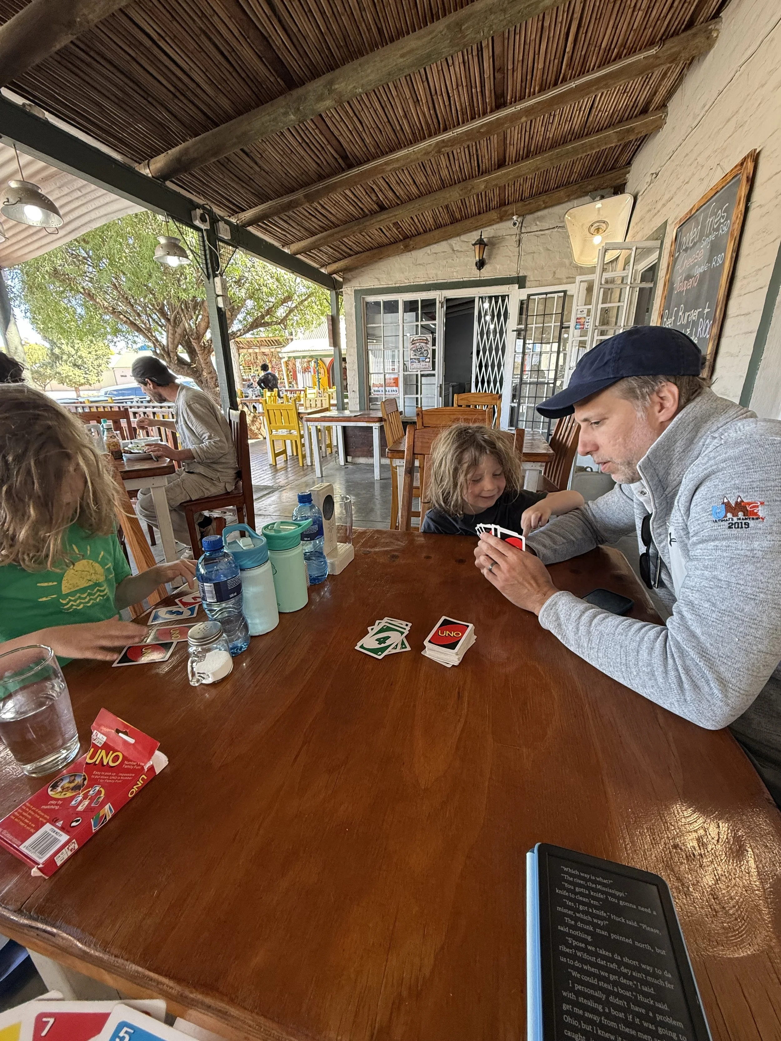 Our lunch stop was at the Willow Tree Family Restaurant in Ladismith. There was a small children’s play area that excited Lenny greatly and kept Ollie’s attention for a few minutes. Ollie soon left Len to join Kyle and I at the table for a game of Uno. He has trouble holding all of his cards so he instead lays them out on the table and creates a wall to try and block our view of his hand. The method has had so-so success to date and we often have full view of his cards.