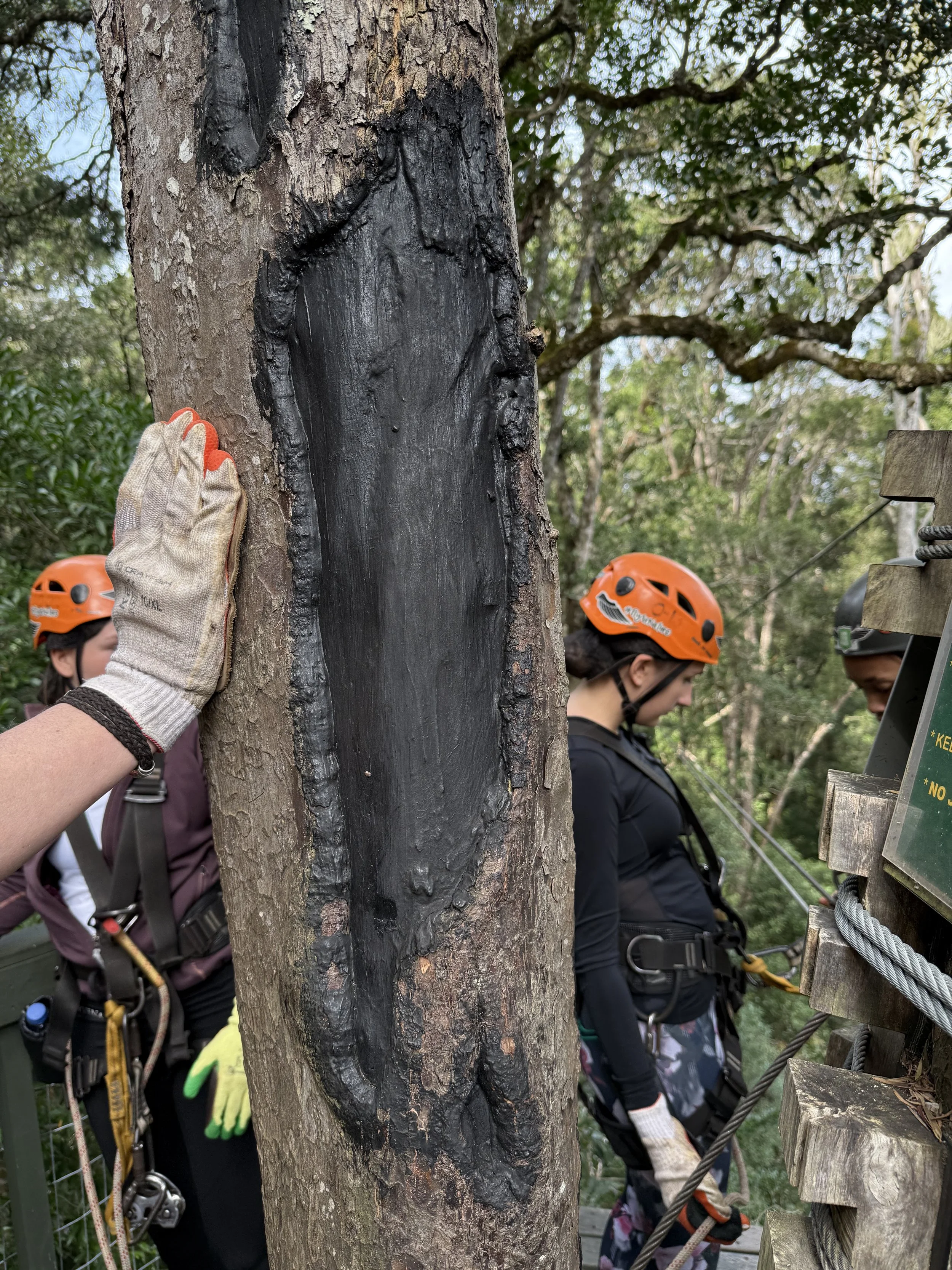 Any damage to the tree bark is quickly painted with a hard black coating to prevent rot or damage from insects. There were not any backup trees of the size needed to build a platform so if anything happened to one of the trees that was in use, there goes the business.