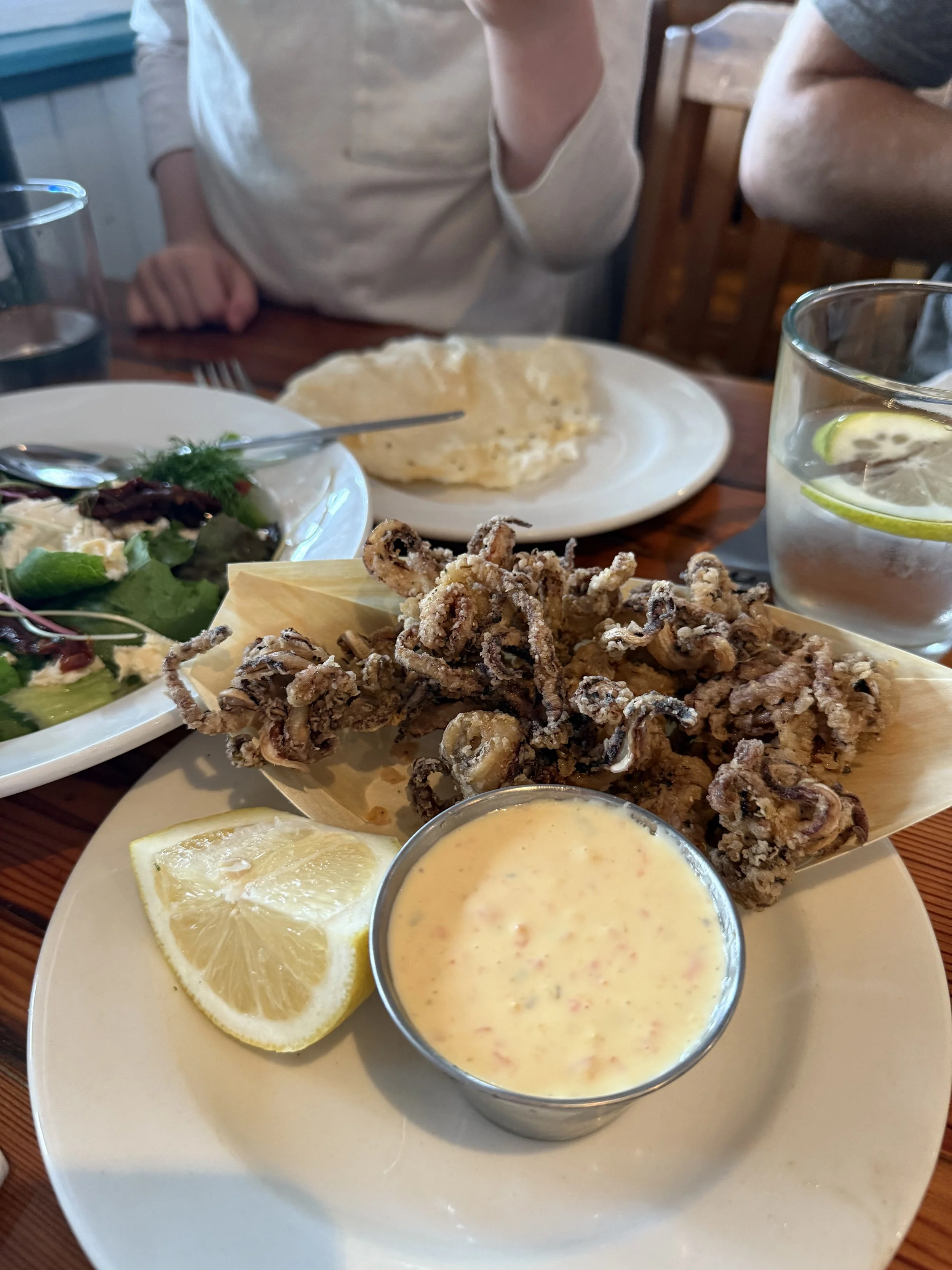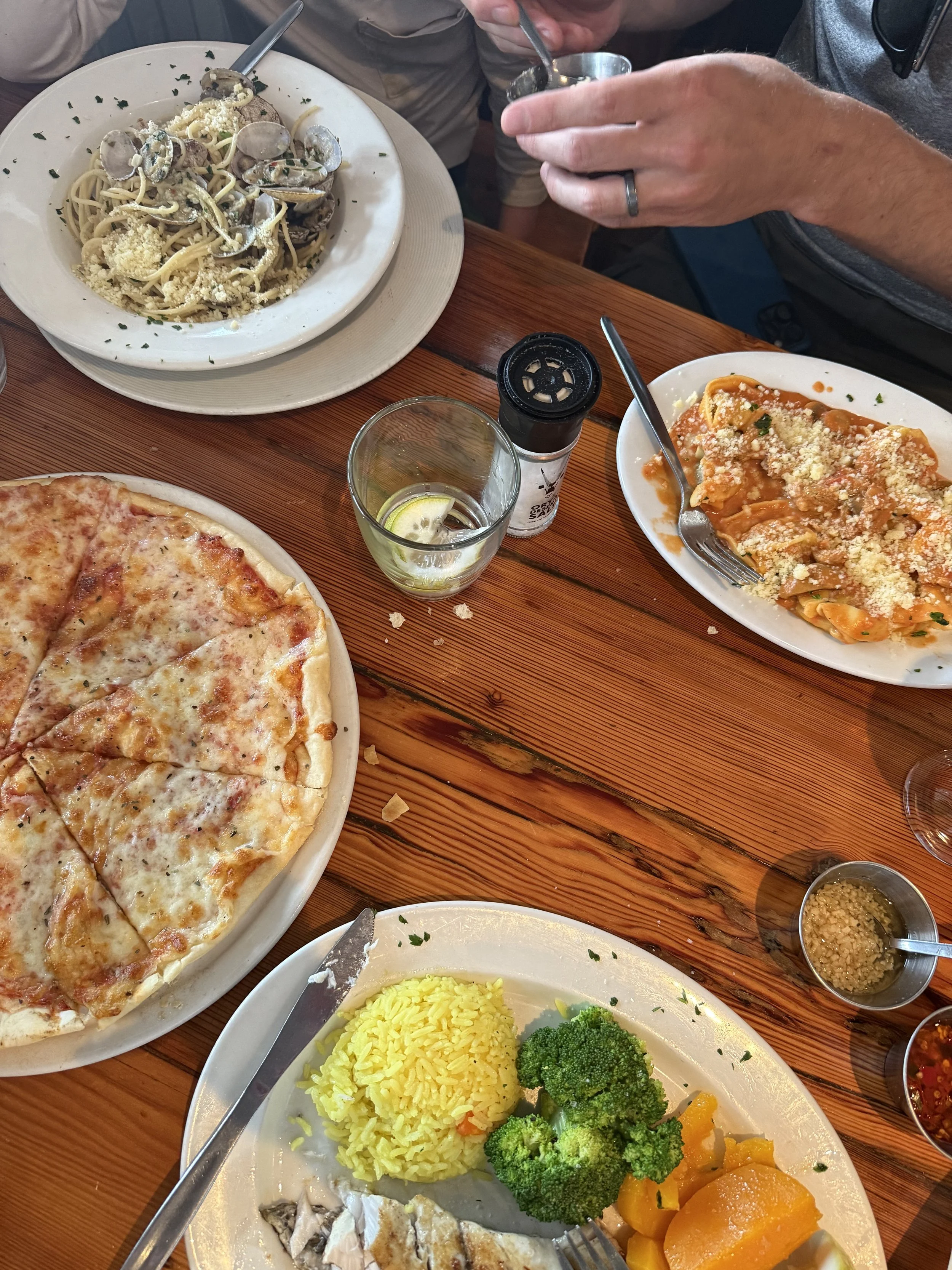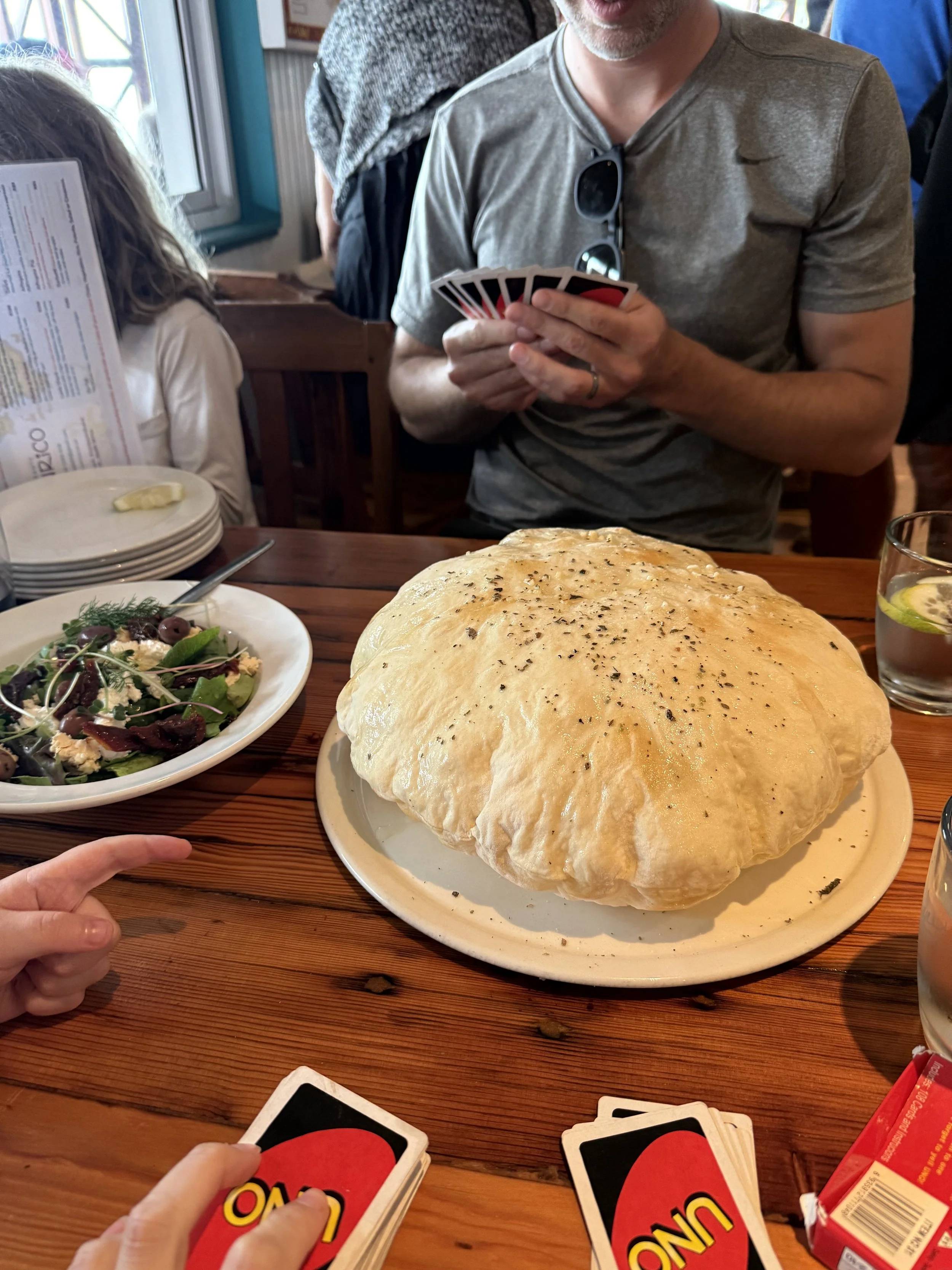 Fortunately the food was worth the wait. The garlic bread balloon, called bamba, was a favorite and the calamari was advertised on the menu as all heads which it was! My homemade pasta was great and Ollie’s pasta had ~50 tiny clams in it. He ate near all the clams!