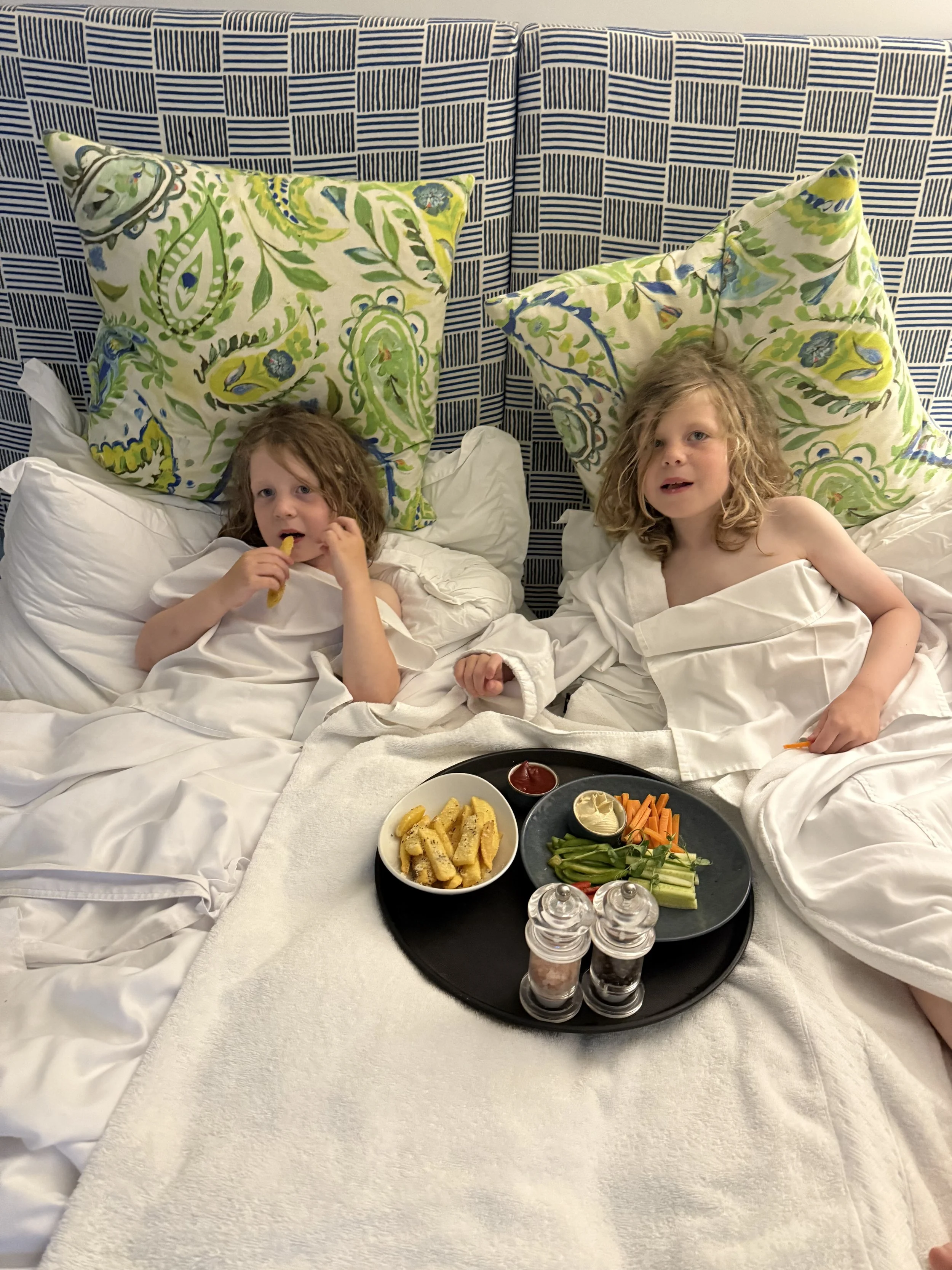 We were tired after all the events of the day and got a light room service dinner. The boys hummus & veggies along with french fries was likely their favorite meal of the trip since they got to eat it in bed watching TV.