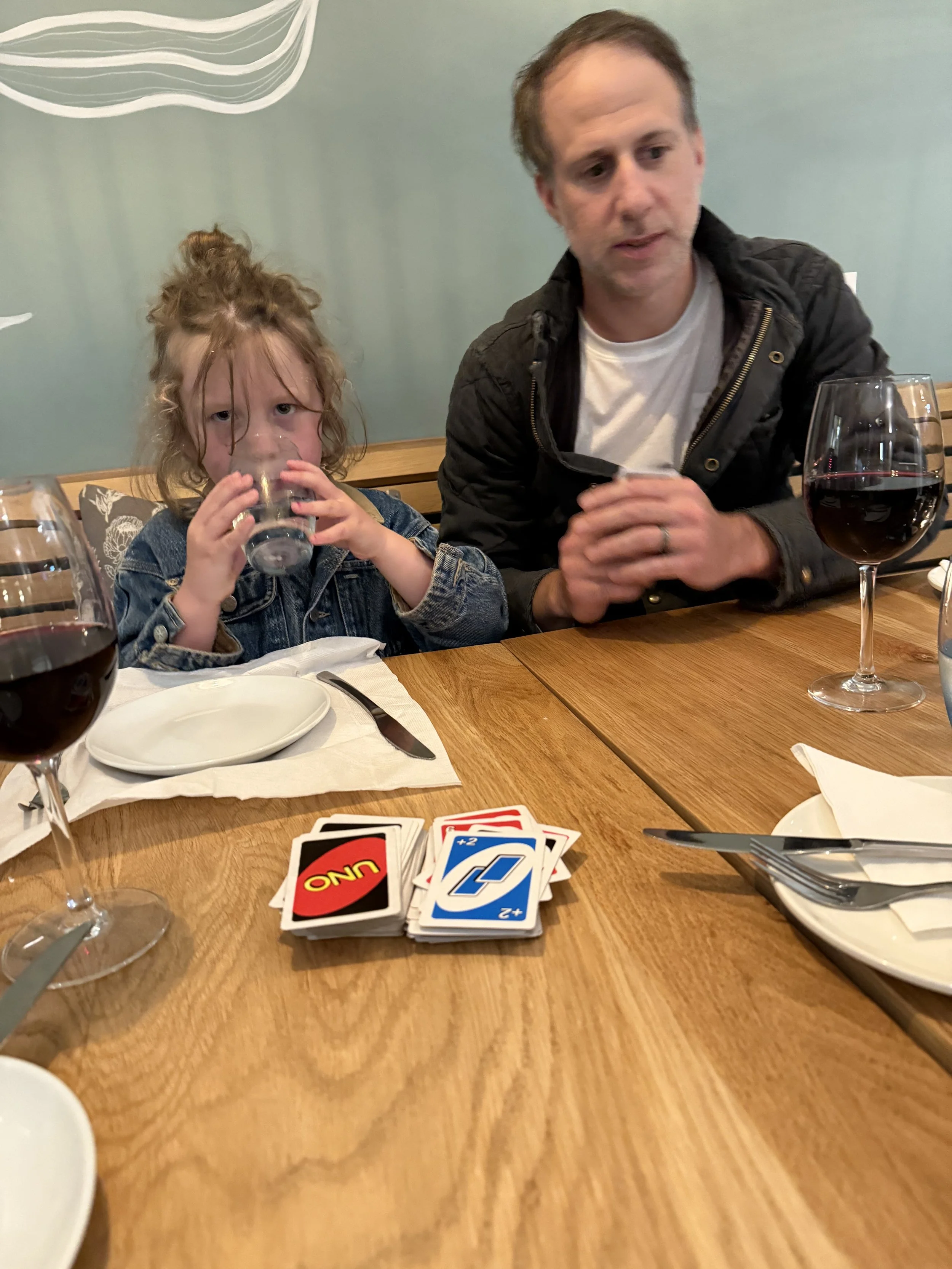 Uno continues to be a lifesaver at restaurant meals with the boys. Ollie typically plays independently and Len teams up with Kyle. Len is definitely getting the hang of it but has no desire to venture out on his own yet.