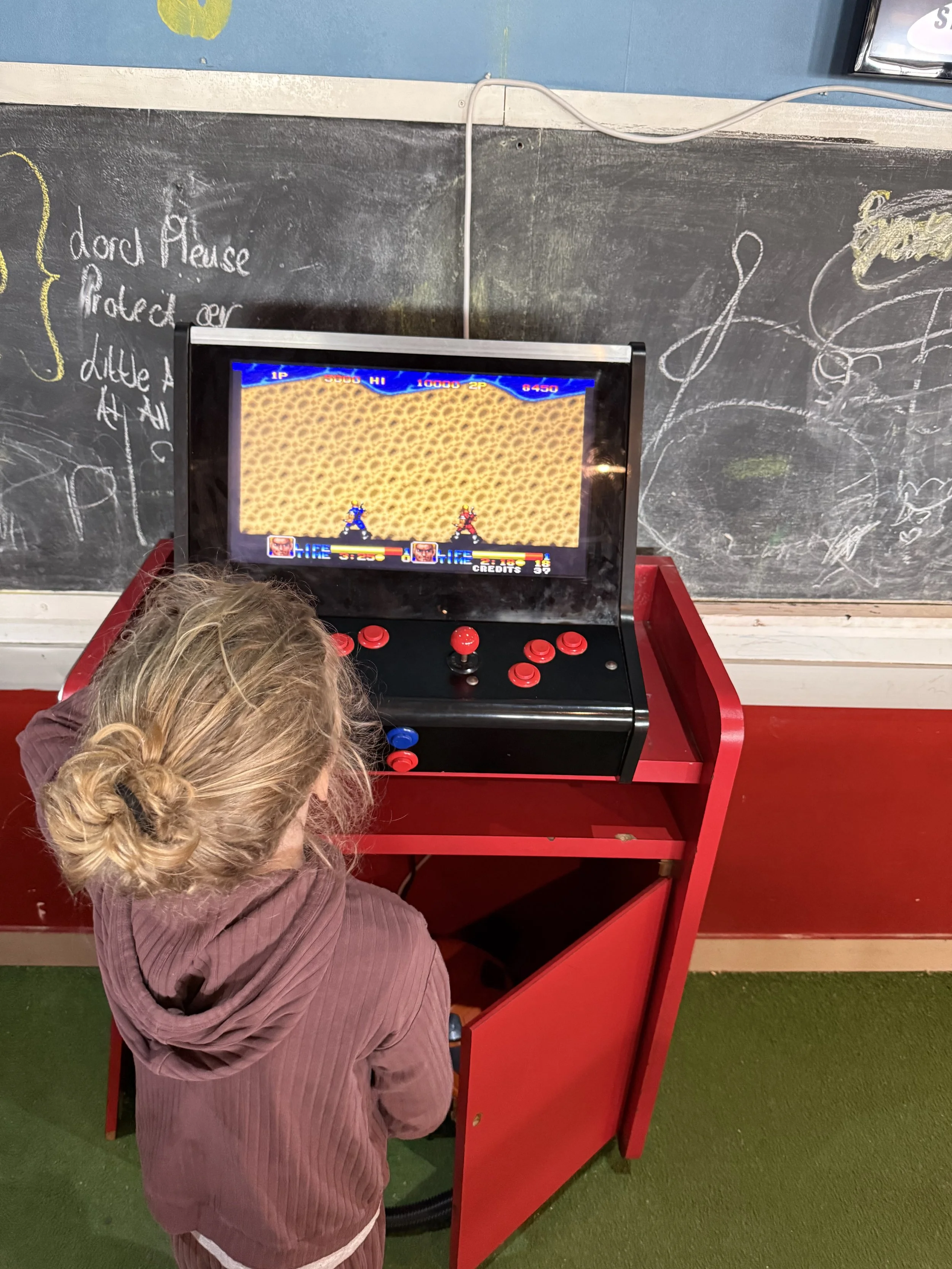 We were in the airport two and a half hours before our flight only to discover it would take about 10 minutes to get through security. Luckily there was a place to eat upstairs with an old indoor playscape and well as one, free, old school arcade game. The name of the restaurant was Whimpy, and I would describe it as a bad Friendly’s. At least it helped kill some time. The names of some restaurants in SA have been weird, two examples being Whimpy and Slop’s.