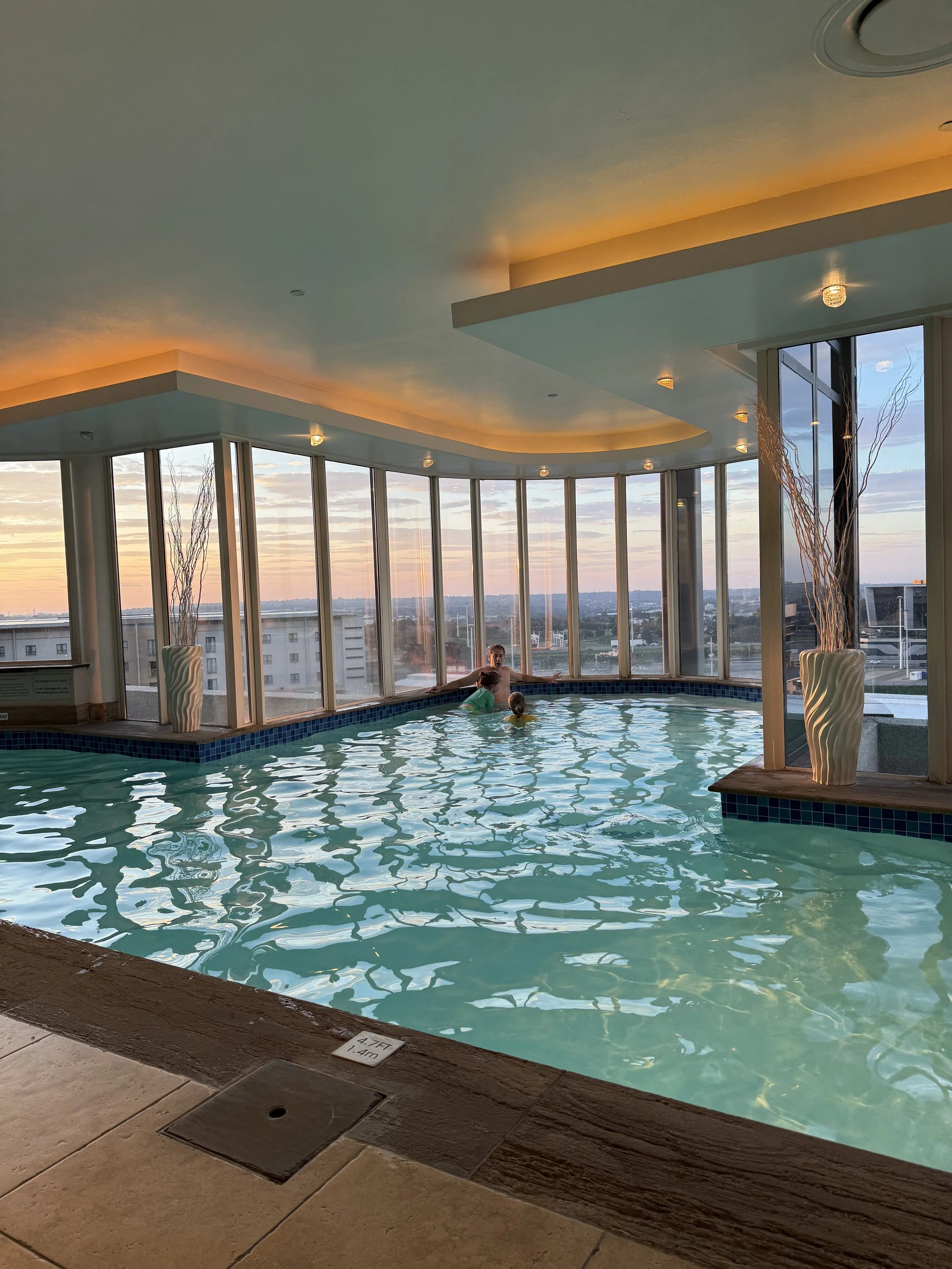 We landed safely and it was about a 10 minute walk to the hotel. We took the boys to the indoor pool before dinner to try and burn off some energy. The pool was located on the top floor and was right outside the spa treatment rooms. We were politely reminded to keep our noise down a few times. I tried but eventually gave up and just smiled and took the reminder every 20 min or so. Who puts spa rooms opening to a pool where kids are allowed??? We will be back there in a week ready to be scolded again.