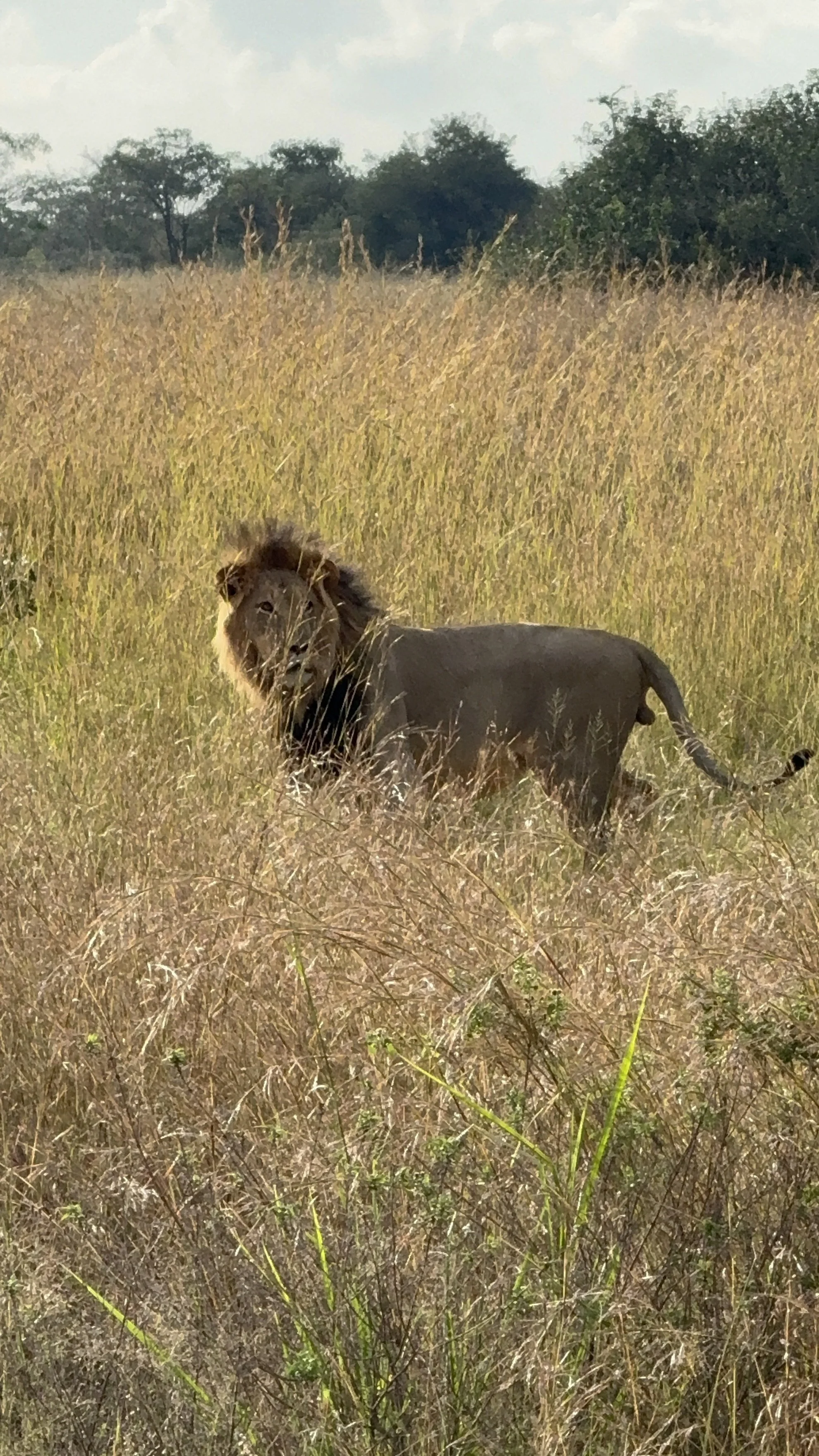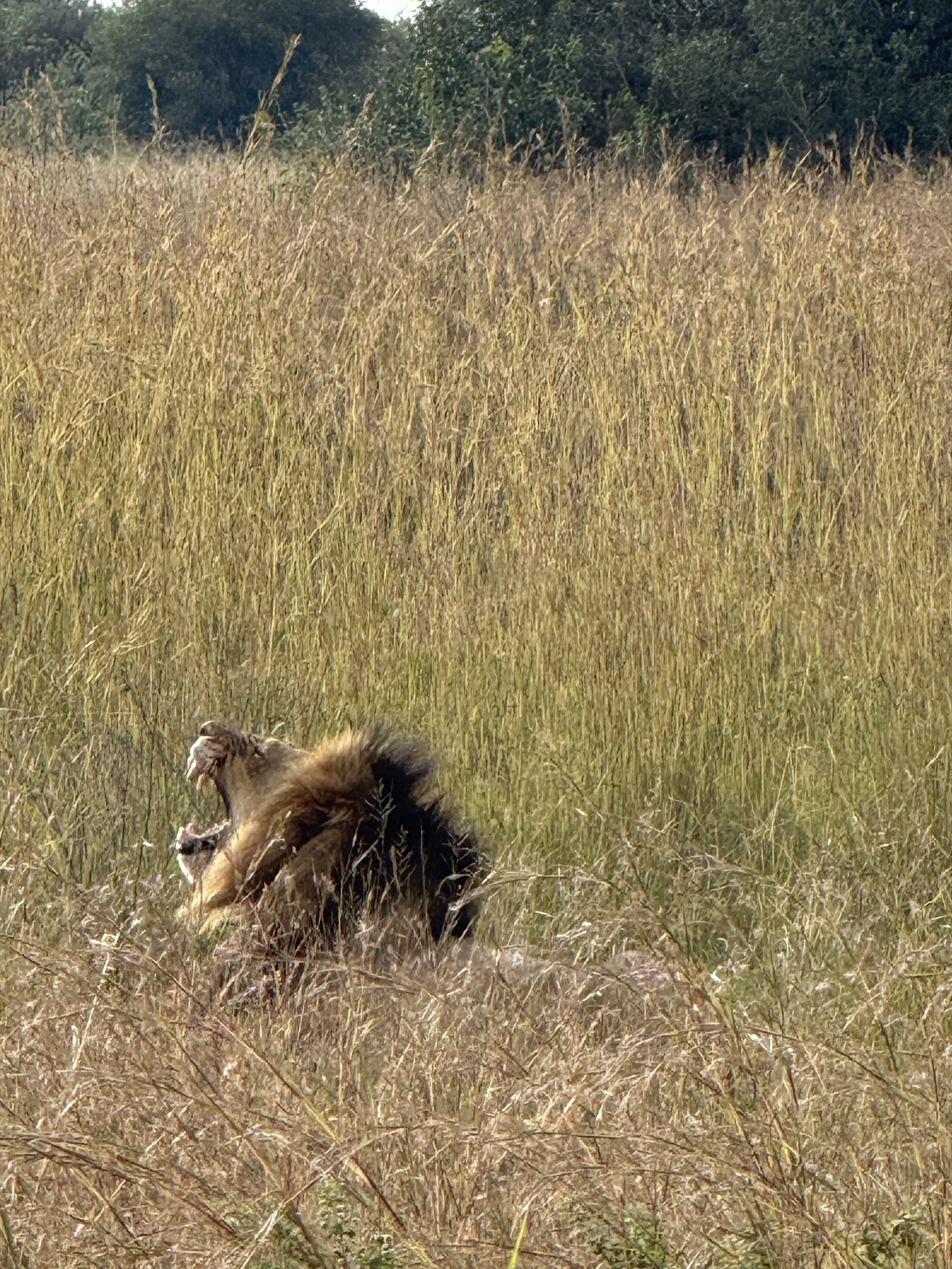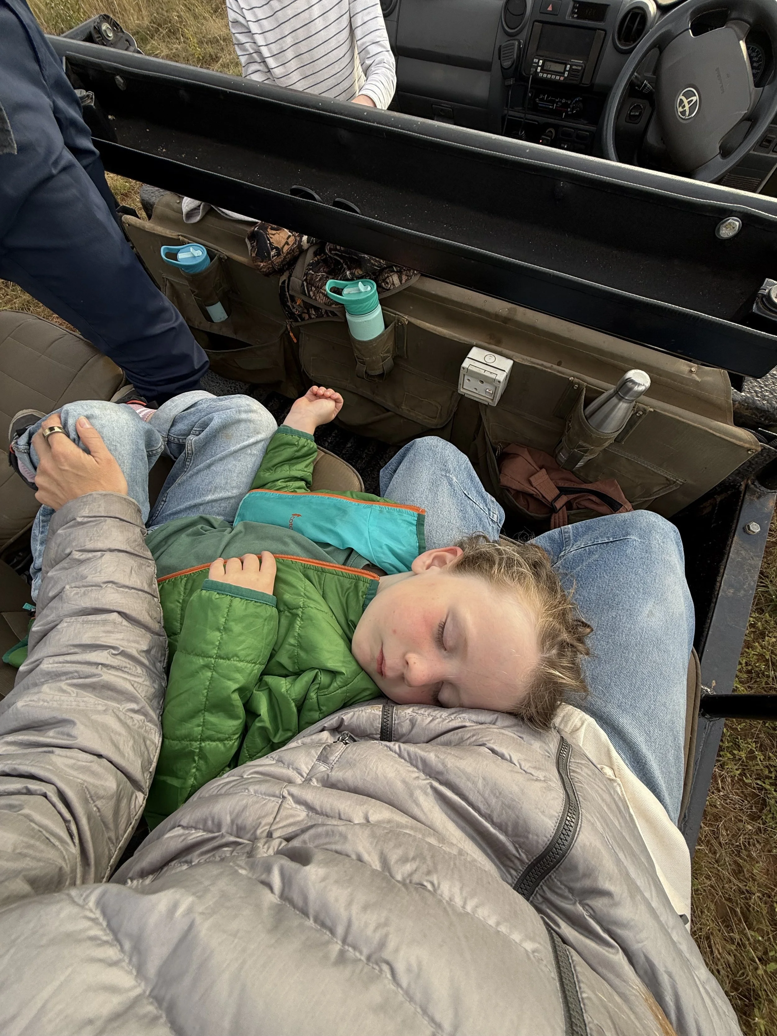 Len was exhausted from the long day but held it together for the leopard sighting. He soon laid down across our laps, though, and slept for the next 90 minutes missing a fair amount of action. We drove on from the leopard to look for lions. We again spotted the alpha from the pride we saw the other day laying in the grass. A truck from our lodge was also nearby the lion and ended up getting stuck in some deep mud. Ollie was entertained watching multiple trucks and methods deployed to pull the truck out of the deep mud. Eventually, the efforts were successfully and all the trucks from our lodge made their way to a large clearing where there was a group happy hour/sundowner gathering.