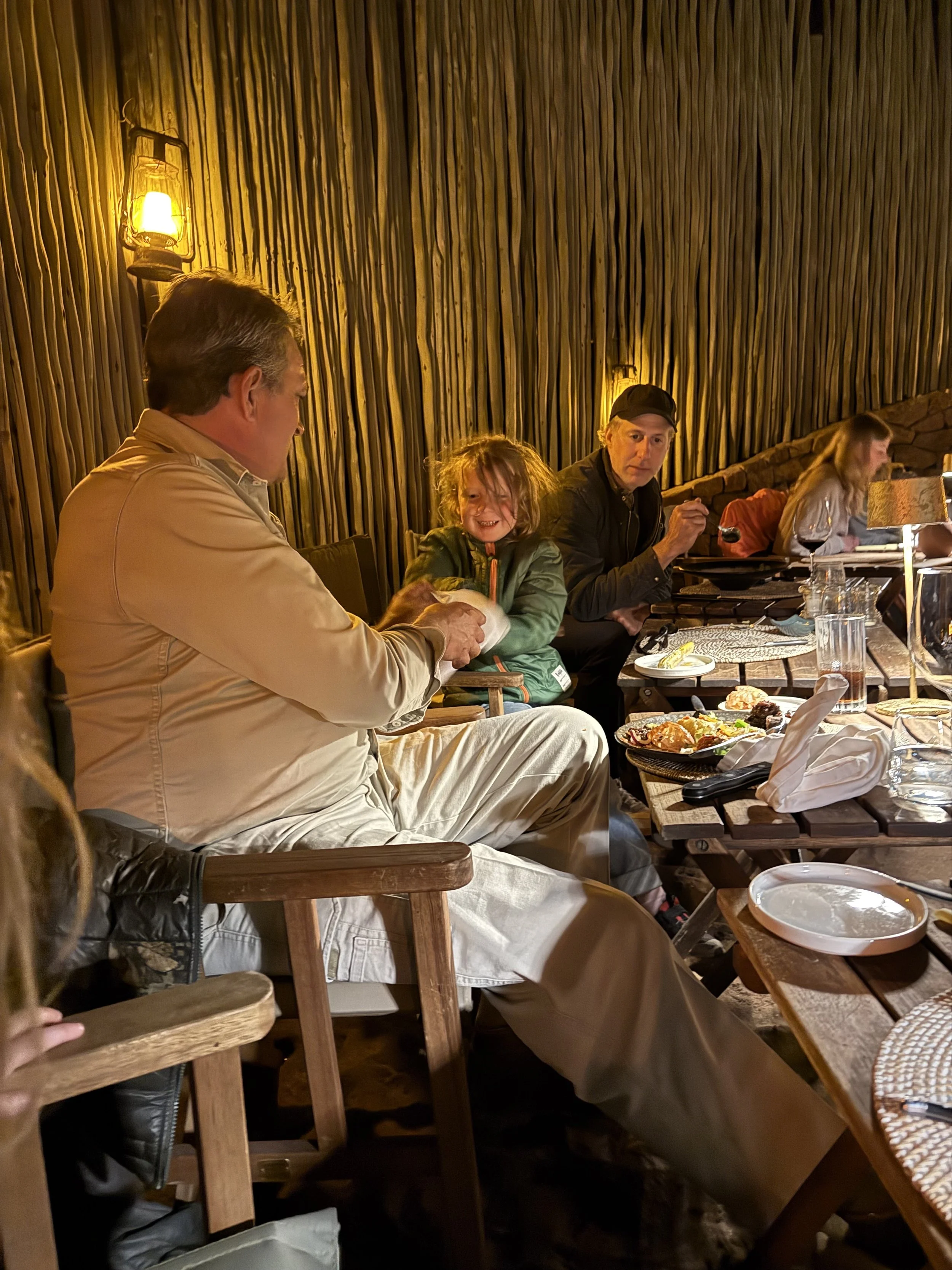 The lodge had a special dinner planned tonight with a buffet of local foods including Chakalaka and pap that we tried back in Cape Town. There was also local music and dancing that the boys declined to join in on. But as soon as the dancing stopped, both were emotional with regret over not joining in. Since we were all seated in a circle around a huge fire, we sat Joe in between the boys and he fielded a great deal of inquiries during the meal.