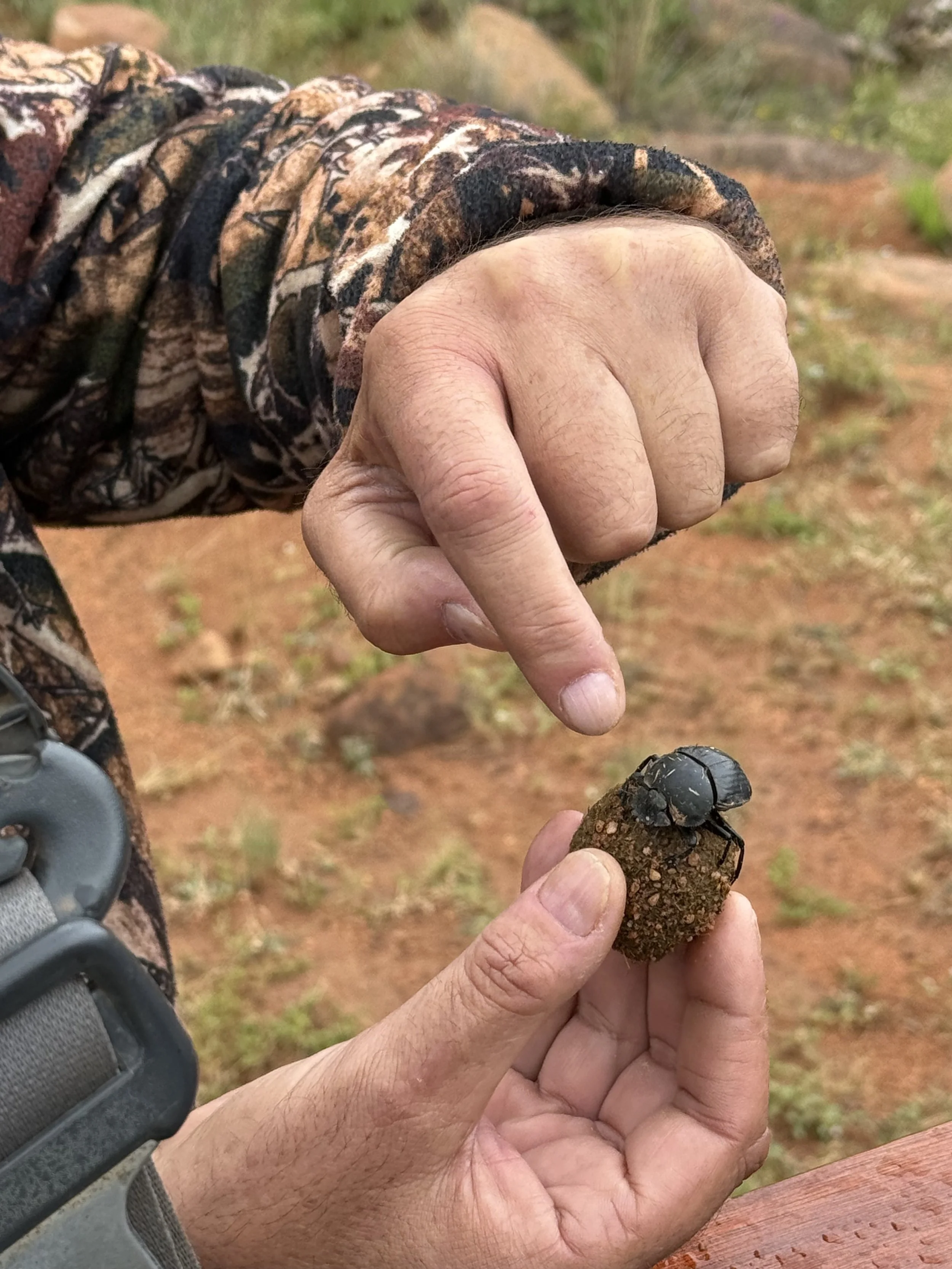 Along the way we saw our male Kudu friend and came across a dung beetle with his poop ball prize. Joe stopped so we could check him out and all got a chance to touch his very hard shell, except tough guy Lenny who chickened out.