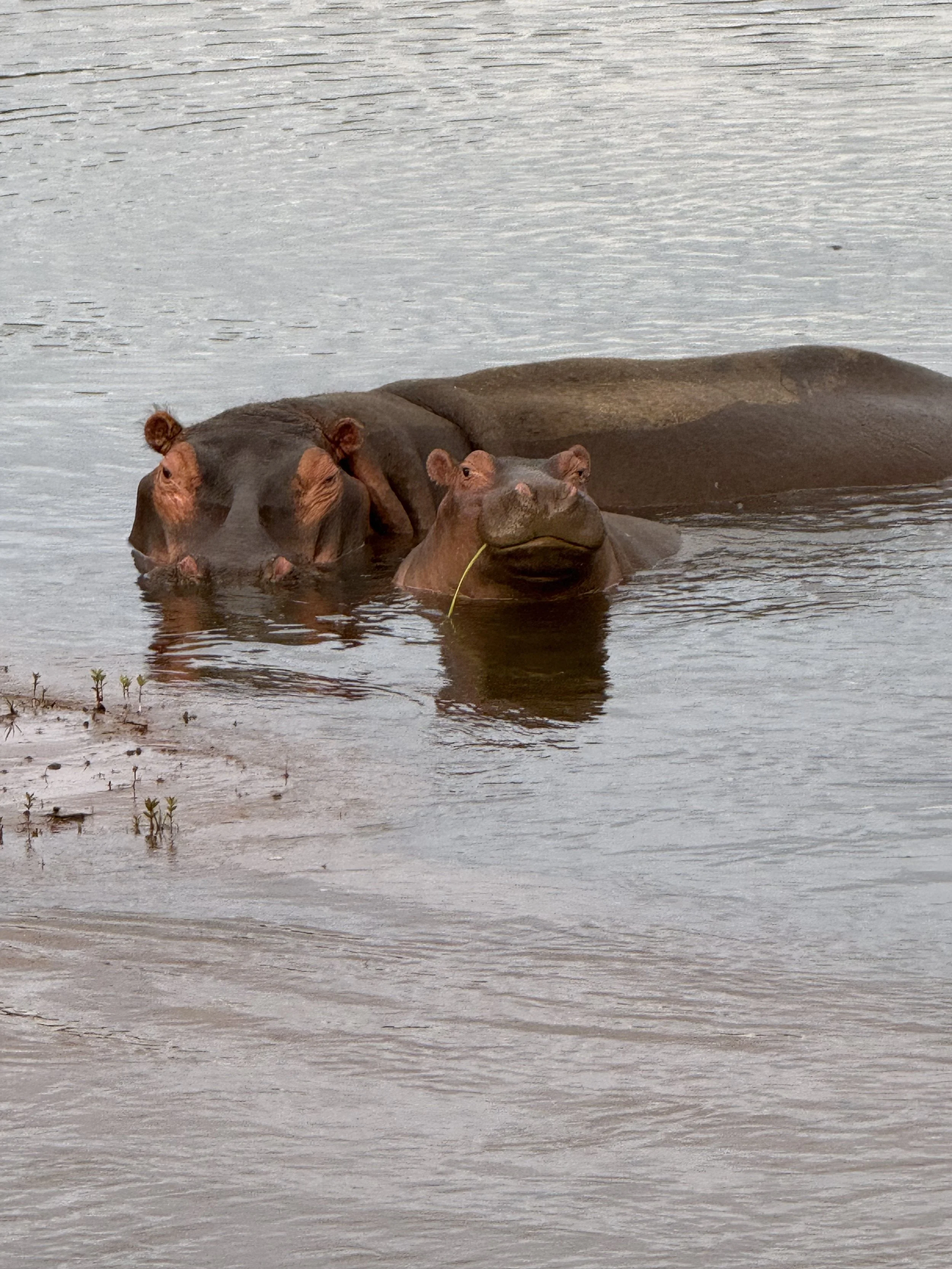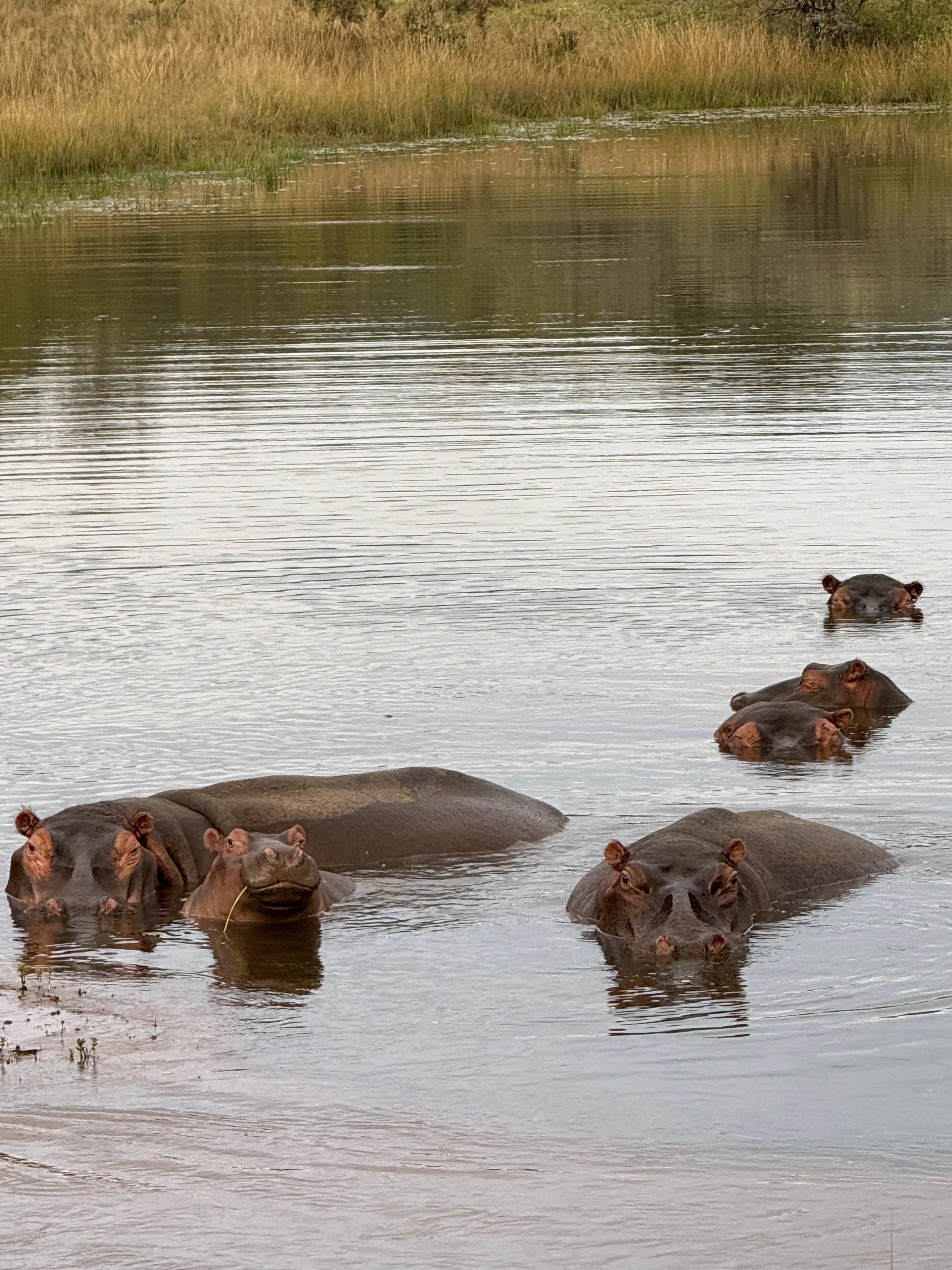 We wanted to see if we could catch the hippos out of the water this early. Joe had told us they come out at night to go eat when the sun isn’t out. They were not out of the water but much closer to the shore so we got a good look at them, especially the one cute little guy. Joe got out of the truck which got their attention and they all stared at us and let out a very loud deep moo-like sound.