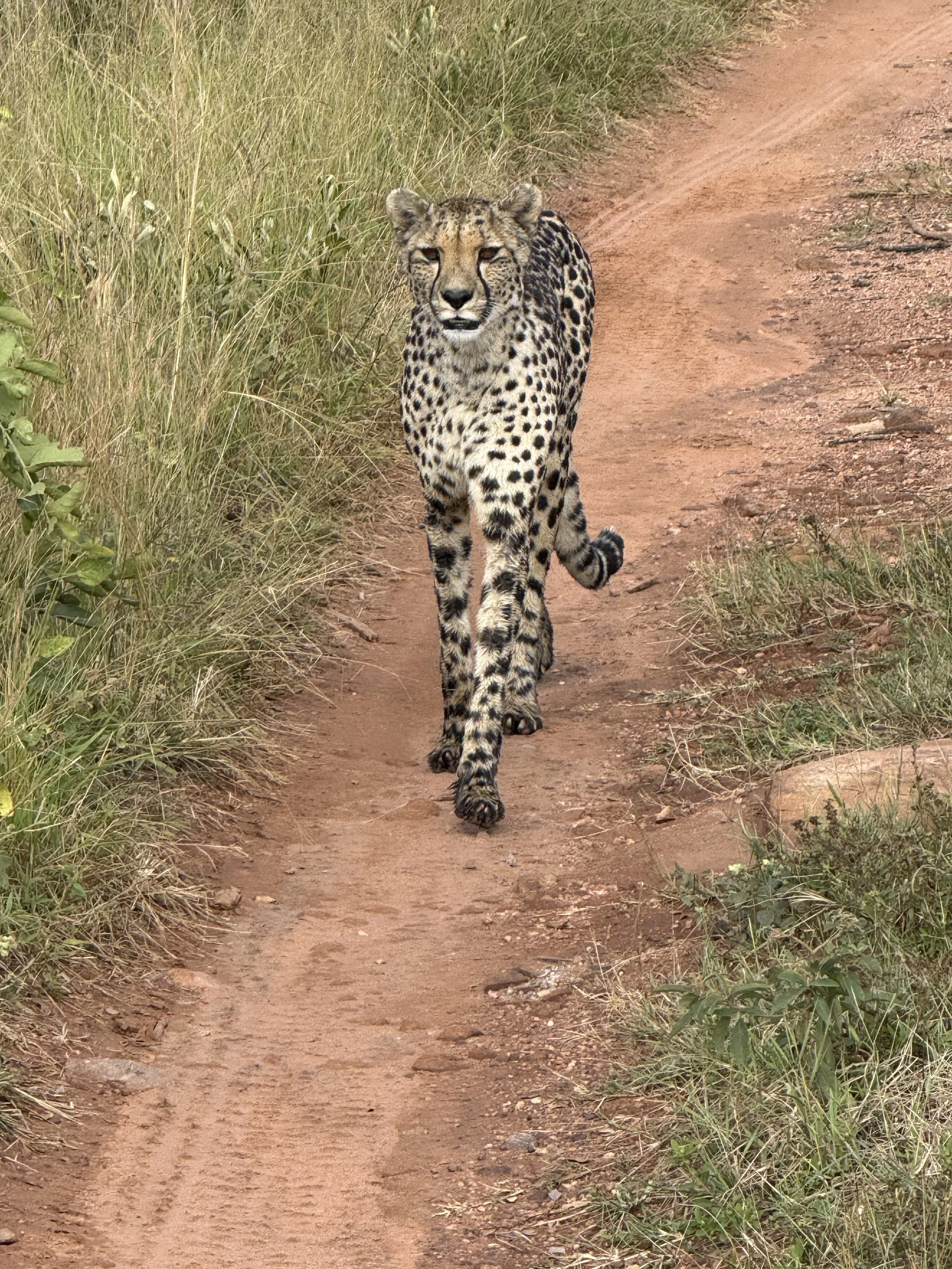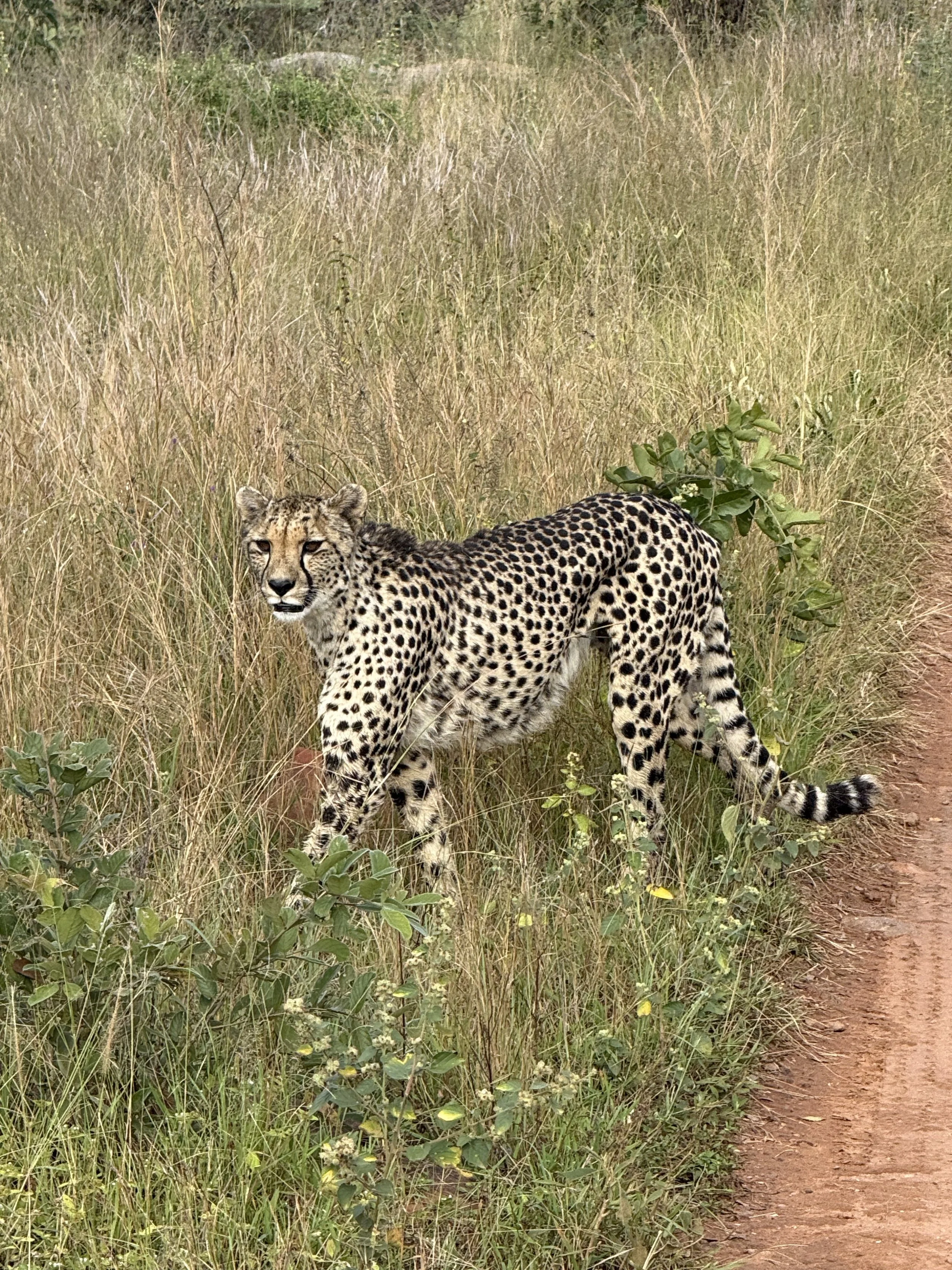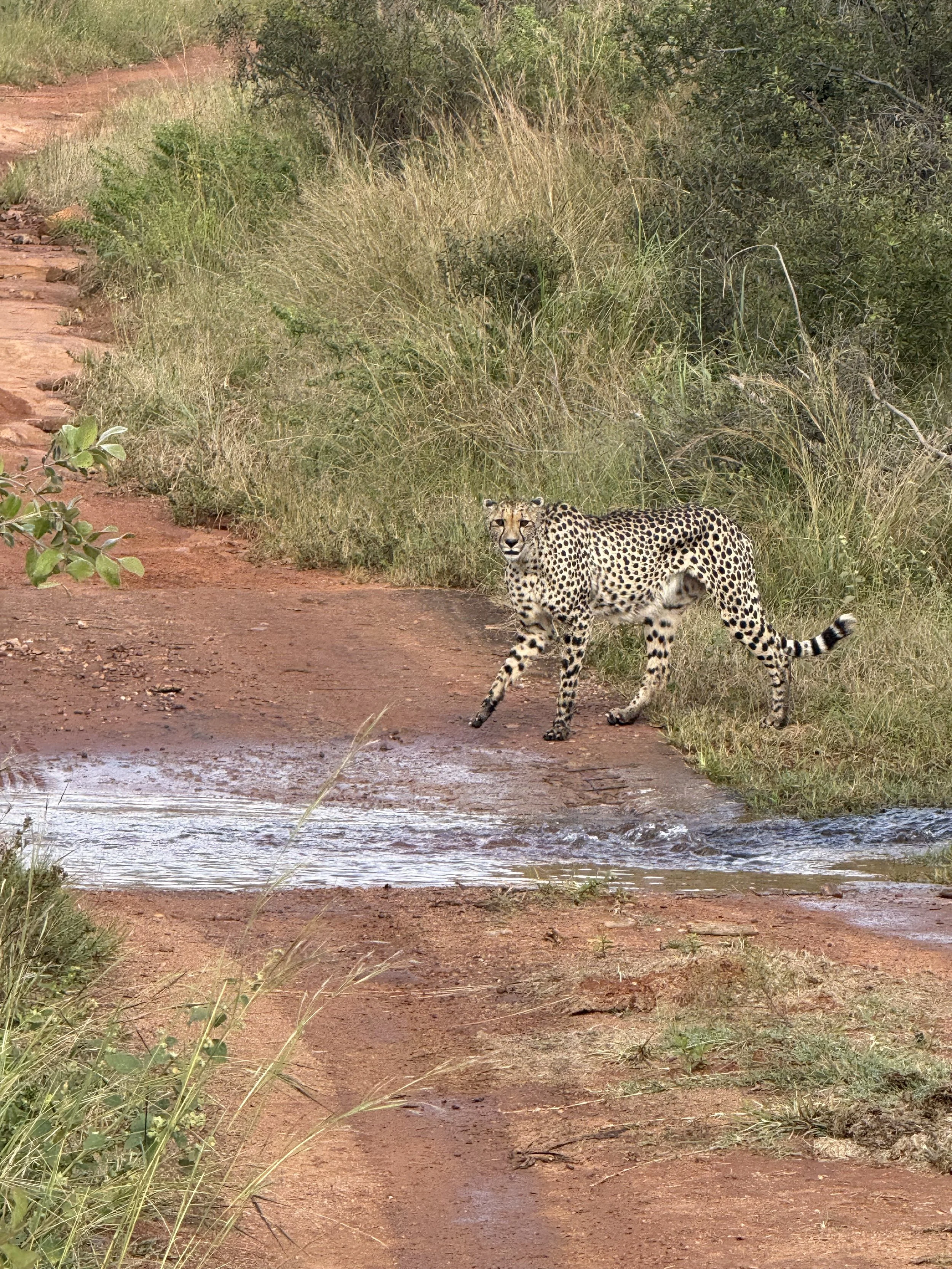 After our snack we got word of a cheetah sighting so we decided to give it a shot and drove to that area. The cheetah was walking through the brush but Joe spotted it. It wasn’t a great view but we were glad to have seen it. Before we knew it the cheetah was walking out to the road and gave us a great thrill. She crossed back and forth a few times giving us a great view. Joe said she was on a hunt.