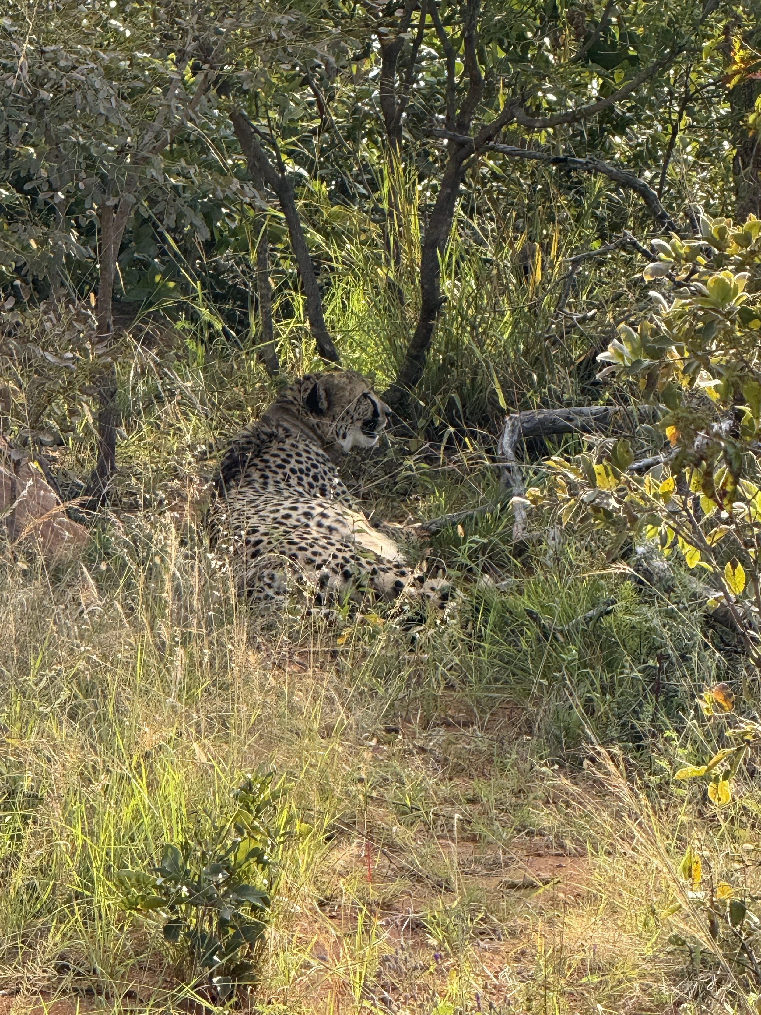 We stopped briefly to see the cheetah who was resting under a tree. Joe said she had already eaten and was now on alert while she rested because of all the noise likely made when she took down the kudu. He told us that most other predators, or even scavenger groups, would be able to kill the cheetah so she would move on shortly.