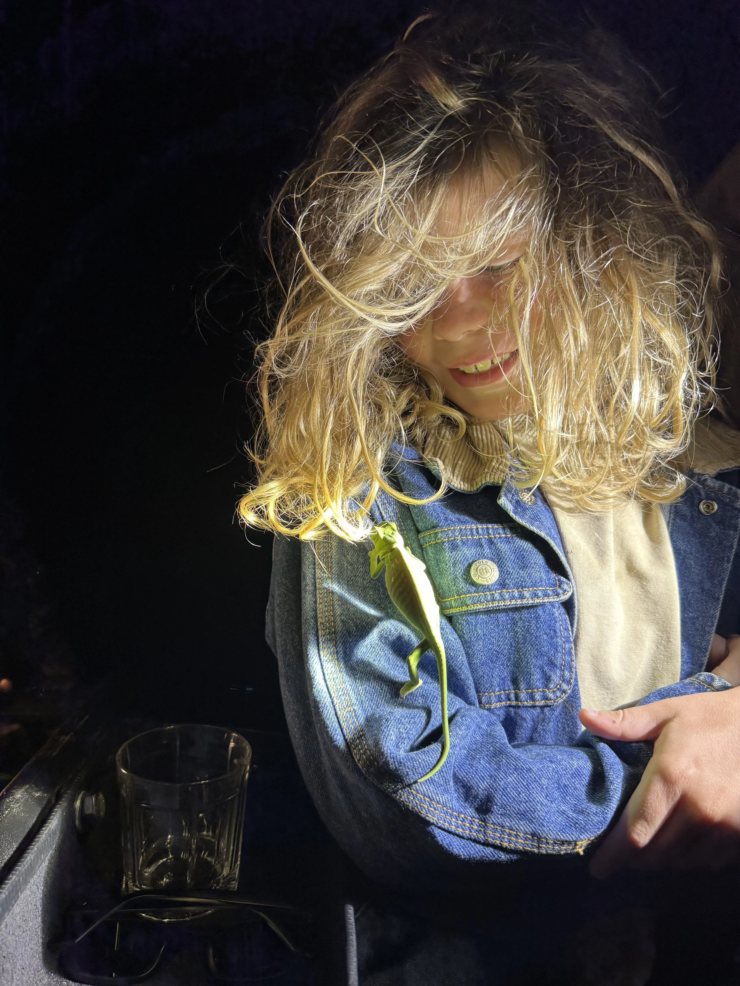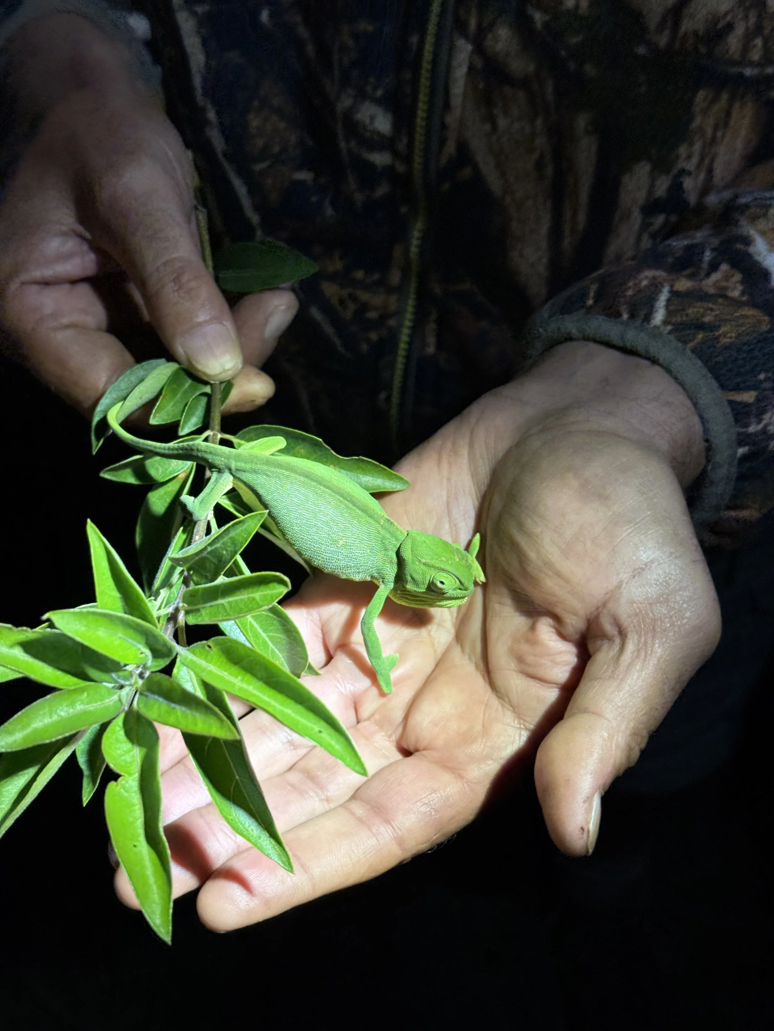 The best part of the drive came surprisingly on the ride back, in the dark, courtesy of Joe’s spotlight. He spotted a chameleon on a tree as we were zipping past! I could see it as soon as we backed up and held the spot light while Joe cut the little branch it was sitting on. Can you find it in the first picture? Ollie was thrilled to hold it and let it crawl on him. Lenny said he wanted a try but quickly reversed.