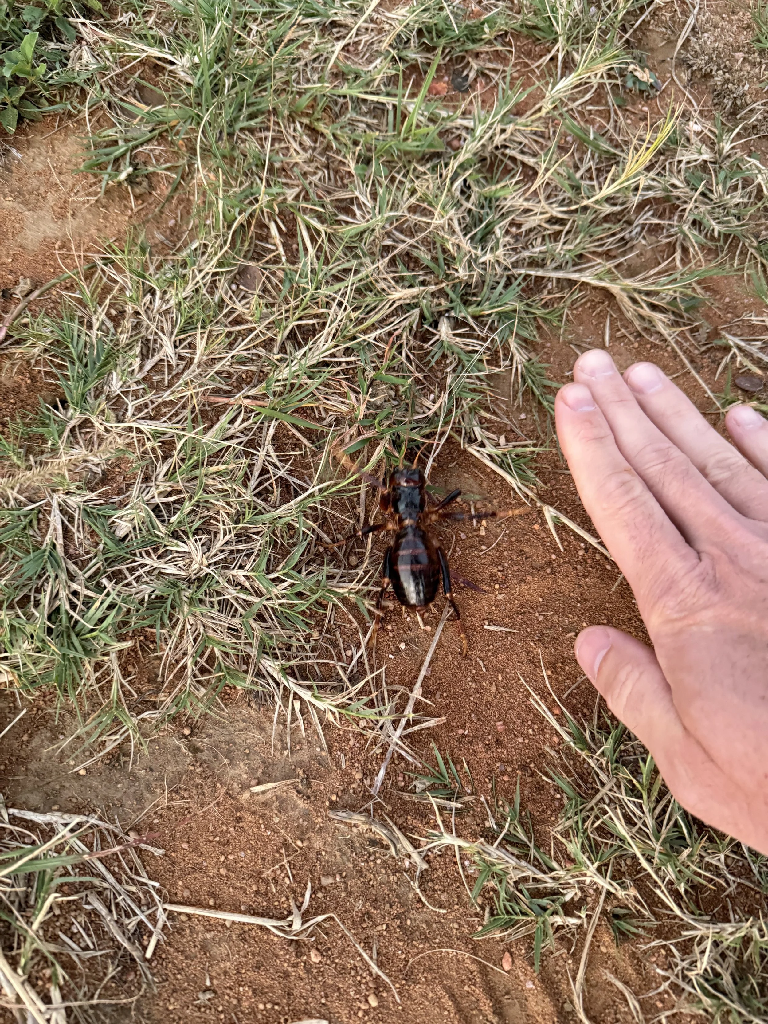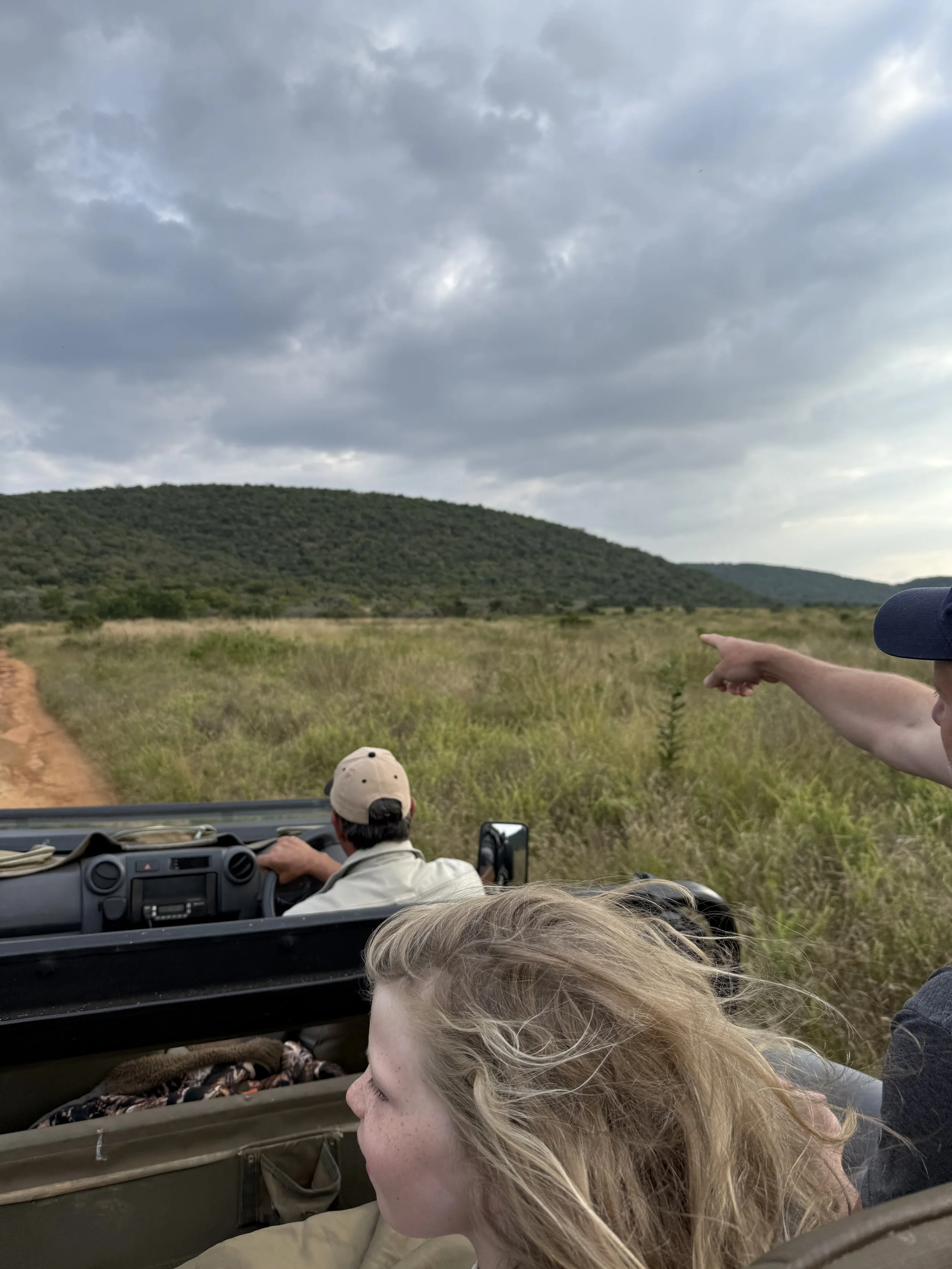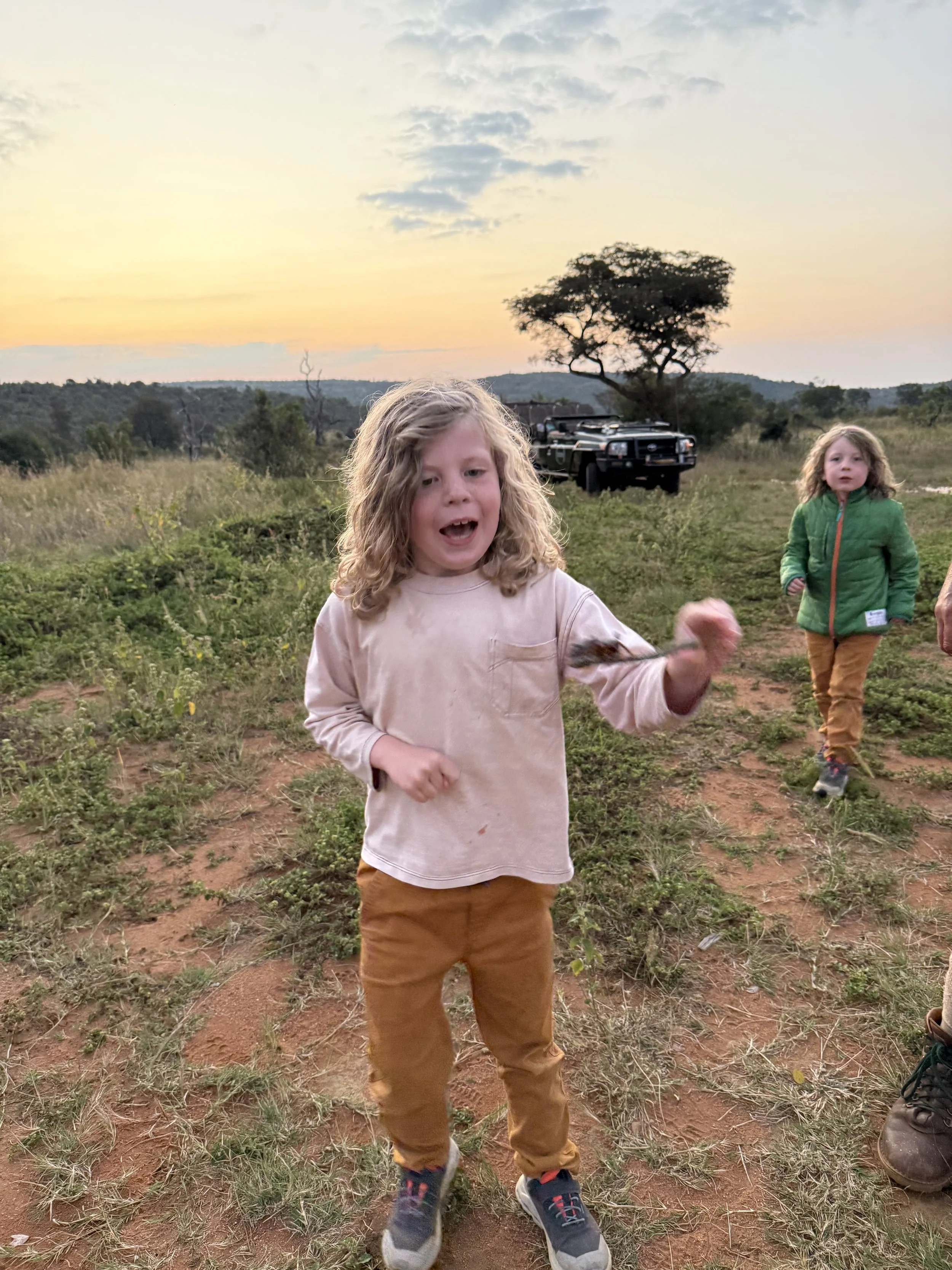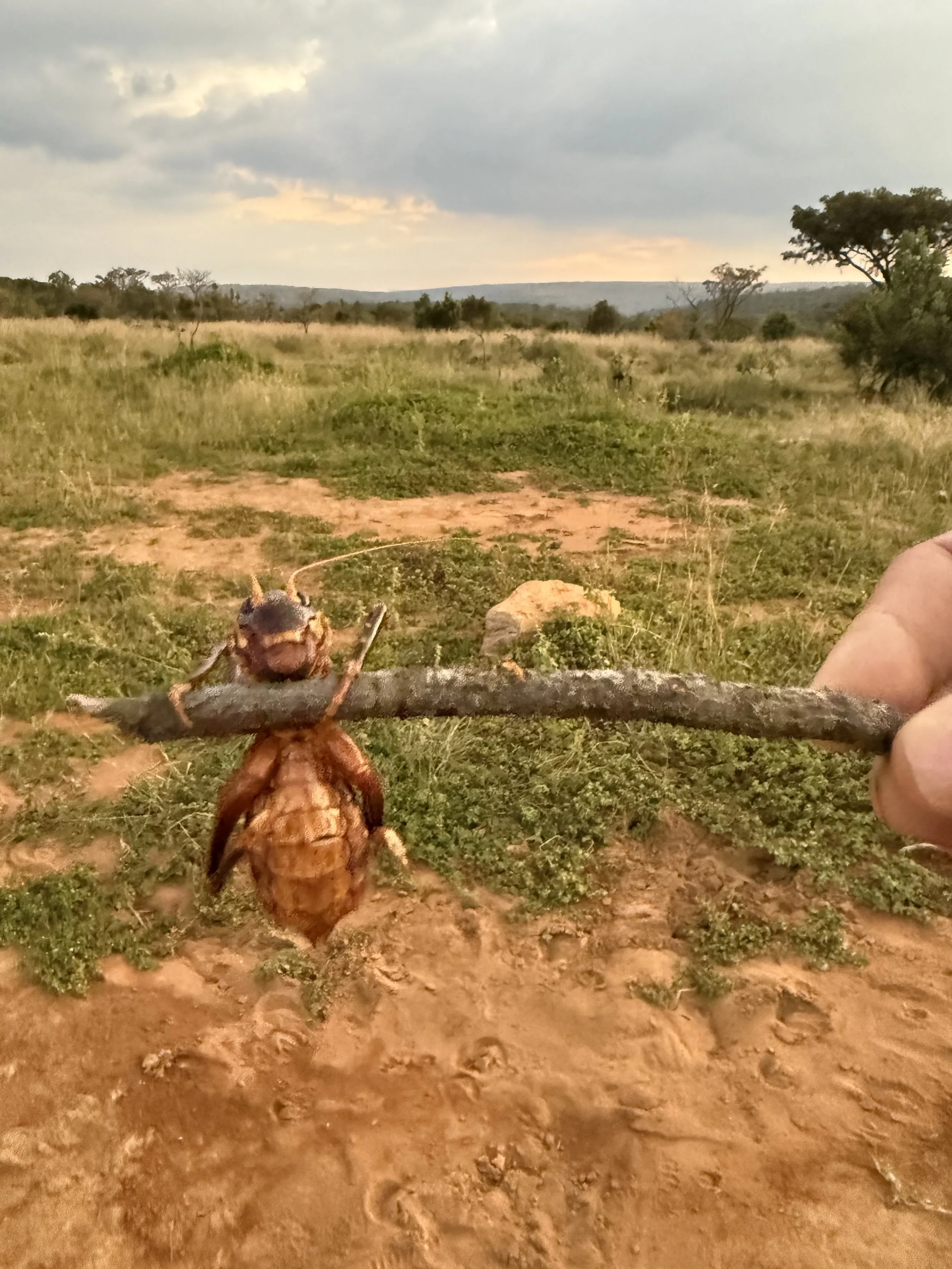 While having sundowners in a field, Joe walked away and came back with a giant bug. We thought we had seen big crickets before, but this one takes the cake. This was a Parktown prawn or African king cricket. Joe nudged it with a stick and it made a creepily loud hissing sound. The boys then took turns holding the prawn while it hung on the end of a stick. Kyle gave them each a jump scare when he screamed which then caused each boy to scream and throw the stick on the ground. We also had our big pokemon fight which felt anticlimactic after the multi-day build up. On the drive back to the lodge, we saw a spotted owl perched in a tree.