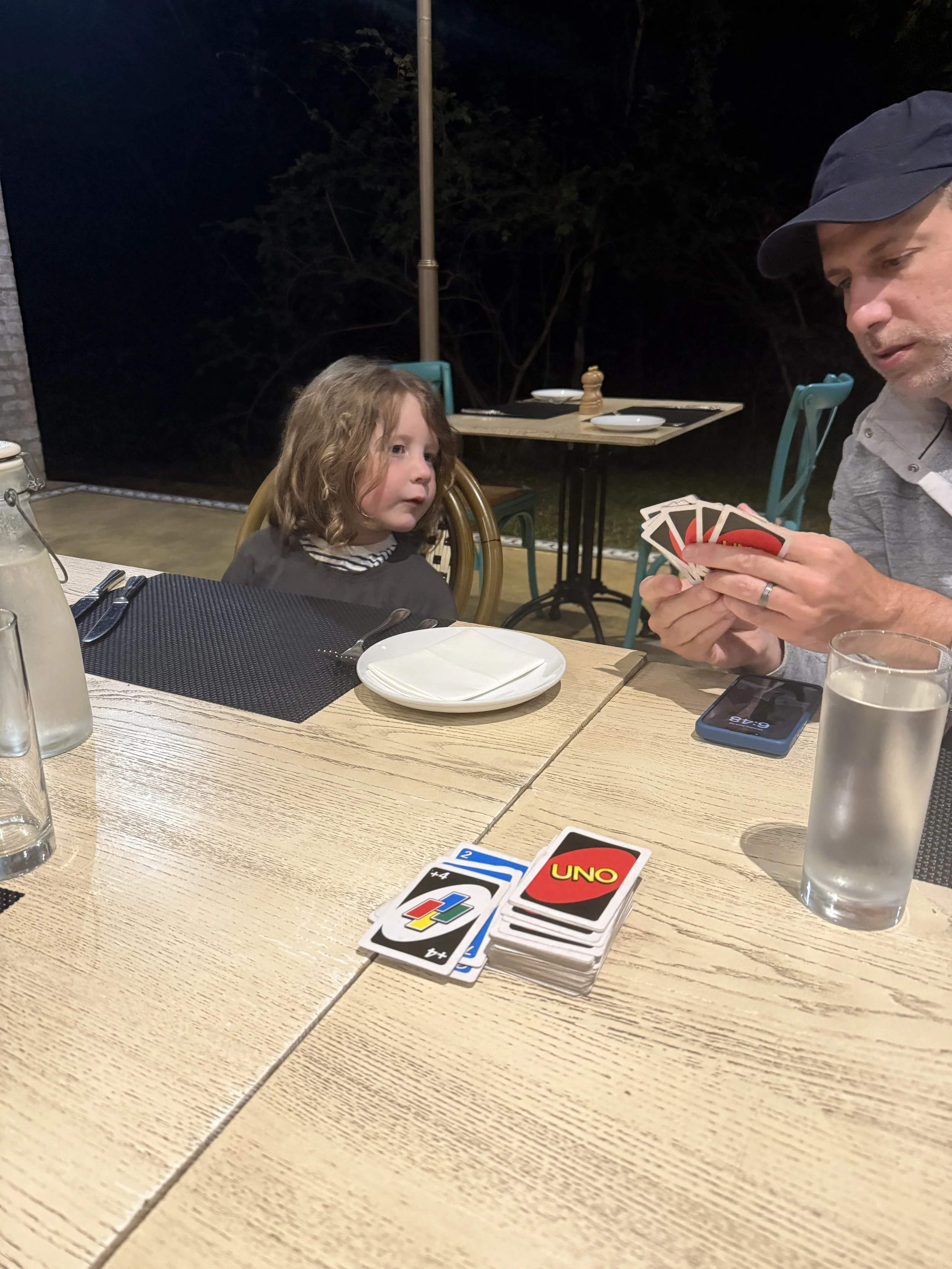 When we arrived at the hotel there was a bunch of mongoose rooming the grounds. Kayleen was relieved to know we were in a snake free zone with these guys on patrol! We relaxed in the hotel room until dinner. Everyone was tired from the travel day so dinner was a struggle and even Uno barely kept everyone sane. At the end of dinner a flying cricket landed on our table and gave us all a scare. We survived the meal and on the way back to the room saw a handful of frog/toads which caused some excitement.