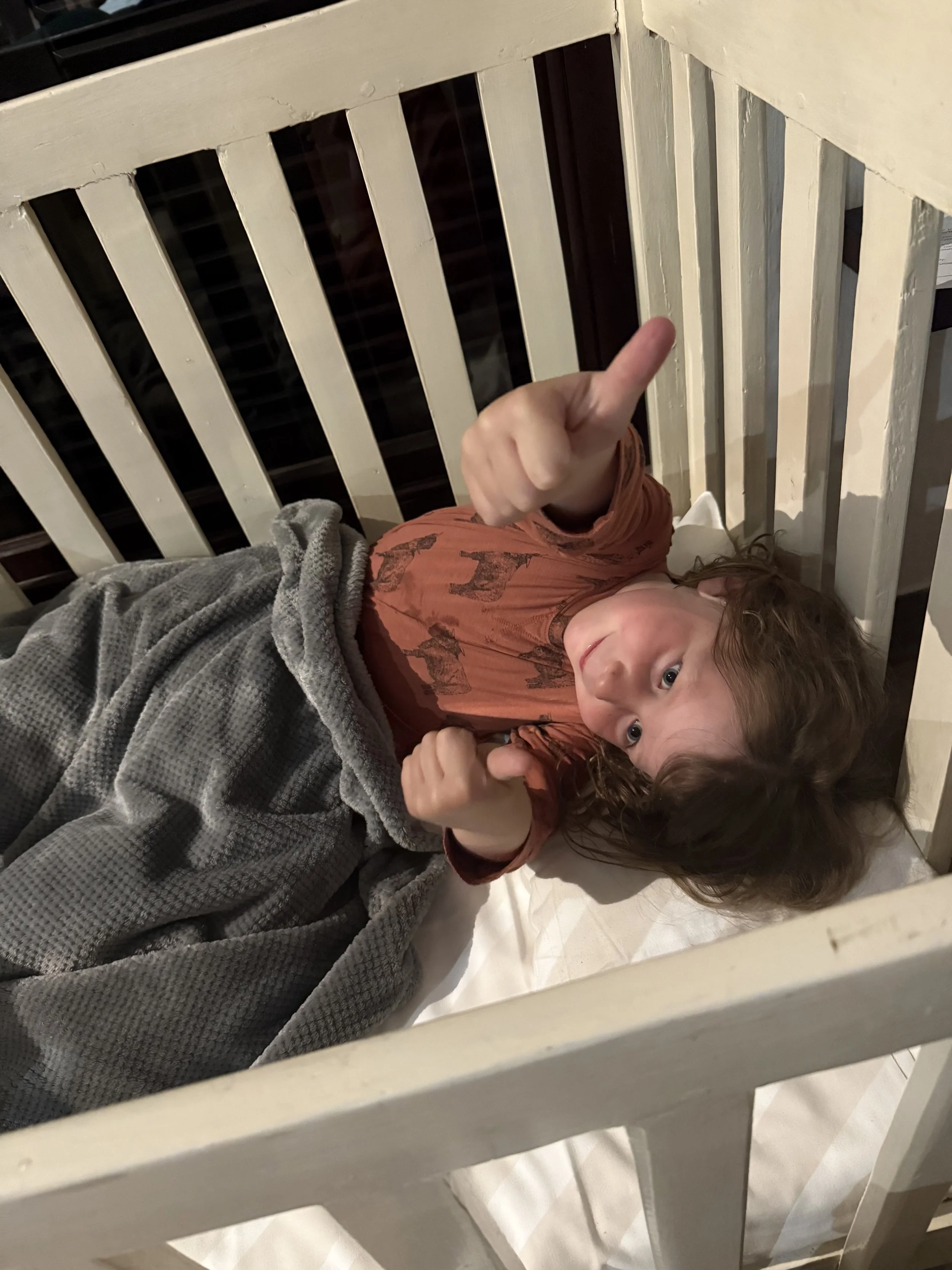 We are all in one room at this hotel stop. It is still nice but they squeezed a twin bed and a crib into the room with the normal king bed. Lenny was pleased to go into the crib but the thrill wore off after five minutes and he was in the king bed with us.