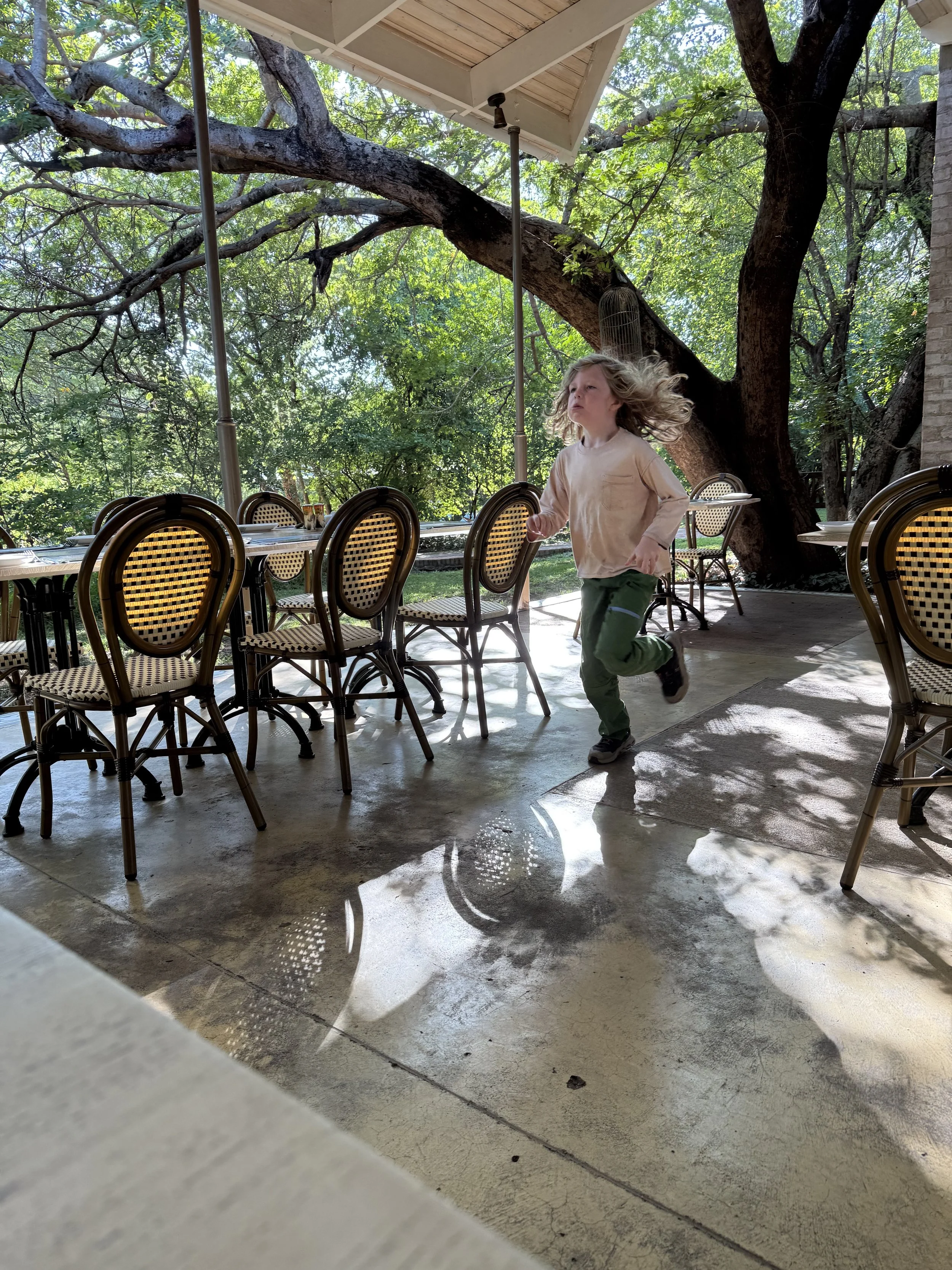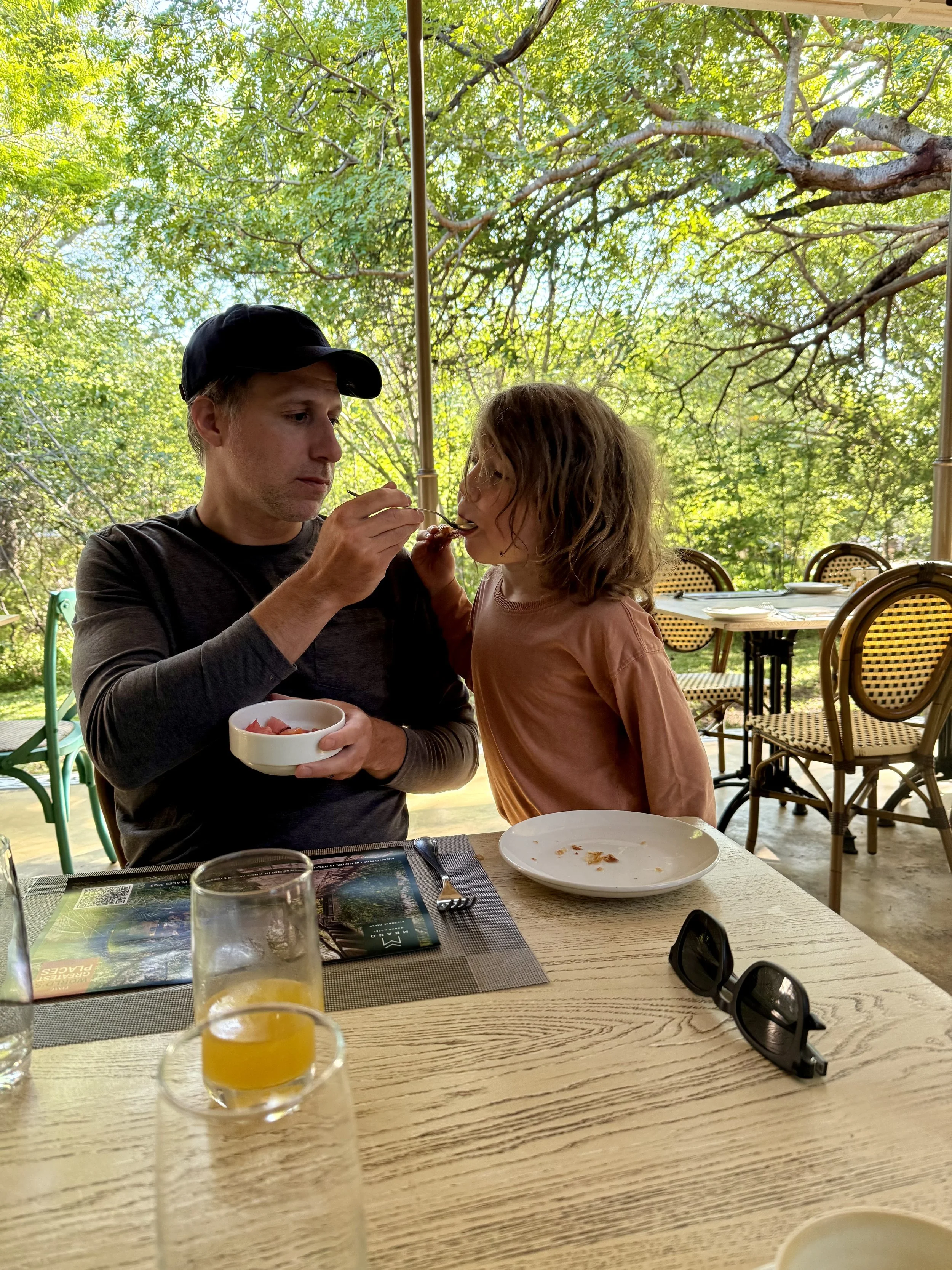 This morning, the boys still had pent up energy from the travel day and hours of sitting. Ollie took to doing wind sprints up and down the walkway while Len ran laps. When breakfast arrived, Len would stop after each lap to take a bite of an apple. On one of his laps, he found a “sleeping lizard” that he brought back to the table and placed it on the table in front of me like a cat delivering a dead mouse to its owner. I confirmed the lizard was dead and not sleeping and asked Len to please not touch animals again and also wash his hands.
