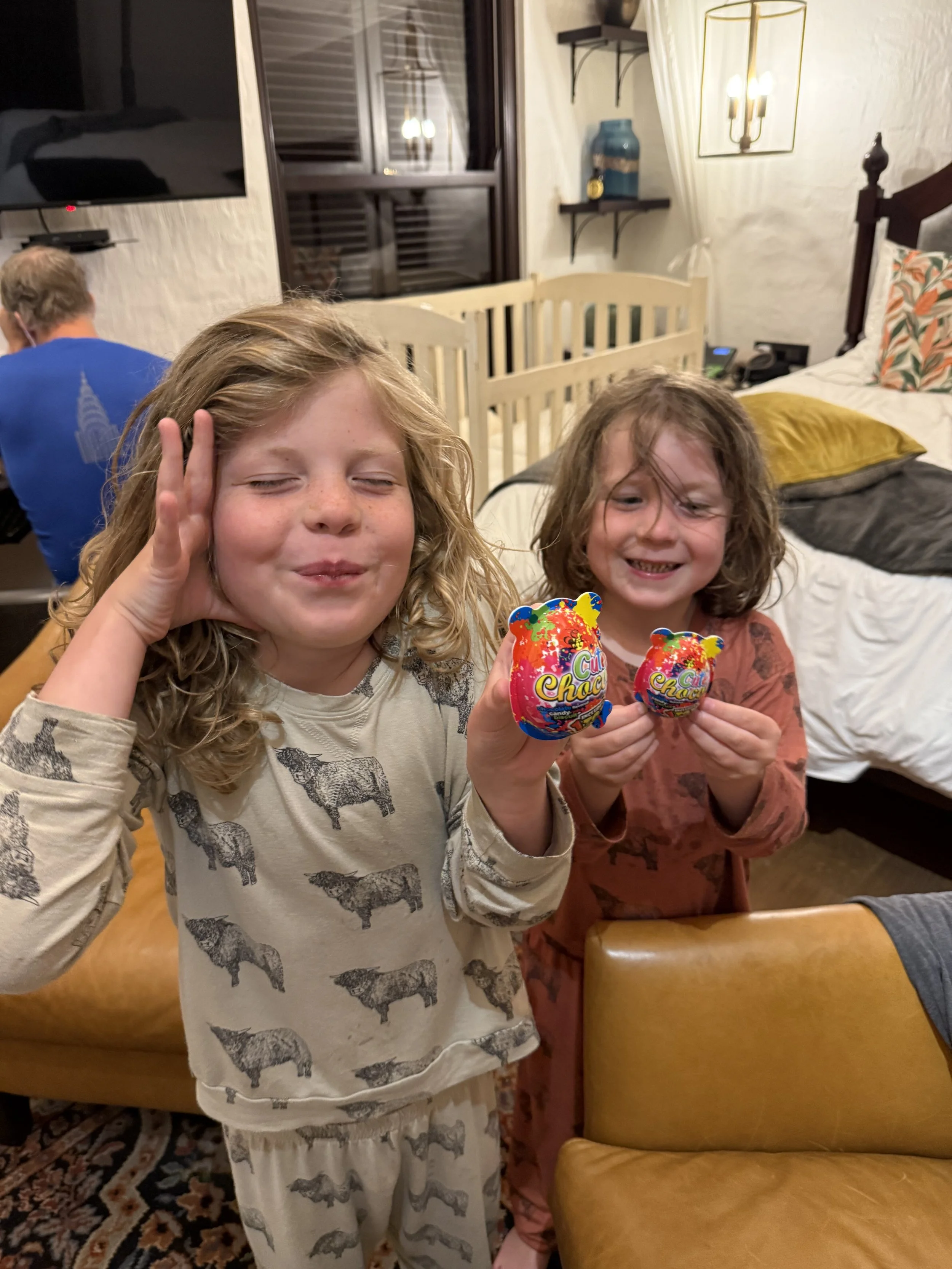 I bought knock off kinder eggs for the boys when I stopped for snacks earlier. Ollie got a small truck prize and Len a keychain. Ollie was the obvious winner, but tried to divert Lenny’s interest by saying, “Wow Len thats great, not many things have keychains”. Len didn’t buy it and soon starting pleading his case for sharing. Since the only toys we brought with us are the iPads, we’ve found the jealousy and competition over these small prizes has been amplified.