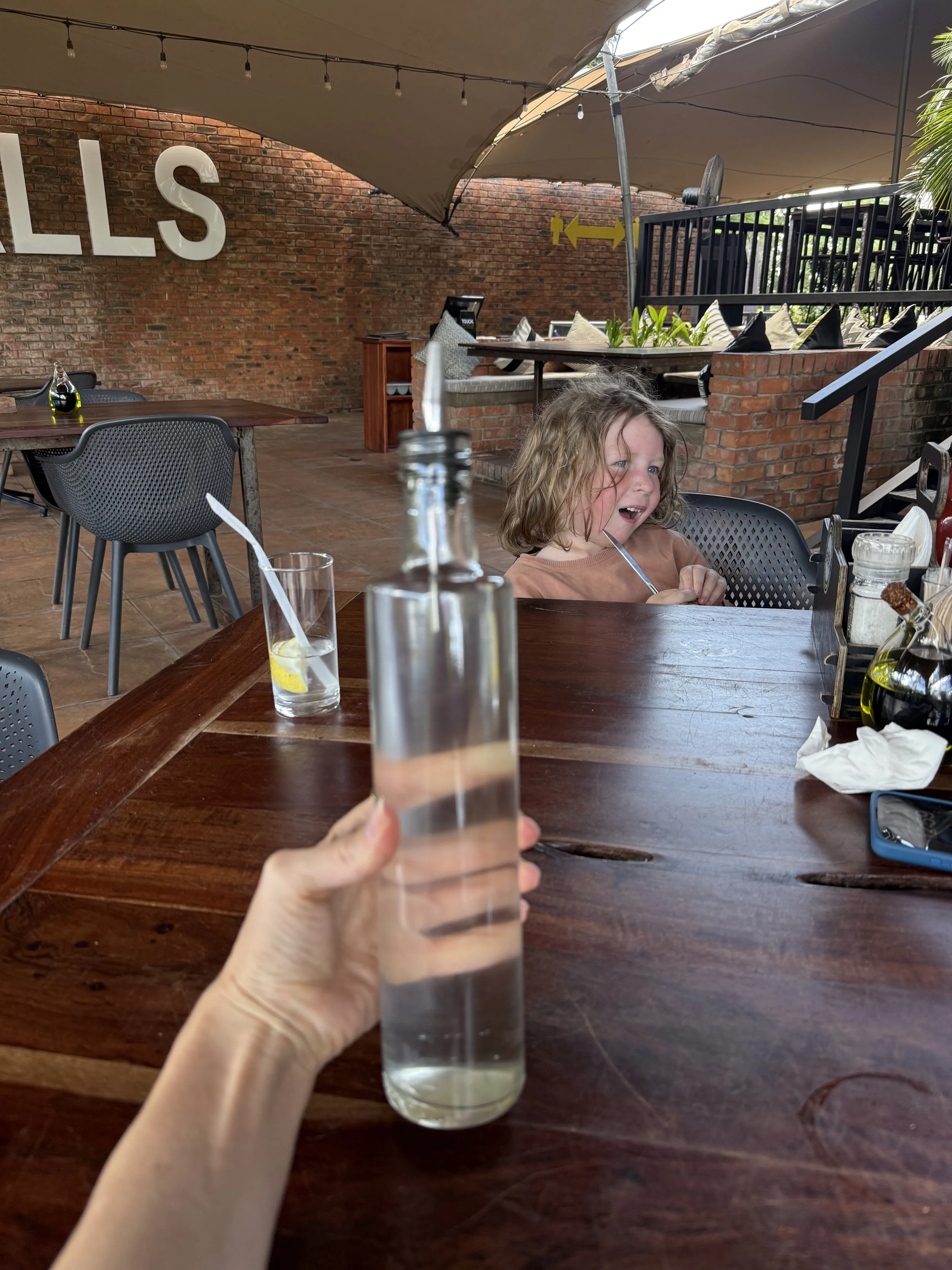 There was a tall bottle on the table with a skinny spout filled with clear liquid, like what is normally filled with olive oil back in the states. We debated what was in it and eventually landed on either vinegar or simple syrup. Doing a smell test we thought would revel the answer. I tried to smell it but don’t have a good sense of smell. Lenny wanted to go next so I held the bottle out and he tried but didn’t give us any good answers. Ollie then wanted a turn so I held it out for him. He must have been determined to get the answer because he put his nose so close to the spout when he took a whiff I saw bubbles in the bottle. When I looked up at him I realized he had sucked some up his nose. We quickly tasted it and confirmed it was vinegar.