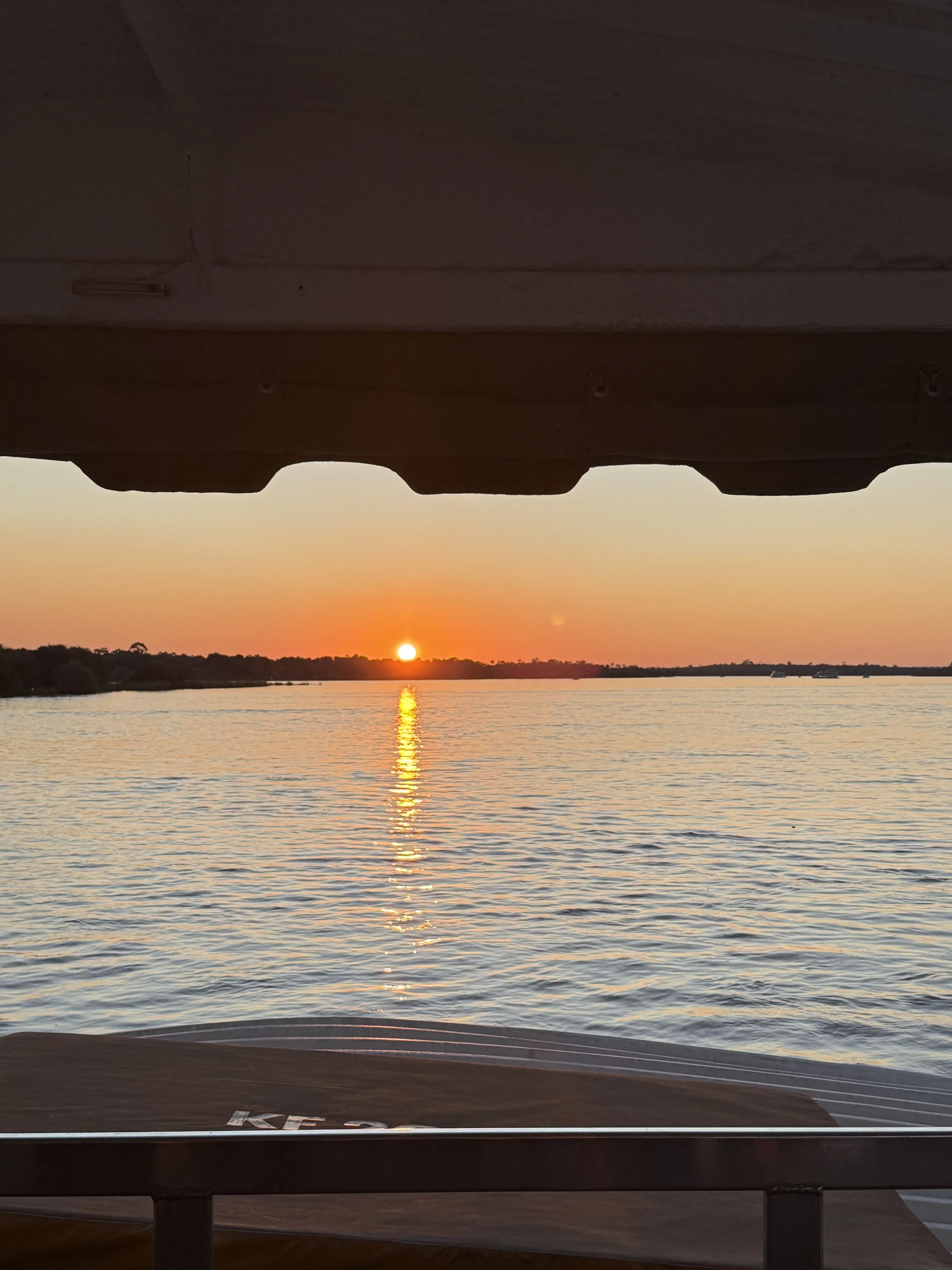The boys were after snacks before our next adventure. Kayleen offer a pear to which Ollie responded “a pair of what? Chips?”. Lenny took the pear and Ollie took nothing. We headed out just before 4PM to get to our sunset cruise on the Mighty Zambezi River. On the bus ride there Ollie was keen to talk about how we could grow pumpkins in our backyard in Hoboken in a hanging planter. We all discussed how we needed to make them a hammock so they did not fall off when they got heavy hanging in the air. Also how we would stop the squirrels from eating them. Ollie suggested putting rat snap traps all over the tree while Lenny wanted to get a robot to monitor and defend the pumpkins.
