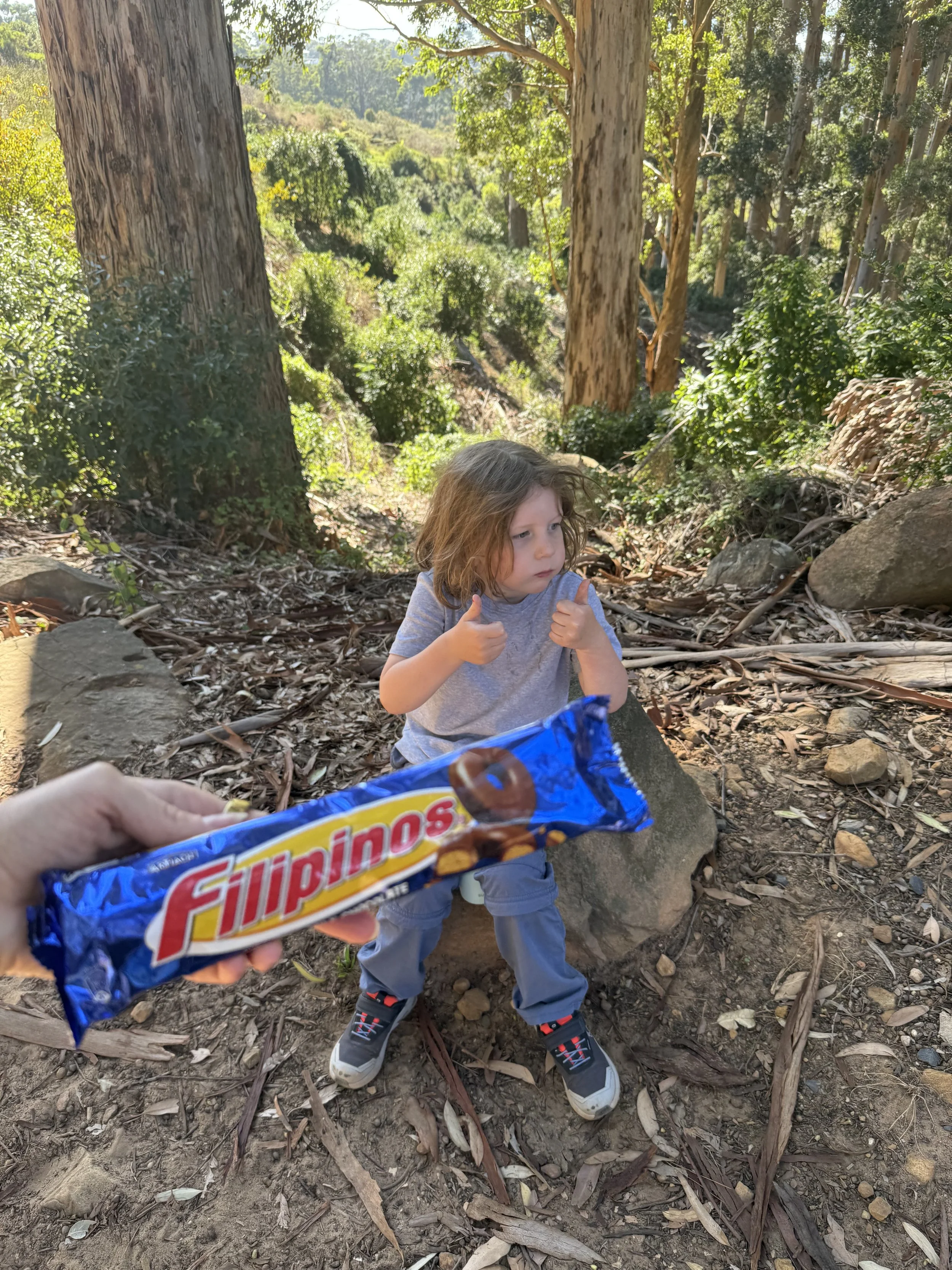 The power boosts for this hike was Filipinos, a ring shaped cookie dipped in chocolate, which Kayleen linked to a favorite movie of the boys, Sonic the Hedgehog.