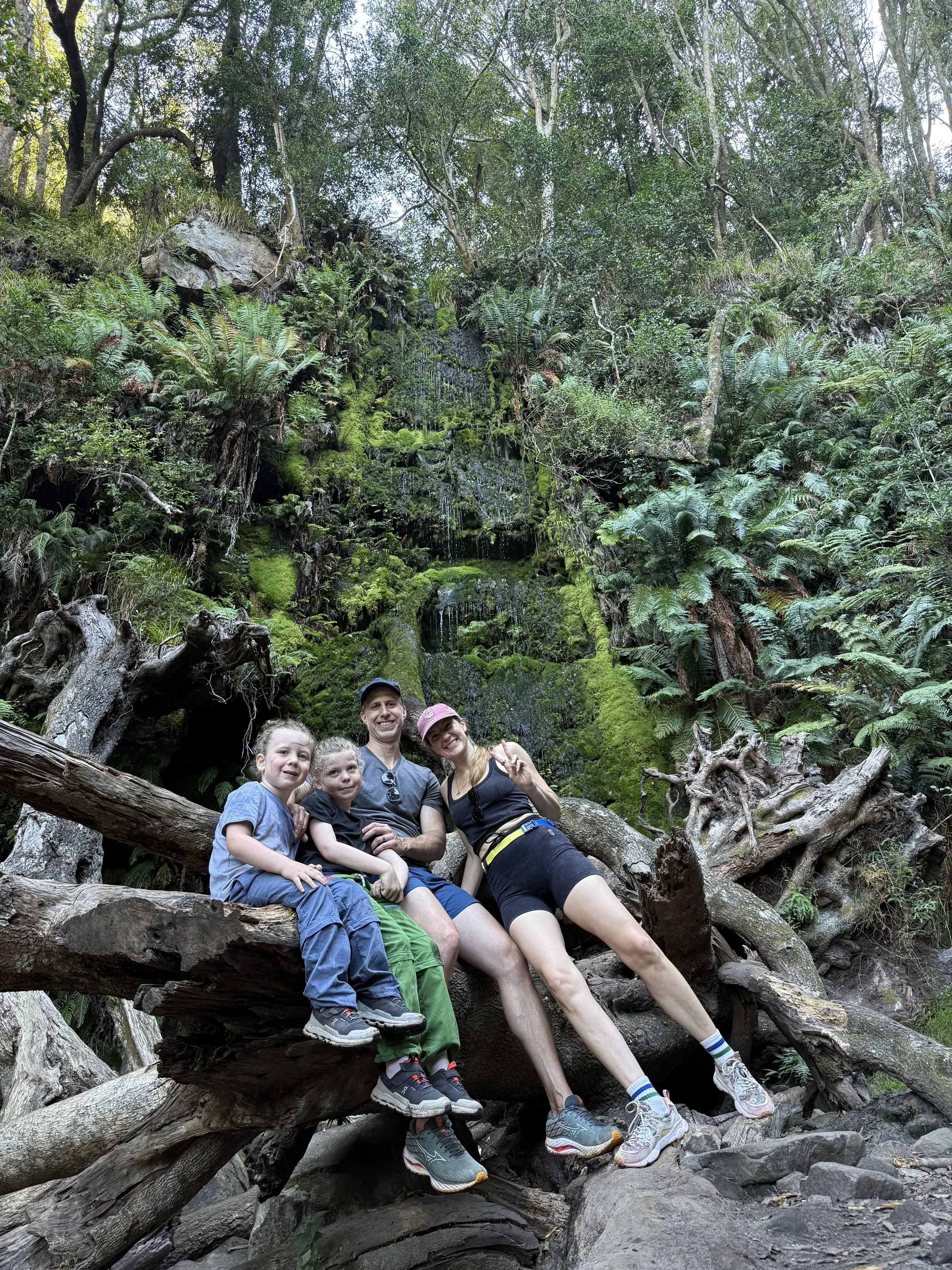 We made it to the waterfall! As soon we got near the running water it felt 10 degrees cooler. We took our time there to take photos, have snacks, climb on the large fallen tree, and let the boys dip their heads in the refreshing water.