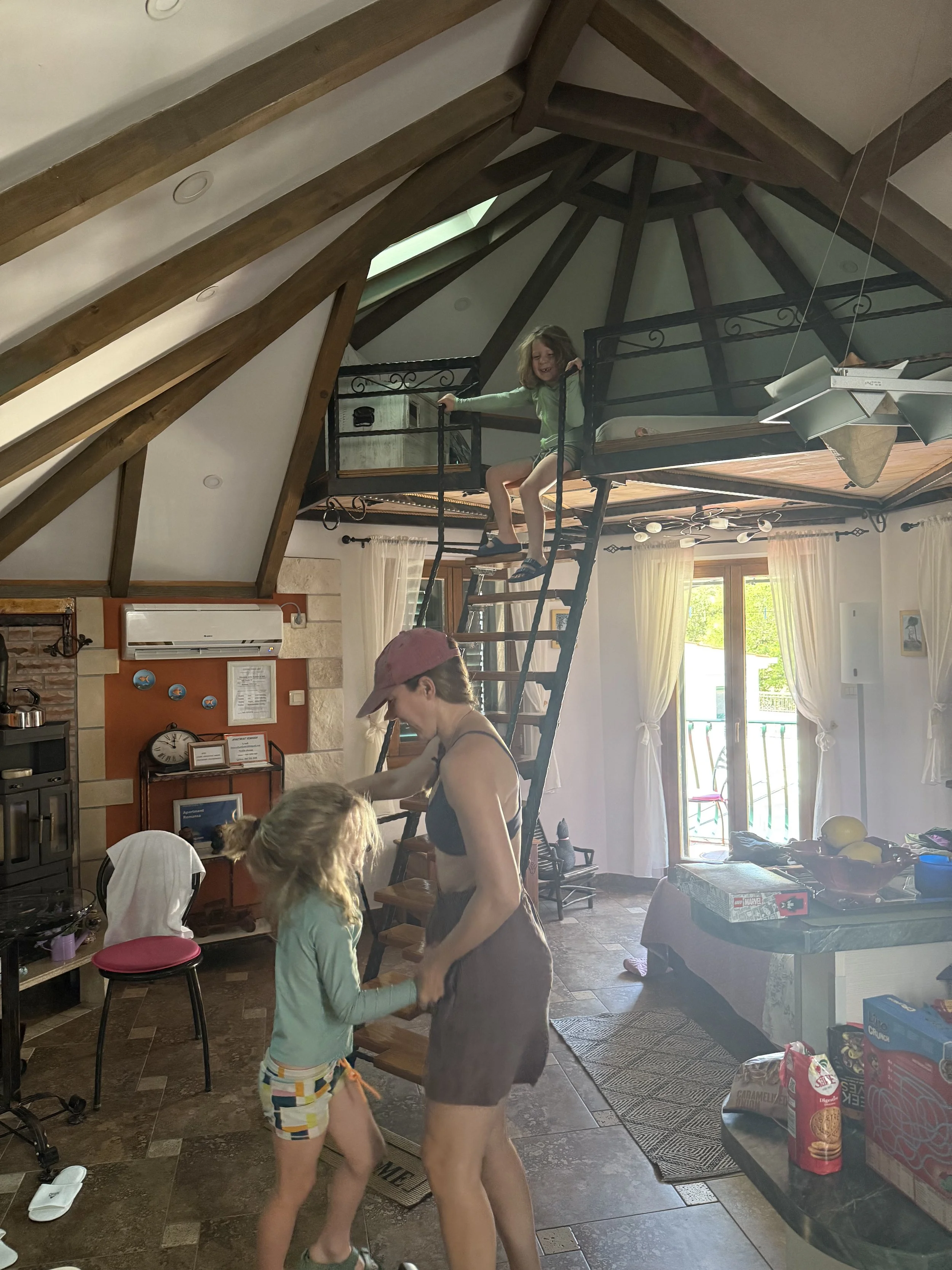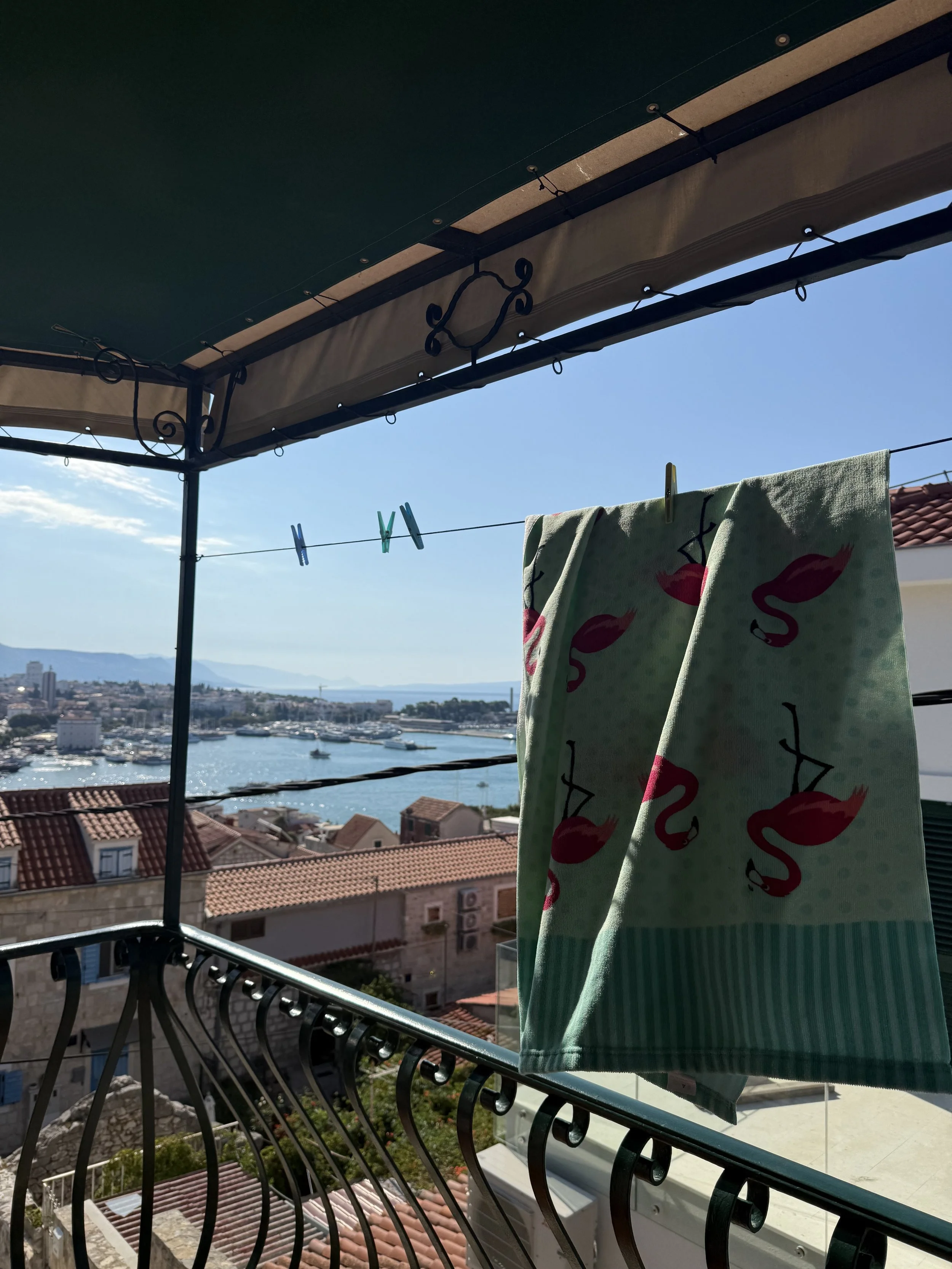 After dinner and more convenience store ice cream for dessert, the boys watched a bit more Iron Man 2 while I hung up some laundry. We’re grateful to have a line to hang the laundry here as the 2 in 1 or exhaustless dryers we’ve encountered in Europe kind of stink and leave a faint musty smell on our clothes. The view while hanging clothes is also incredible— definitely my favorite chore!