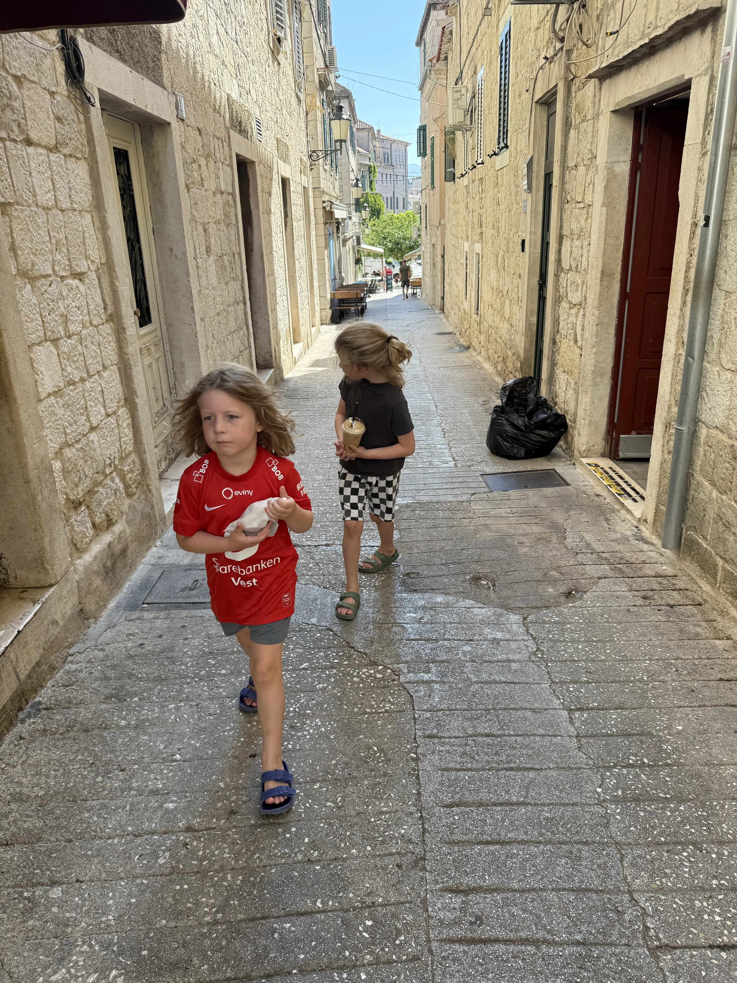I took the boys out on an early morning walk today to give Kyle some peace and time to catch up on a few blog posts. We walked another Pokémon route by the water and traded gifts with someone from China. Our walk ended at the coffee shop, Tinel, and we picked up coffees for Kyle and I and Dalmatinski rafioli (traditional ravioli shaped Croatian cookies) for the boys. Ollie scarfed his cookie but after one bite Len proclaimed, “Not for me!” and instead brought the cookie home for Kyle. Our morning coffee runs have been vital because the only coffee available at our apartment and even at the stores is instant. We’ve tried a handful of brands at this point but have struggled to get used to it— Nescafe tastes like hot chocolate and the local brand tastes like dirt to us (sorry!).