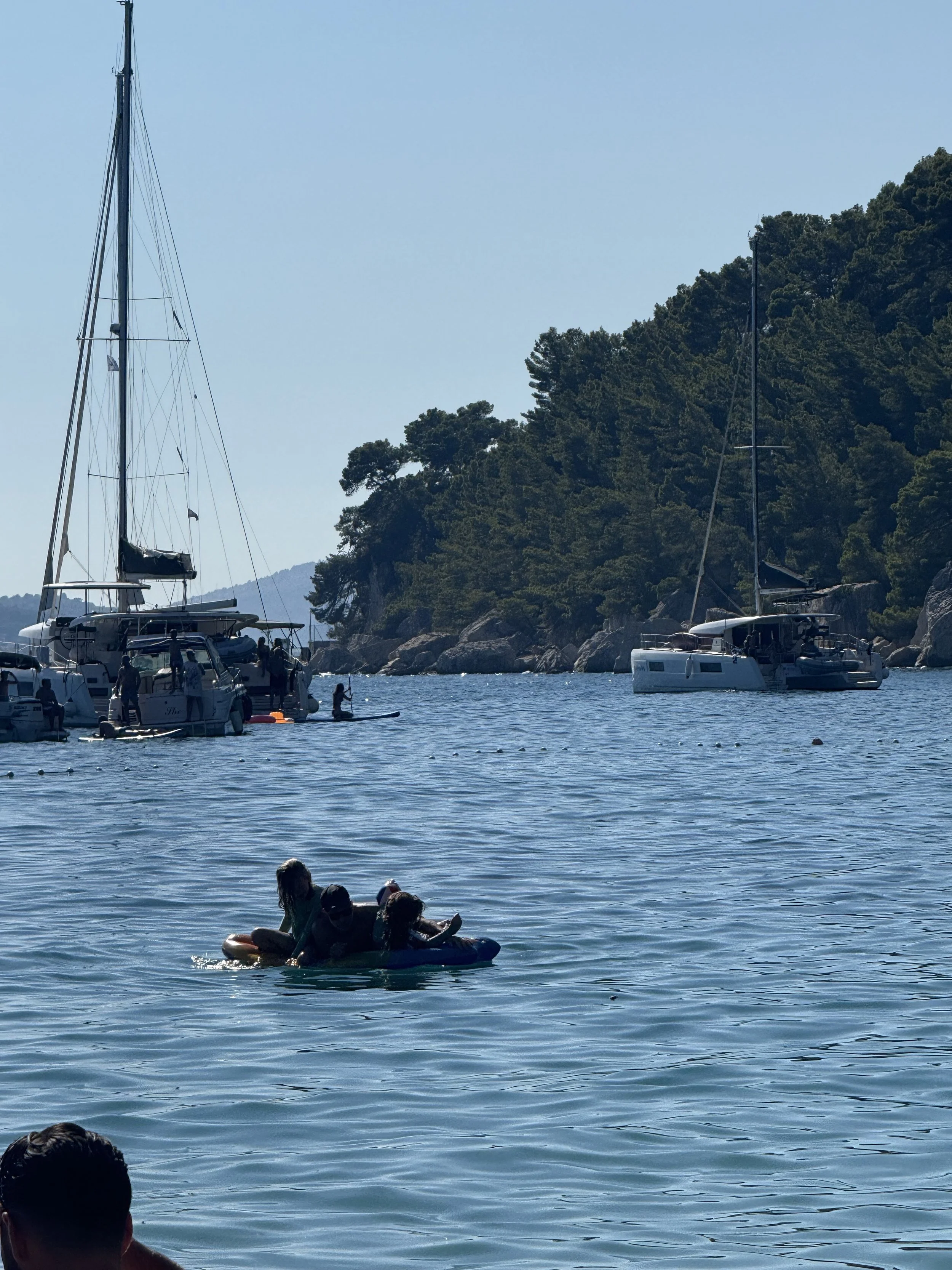 Kasjuni beach is much longer than the small pebble beach we visited a few days ago with a few beach clubs nearby for food and cabana rentals. However, it was extremely crowded and narrow with nearly zero spots left when we arrived. Kyle raced to rent a cabana but the guy ahead of him booked the last one. We instead rented one of the last chairs available so we’d have somewhere to leave our stuff and benefit from the bit of shade a nearby umbrella provided. We grabbed an inflatable raft and swimmies for Len yesterday in town and both massively improved the fun factor for the day. Len is a much stronger swimmer now than he was at the beginning of the trip but still needs support when swimming for more than a few minutes.