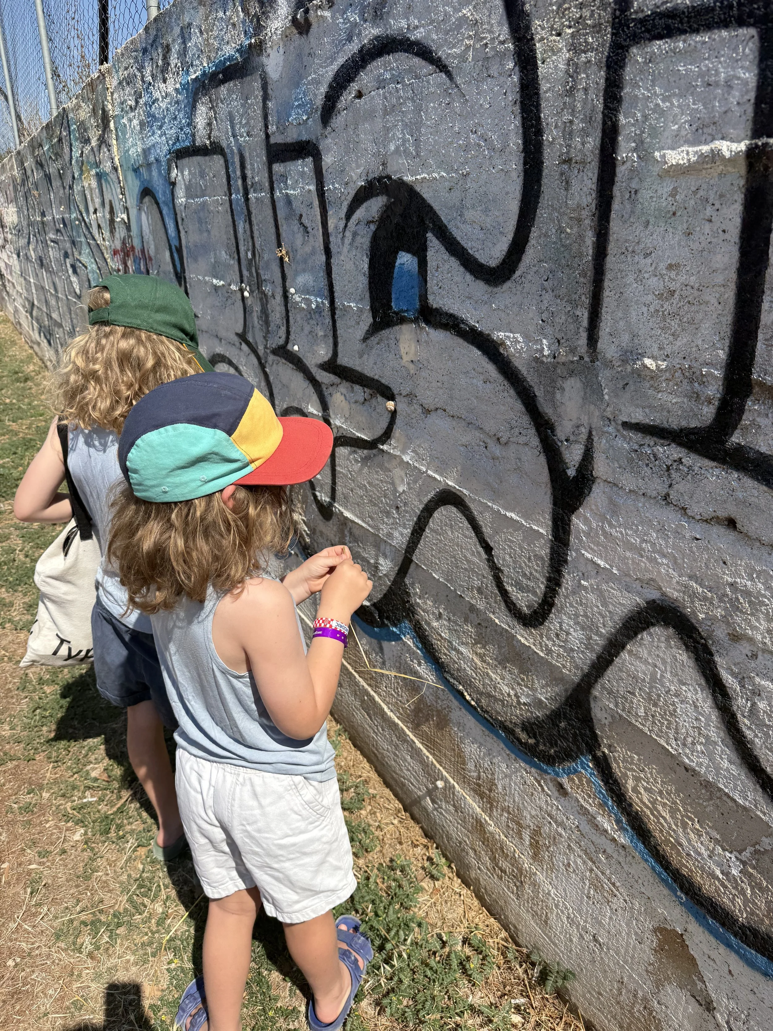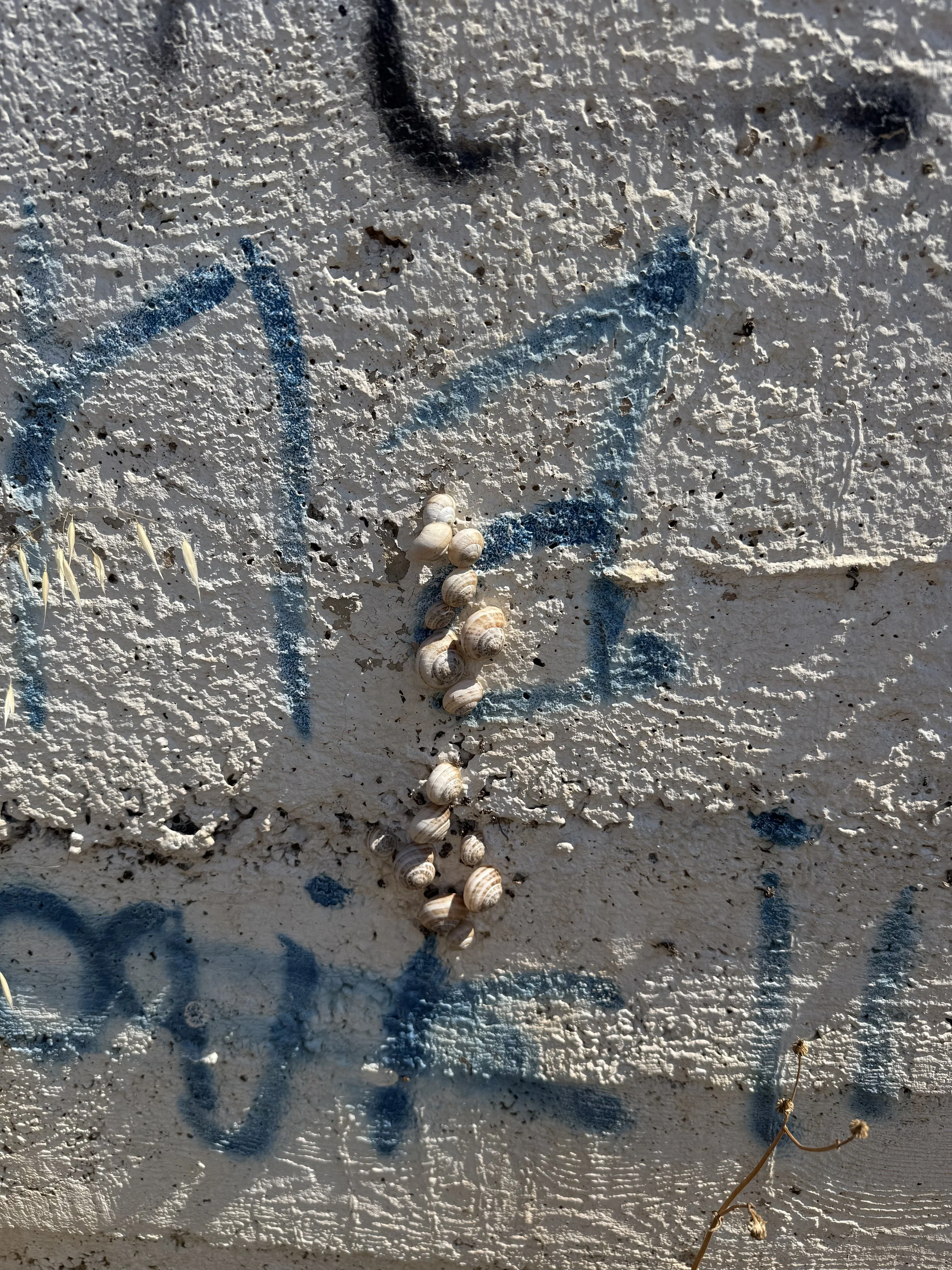 I meet Kayleen and the boys at breakfast “feeding time” before we parted ways again. She walked with them to the shop in town to grab more snacks/groceries and sunscreen while I went to retrieve the laundry and put it to dry on our porch. Kayleen and the boys found a wall covered in snails on their trip which they could not help but investigate in detail.