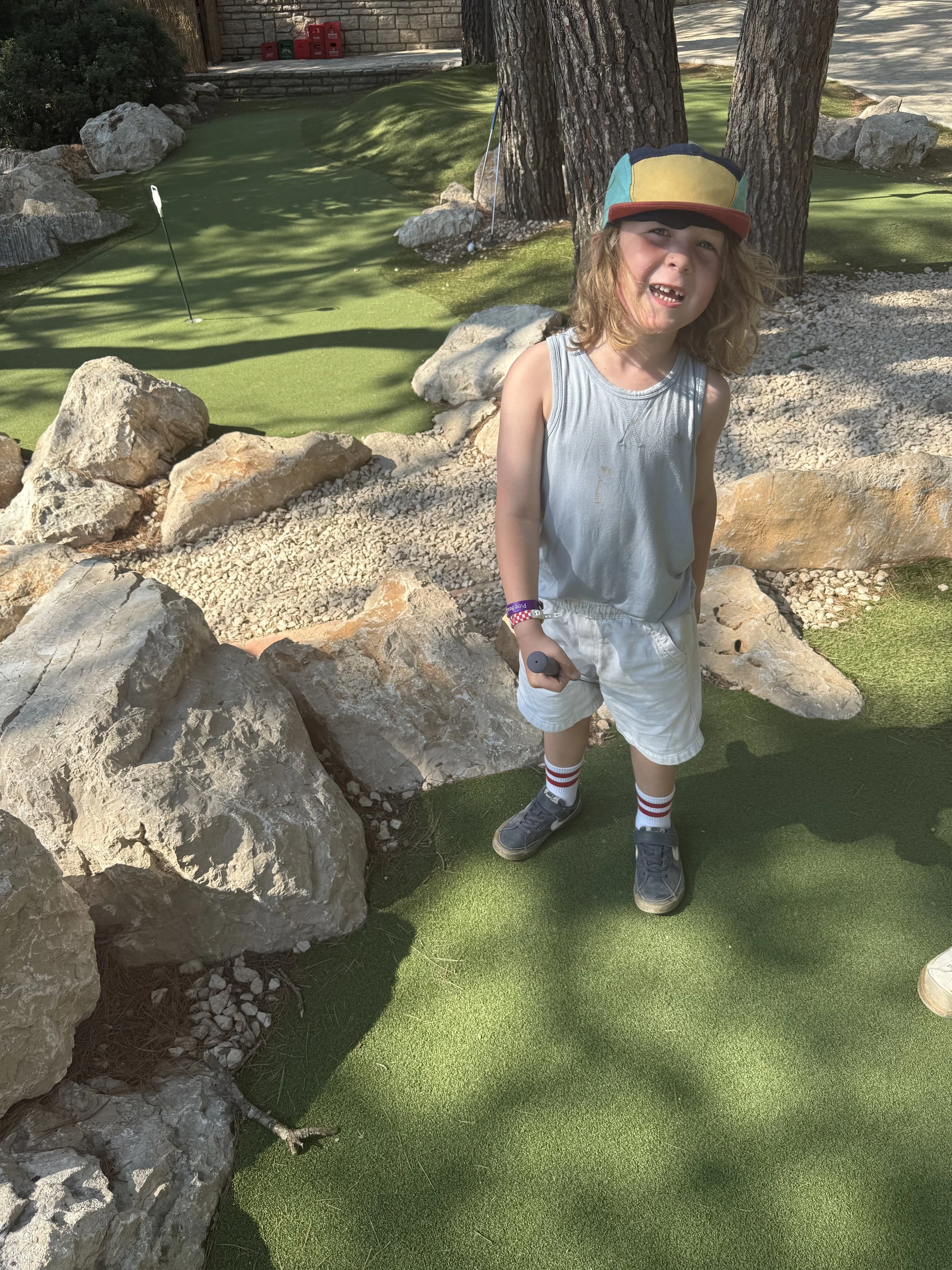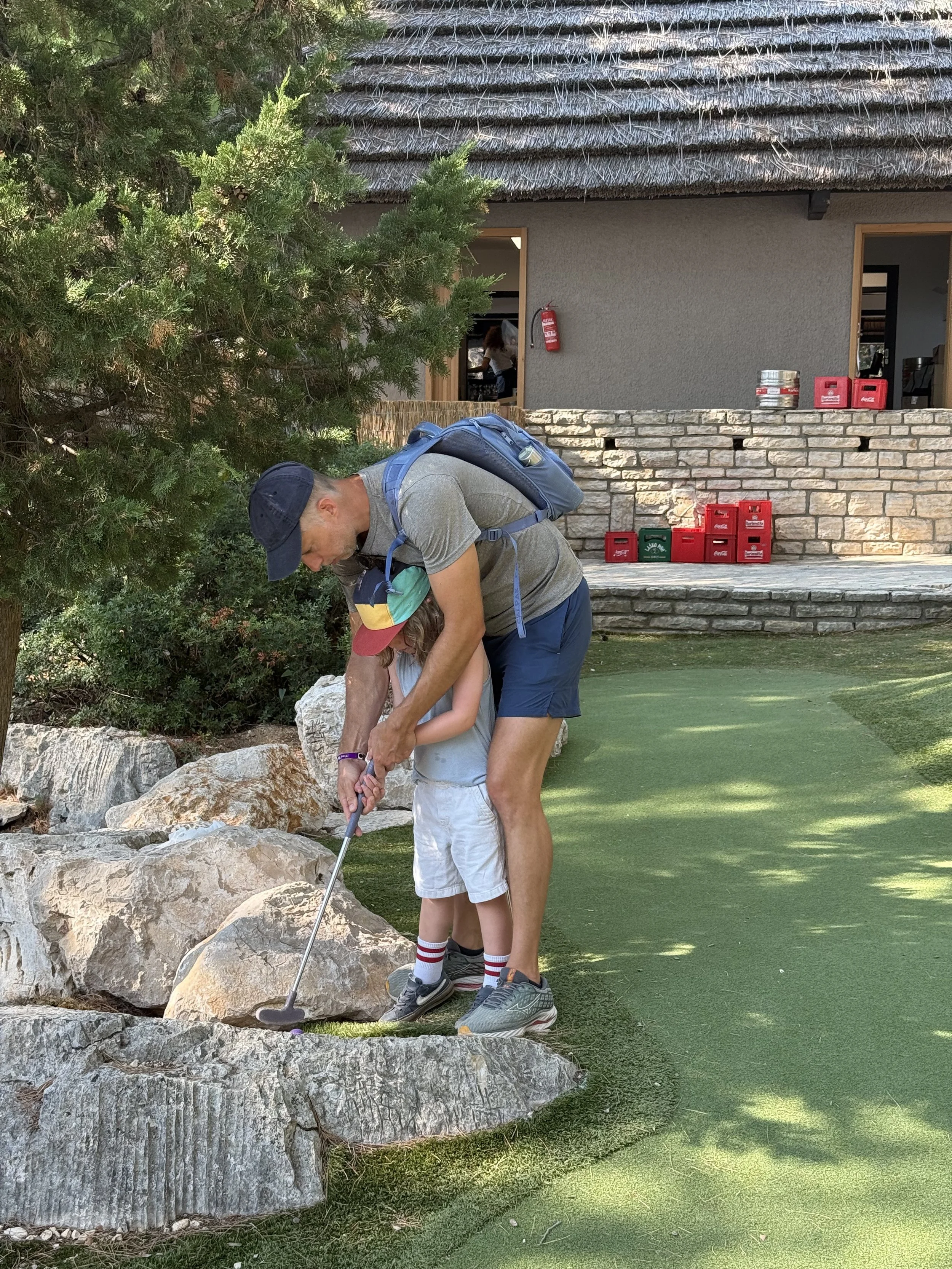 We headed to our 4PM archery activity on the other side of the resort but upon arriving realized it was actually for 5:45PM which wasn’t going to work since we wanted to go to dinner early in town. Instead, we convinced the boys to do the 9 holes of mini-golf. It was hot and there was not a ton of patience for taking advice, Lenny was more willing than Ollie. Though Lenny was also happy to ride his putter like Happy Gilmore.