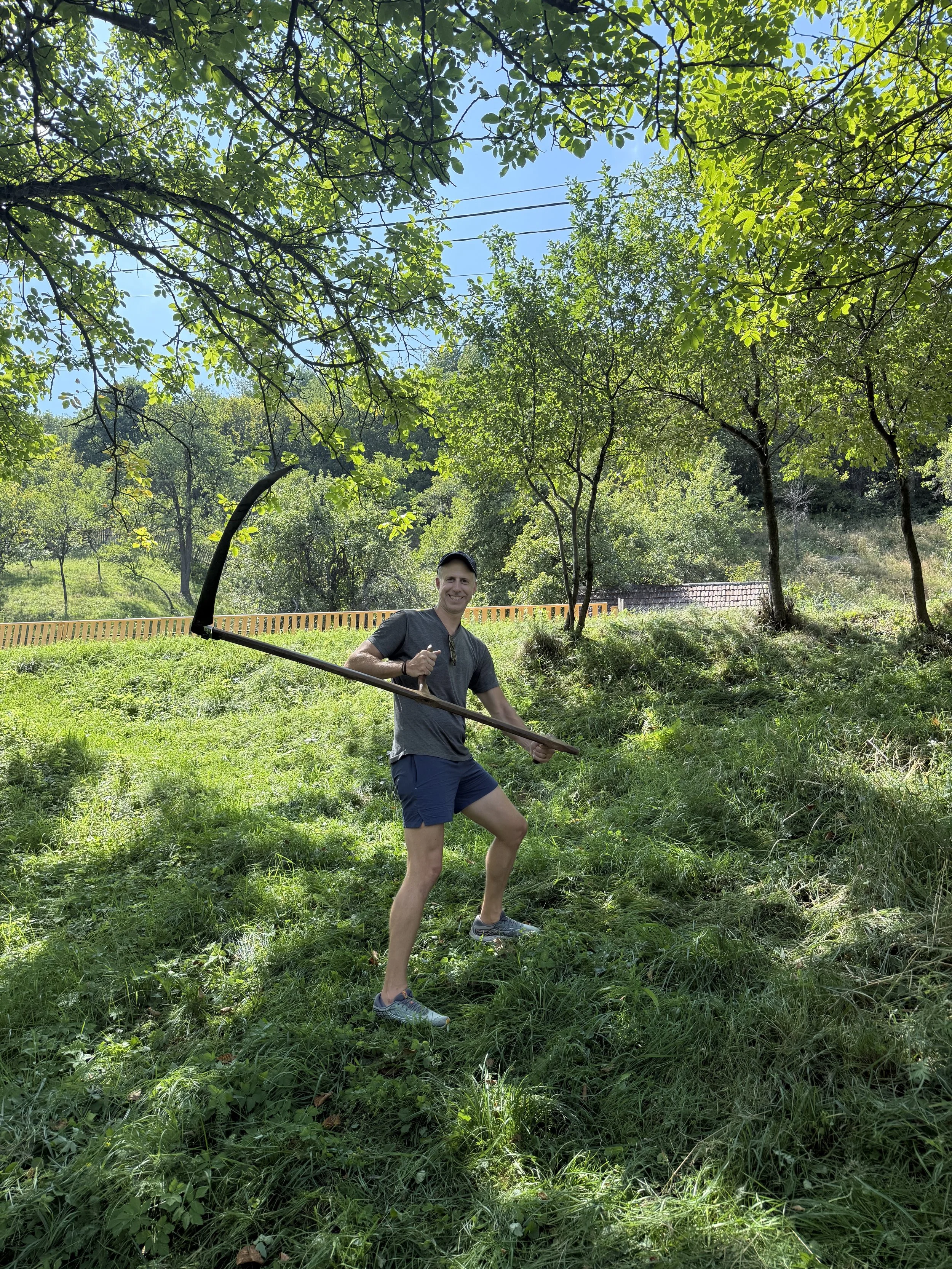 After the moonshine and all the food, I was ready for a nap. Just after I found a nice spot on the grass to lay down with a blanket Mihai’s brother arrived to pick up Tudor and Francesca and begin their drive to the Black Sea. We chatted for a bit before they left and once gone Mihai decided we should bring out the scythe. They have a lawn mower now but this was the old way to cut the grass in their yard, if the goats did not eat it. It was fun to use and surprisingly light, I’m sure by design as you would need to swing it a thousand time to cut any meaningful patch of grass.