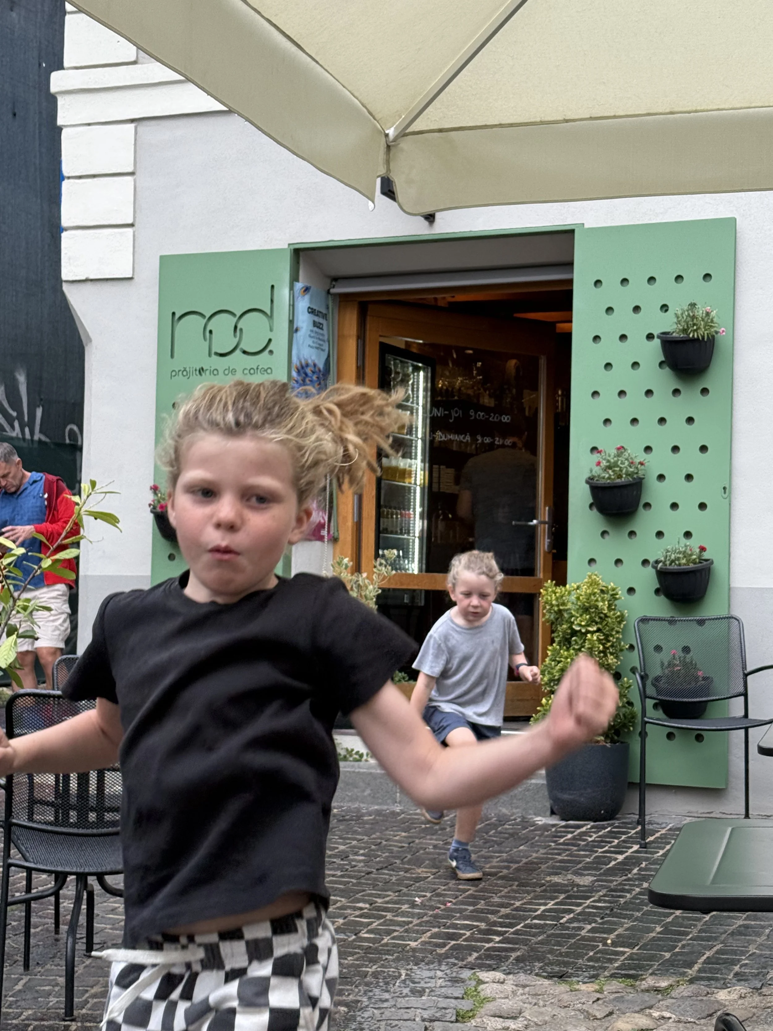 Checking another restaurant on the other side of the fortress we were finally told that everything was closed on Mondays. It made more sense why the one restaurant was out of food last night now! We ended up at the same tiny convenience store that Mihai and I got a beer at last night but this time for a coffee. The three of us sat at the same picnic table as last night and I noticed a pair of sunglasses hanging from the underside of the umbrella. After pointing them out to the group, and commenting on how weird of a place to put sunglasses, Mihai exclaimed that those were Gabby’s! Our morning walk had a purpose beside subpar coffee. We returned home to find the kids entertained with Gustos, Romanian corn puffs. They were sticking them together to make different figures and bridges and Gabby had cooked a nice breakfast for everyone.