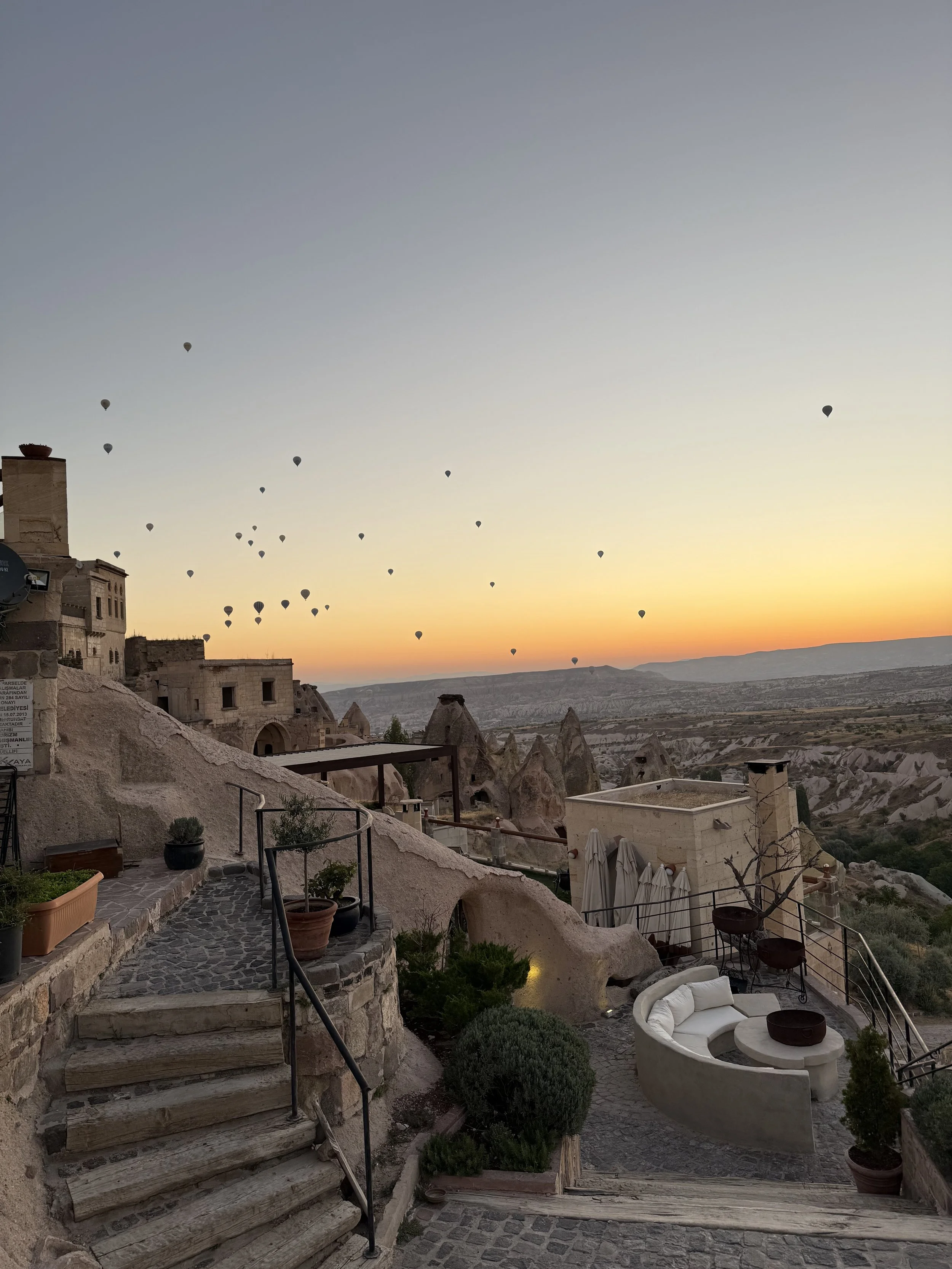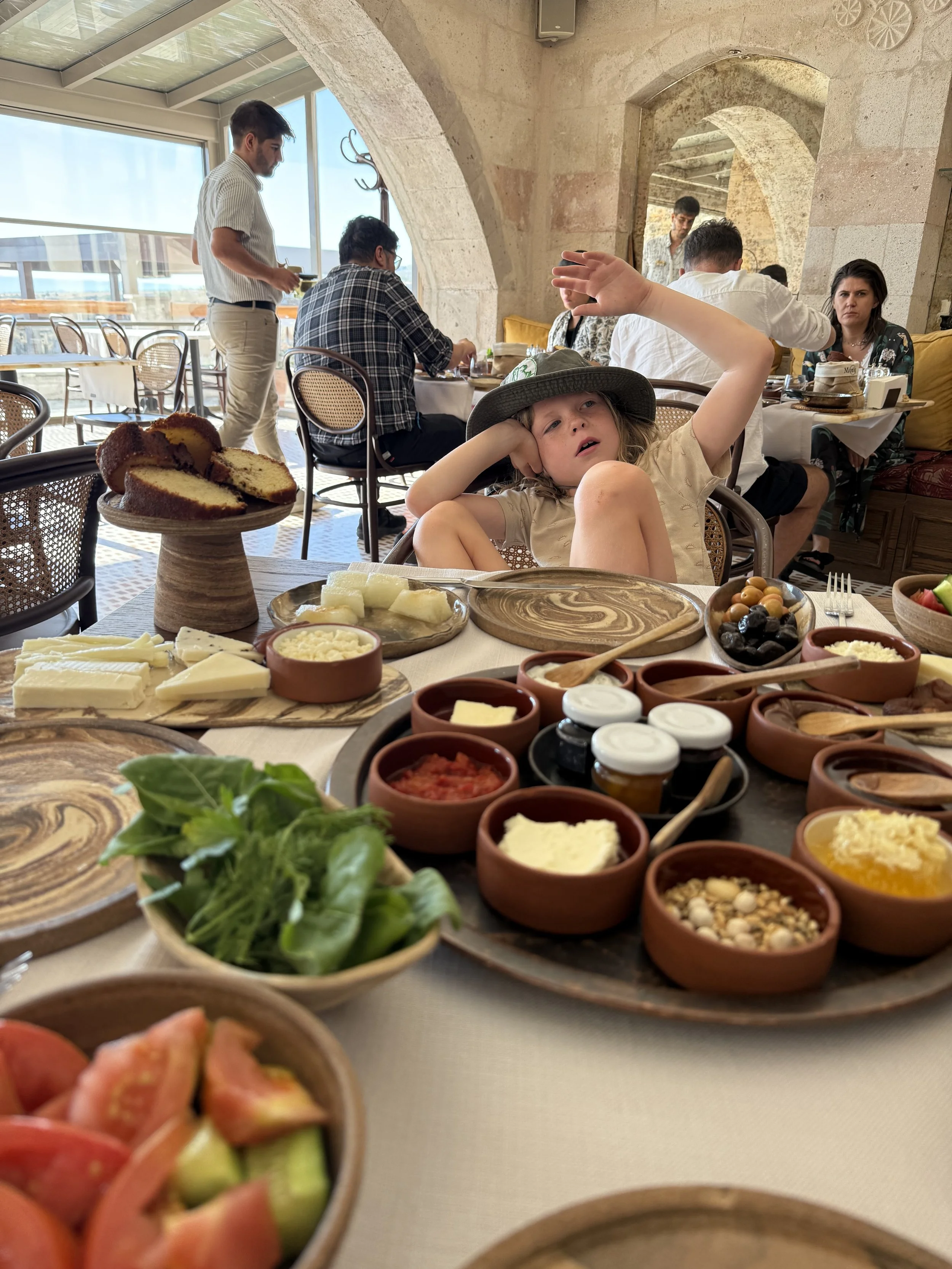 I was up early today to check out the balloons taking off from our hotel. The view was OK but the angle from hotel did not let me see them all lighting up on the ground, only once they were airborne. I stayed watching them until the sun came up over the mountains and then headed back to the room to do some life admin and blog posts. Everyone else woke up slowly and we headed to another massive Turkish breakfast spread before our 9AM tour departure.