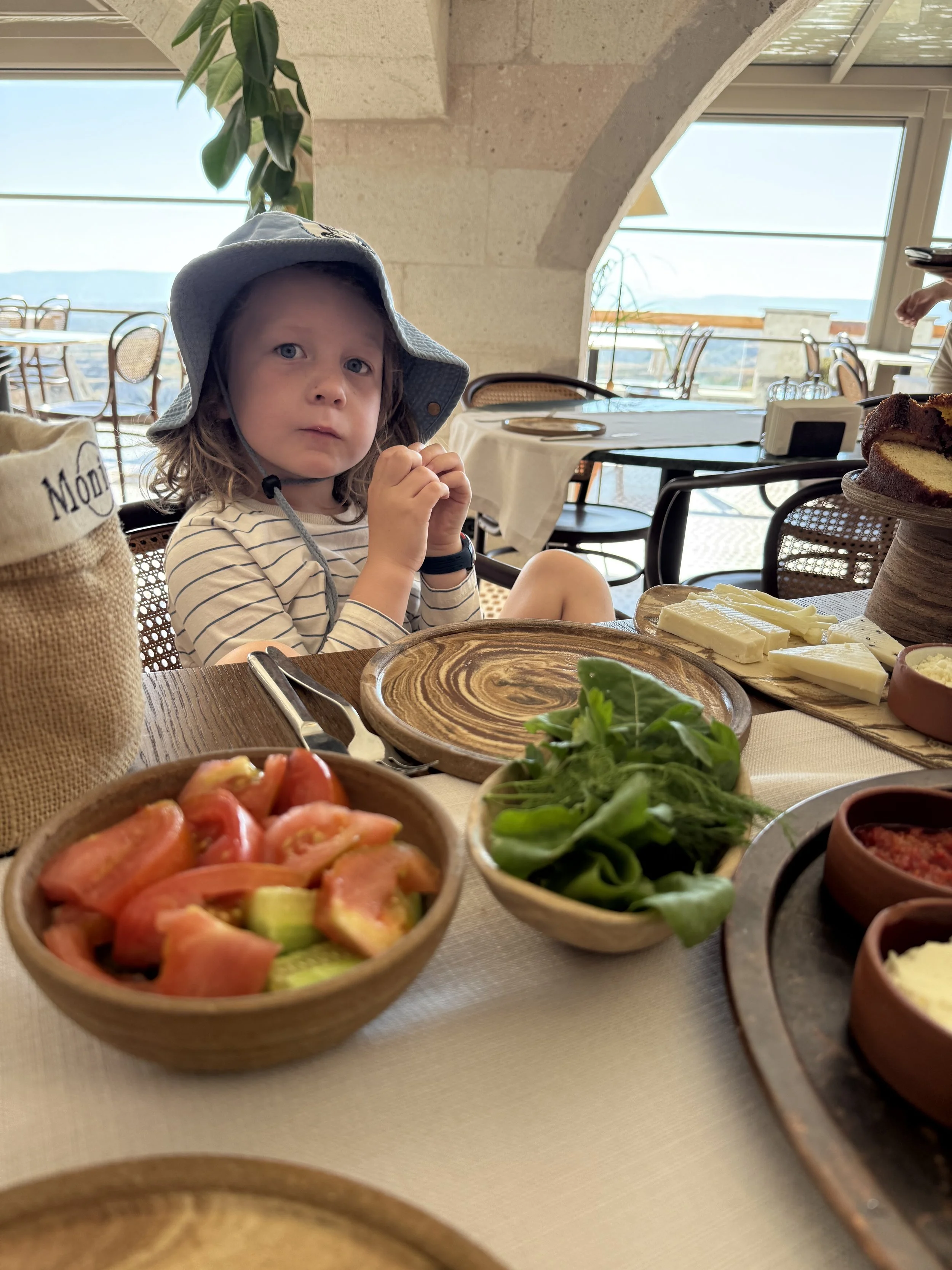 After that we stopped at a variety of places including Devrent Valley (also known as Imaginary Valley), Göreme Open Air Museum, Nevşehir Zelve-Paşabağları Archaeological Site "Priests Valley", a gem/jewelry store, a viewpoint, and a Turkish snack shop to sample and buy different snacks. The gem/jewelry store we could have passed on as it was really just a giant jewelry store showroom with a man who we could barely understand following us around too closely. I was hoping it would be more for the kids to see and touch different rocks and gems as something to capture Lenny’s interest. It was very hot outside and the historical stuff combined with the sun meant the kids had no interest in that either. Fortunately, we did end on the snack shop which kept all our interest and had air conditioning!