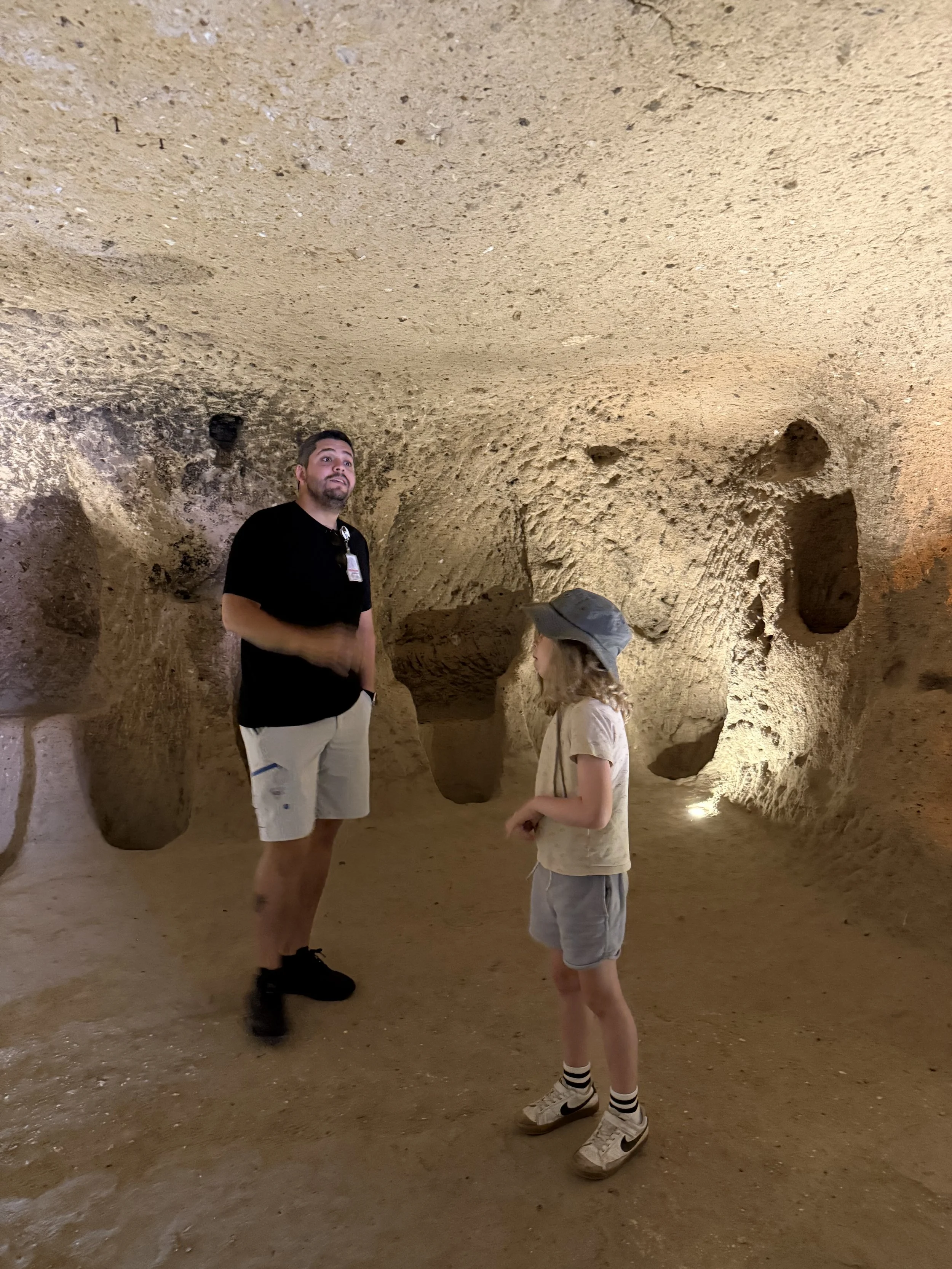We met our guide, Tugay, and driver outside the hotel, right on time! Our first stop was the Kaymakli Underground City with the hopes of being the first to enter. The tour involved going through the city, 37 meters underground. The full city actually goes down as far as 110 meters. The 37 meters, and tight spaces, was enough for Kayleen to consider passing on this tour but she decided to go for it. Luckily, we were the only ones there when we arrived, a crowd would have likely changed her mind.