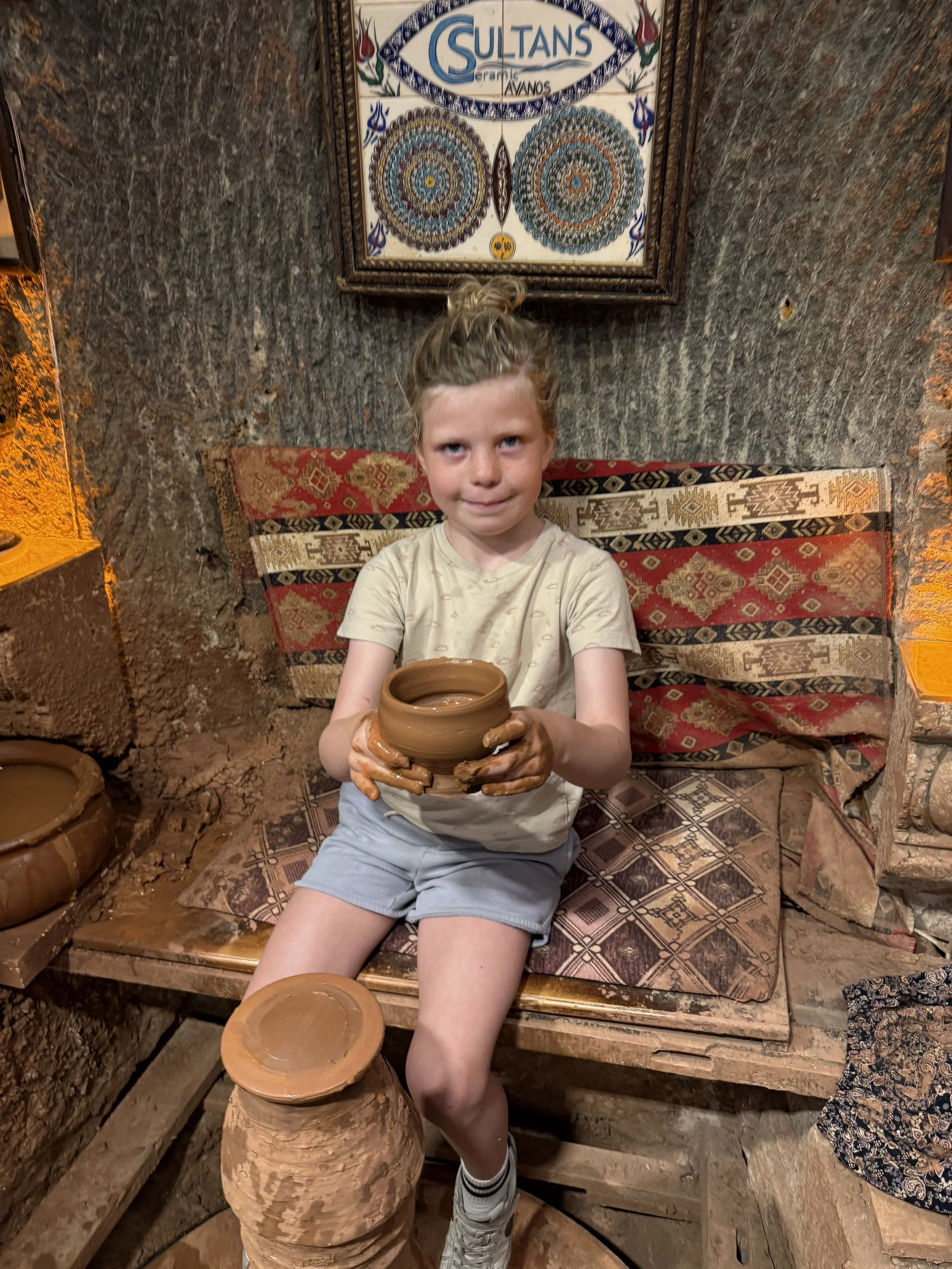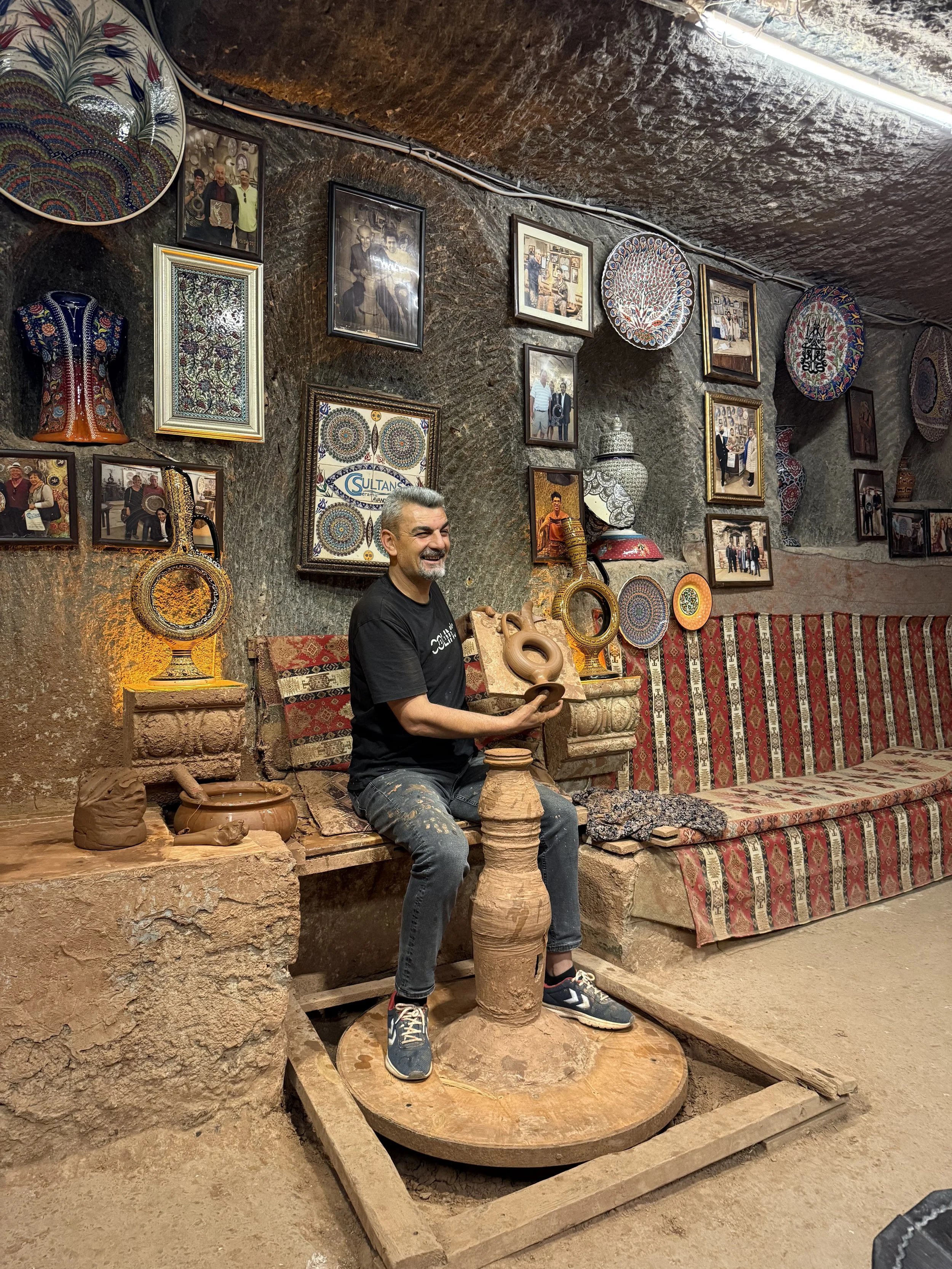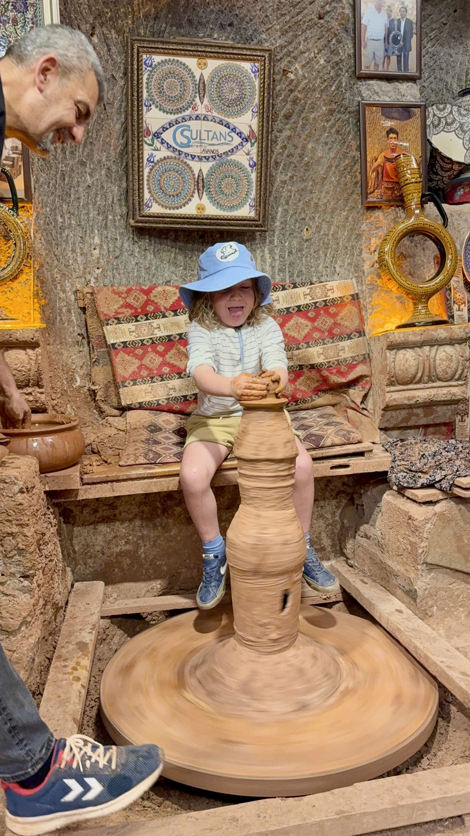 Next stop was a pottery workshop that the boys had been asking about since the moment Tugay mentioned we would stop at one today. I think he moved it up on the agenda so they would be happy/stop asking him. Our expectations were high after Morocco and sadly impossible to beat. The facility and show rooms were impressive, all inside a surface level cave. At first the person walking us through the workshop seemed genuine but then it only took a little time to feel more like a rehearsed talk with a bad sales angle. We did get to see Kapadokya’s uniquely shaped decanter (Hittite sun jug) used for serving wine while being worn on your arm like a ring. Even more impressive was watching a master potter make one on a manual kick wheel in less than 10 minutes!