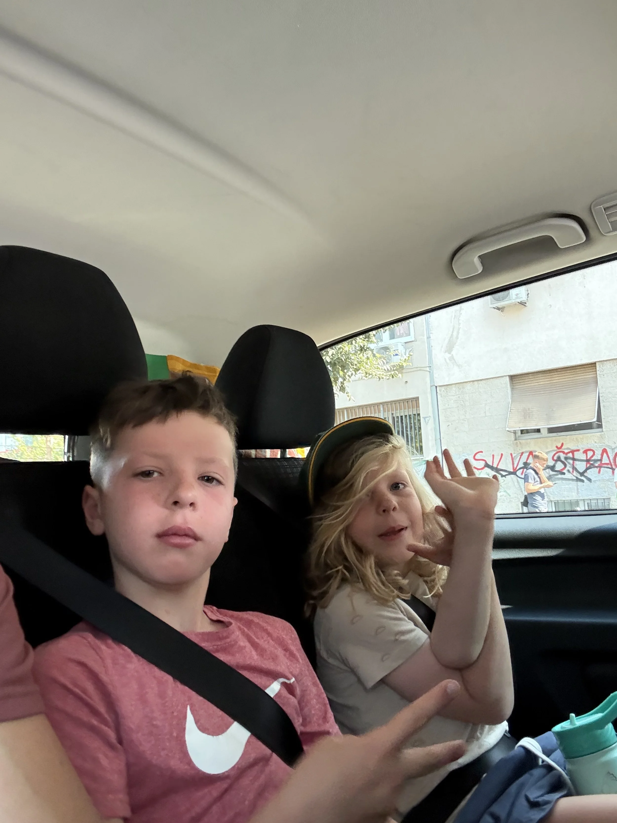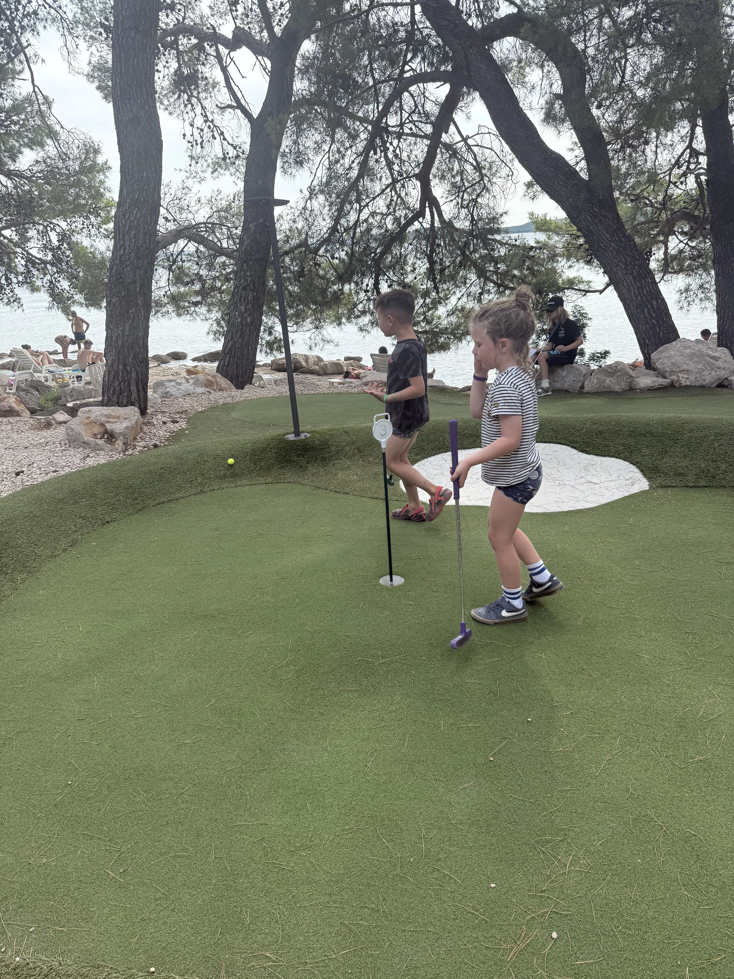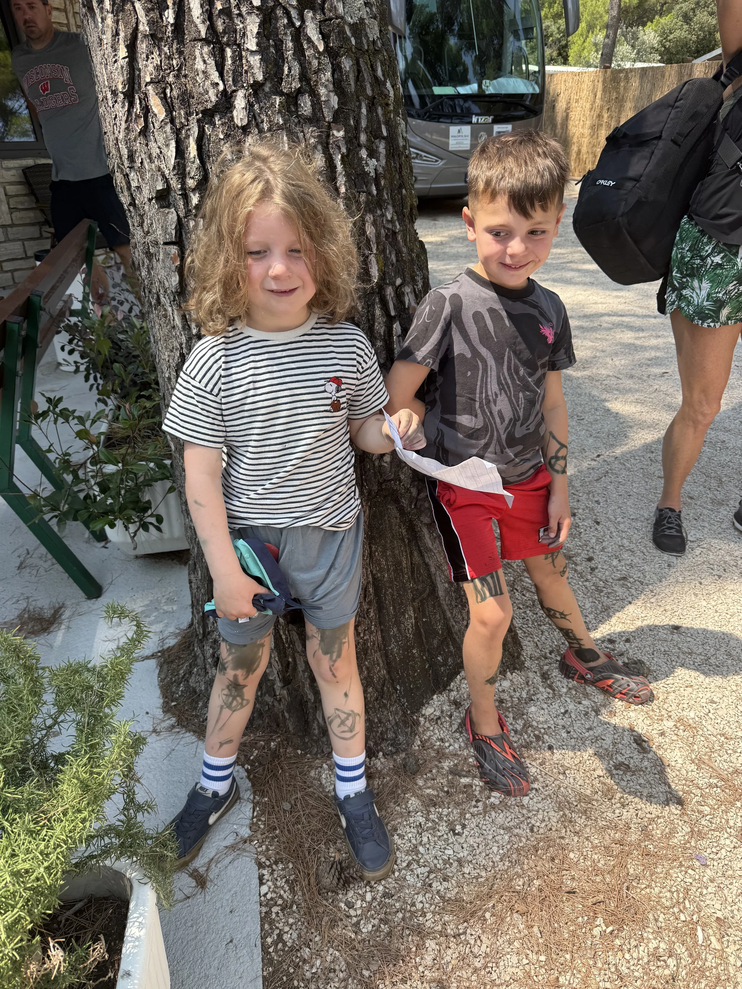 The van we got to drive all of us to the Pine Beach resort in Pakoštane picked us up first. We loaded all our stuff in and realized it would be a tight squeeze for all eight of us to fit. Next, we went to pick up the Bonk crew at their apartment. After a lot of arranging, we got everything, and everyone, in the van! I was in the back with Bradley and Ollie, Jeff in the middle row with Lenny and Brycen, and Kayleen and Red upfront with the driver. All people with some type of bag under or between their feet. The hour and a half drive was mostly uneventful, though Lenny and Brycen got a hold of a black marker and took to tattooing themselves…