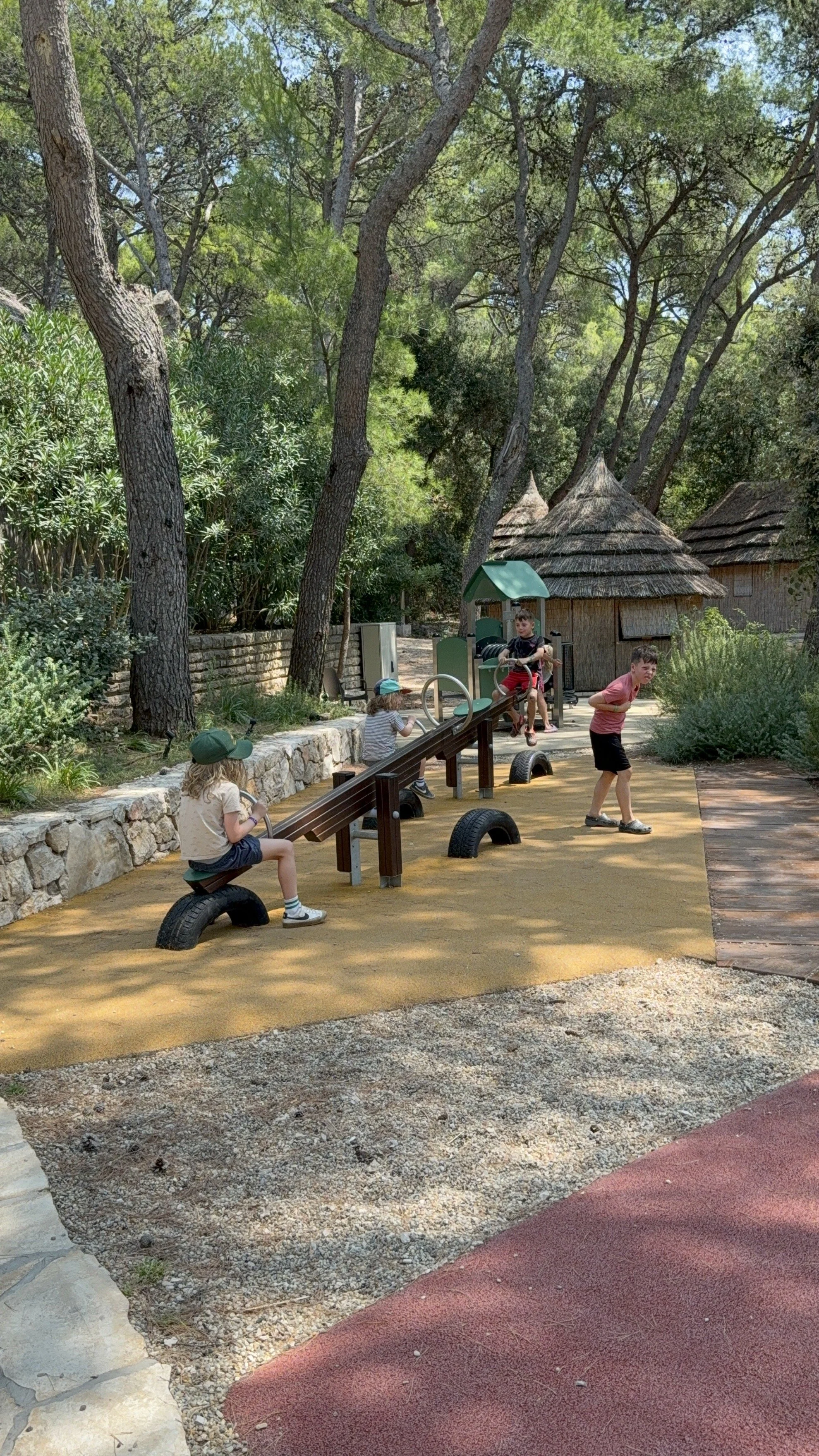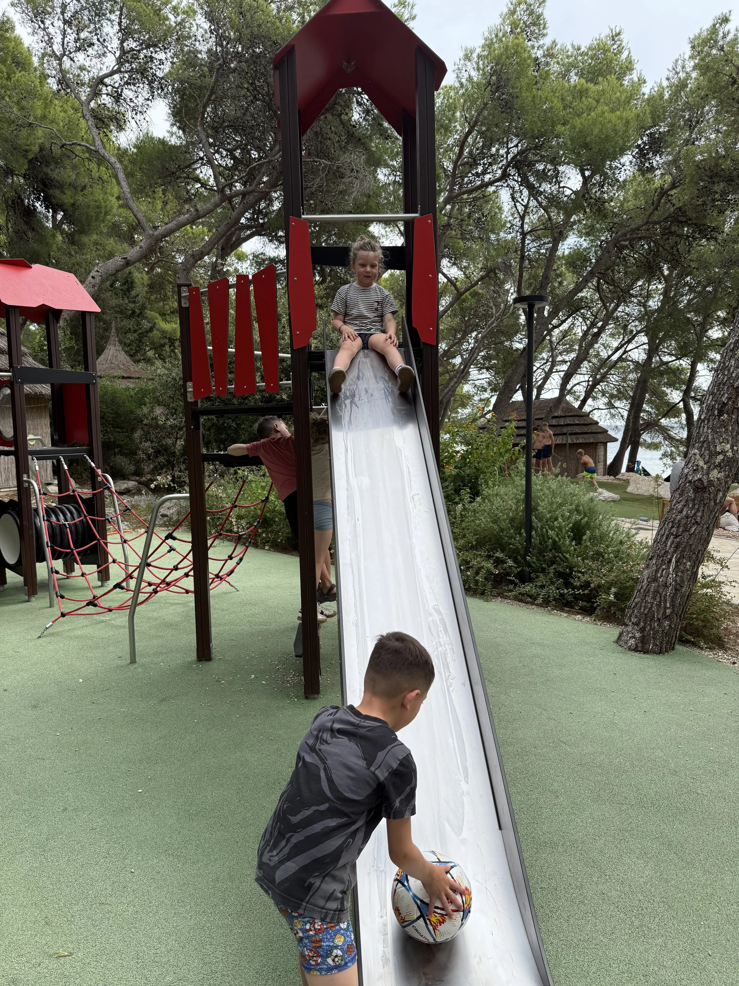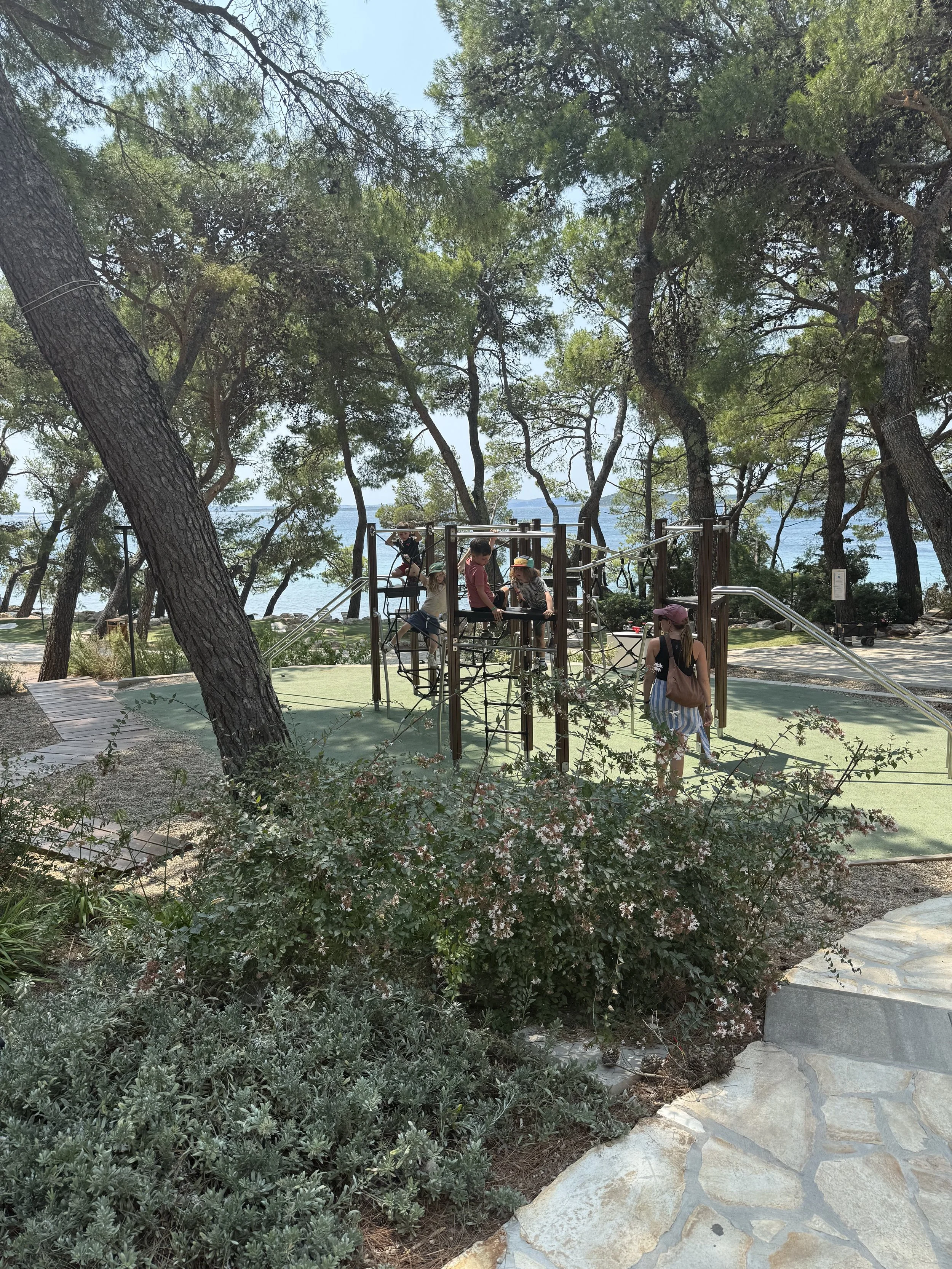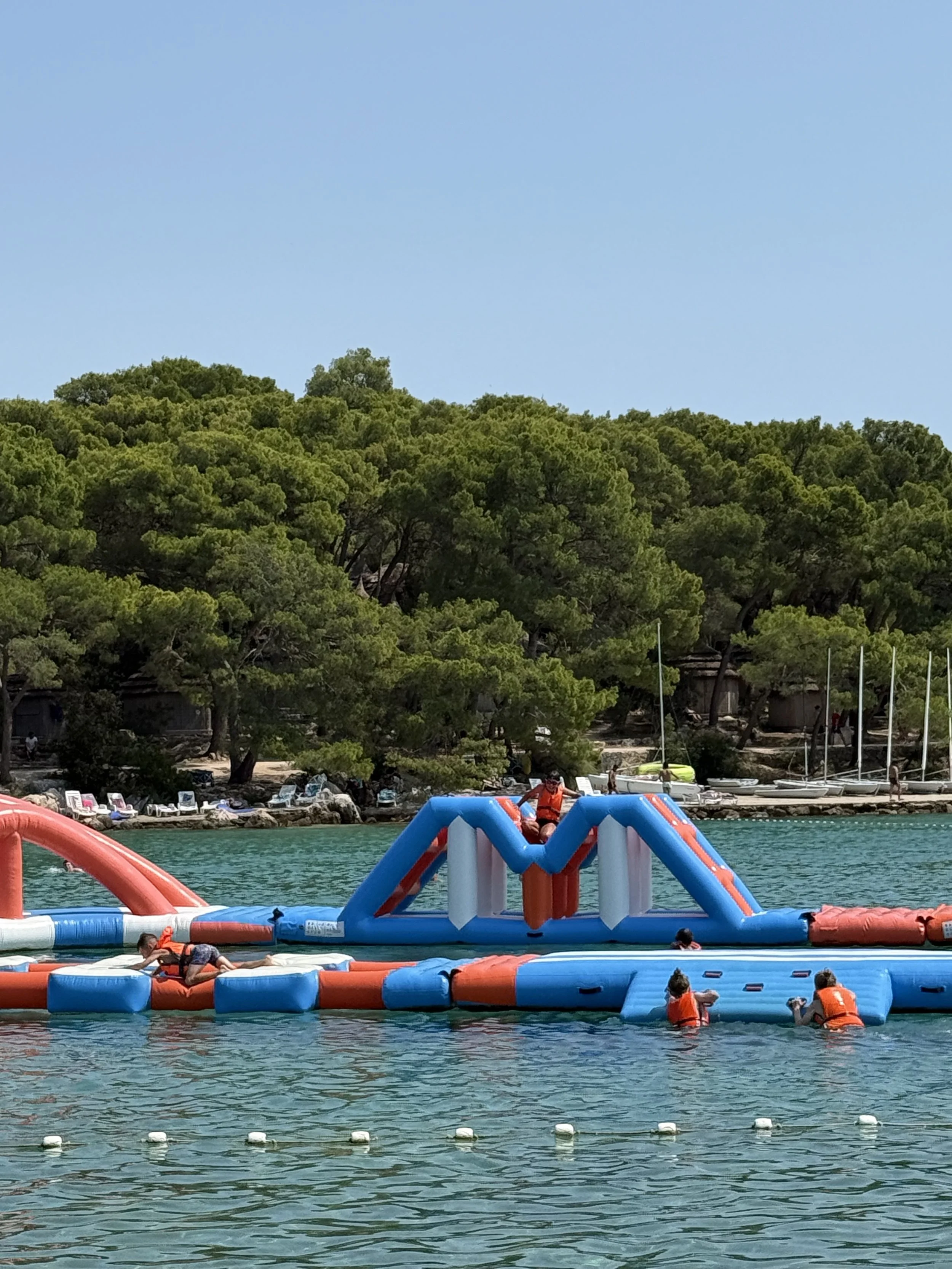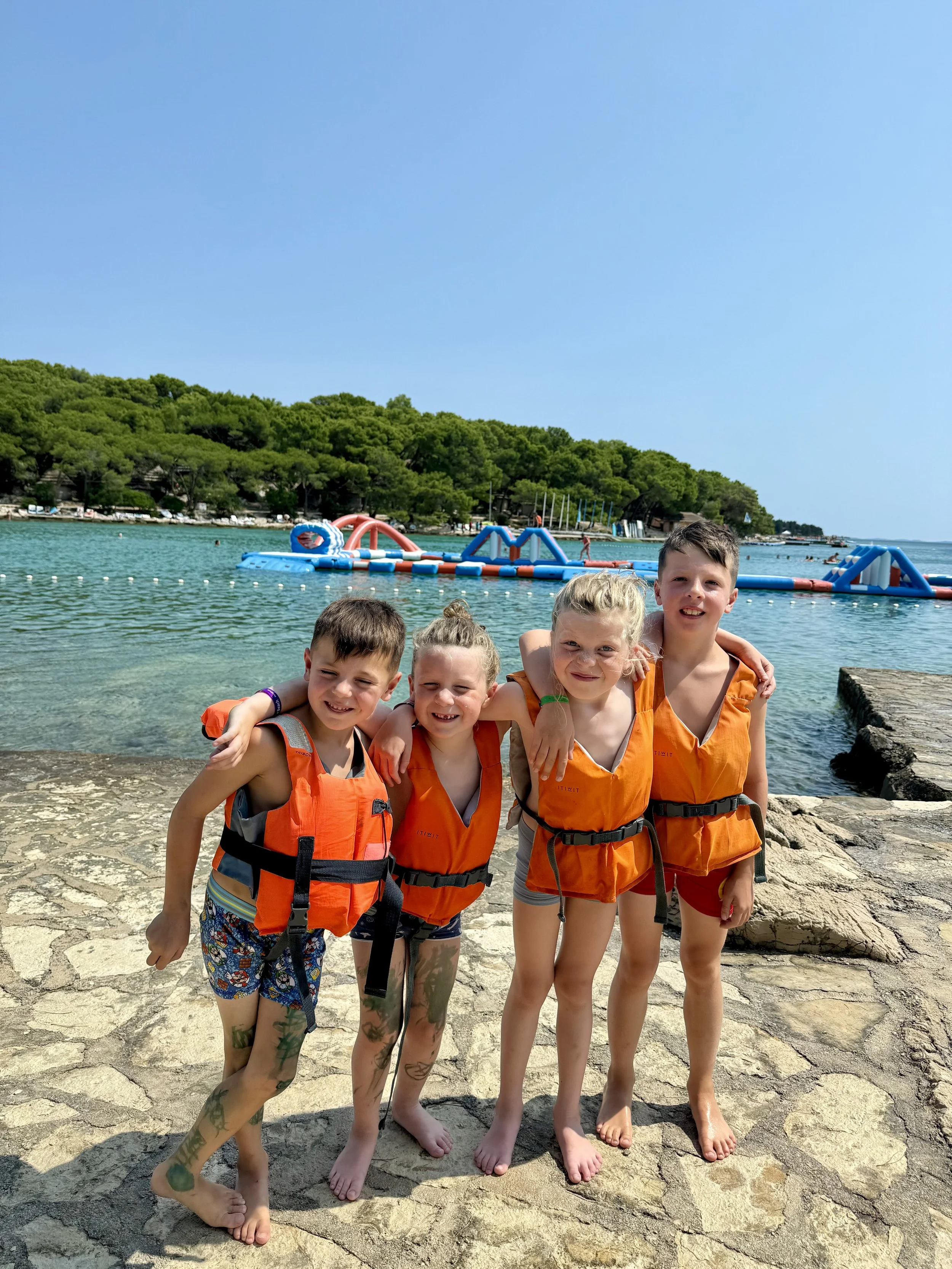 The main reason we went to the beach was to check out the obstacle course on the water. The boys stripped down to their underwear, our bags were all still at reception, and put on some life jackets before swimming out to it. They all made it out there and helped pull each other up onto the course.