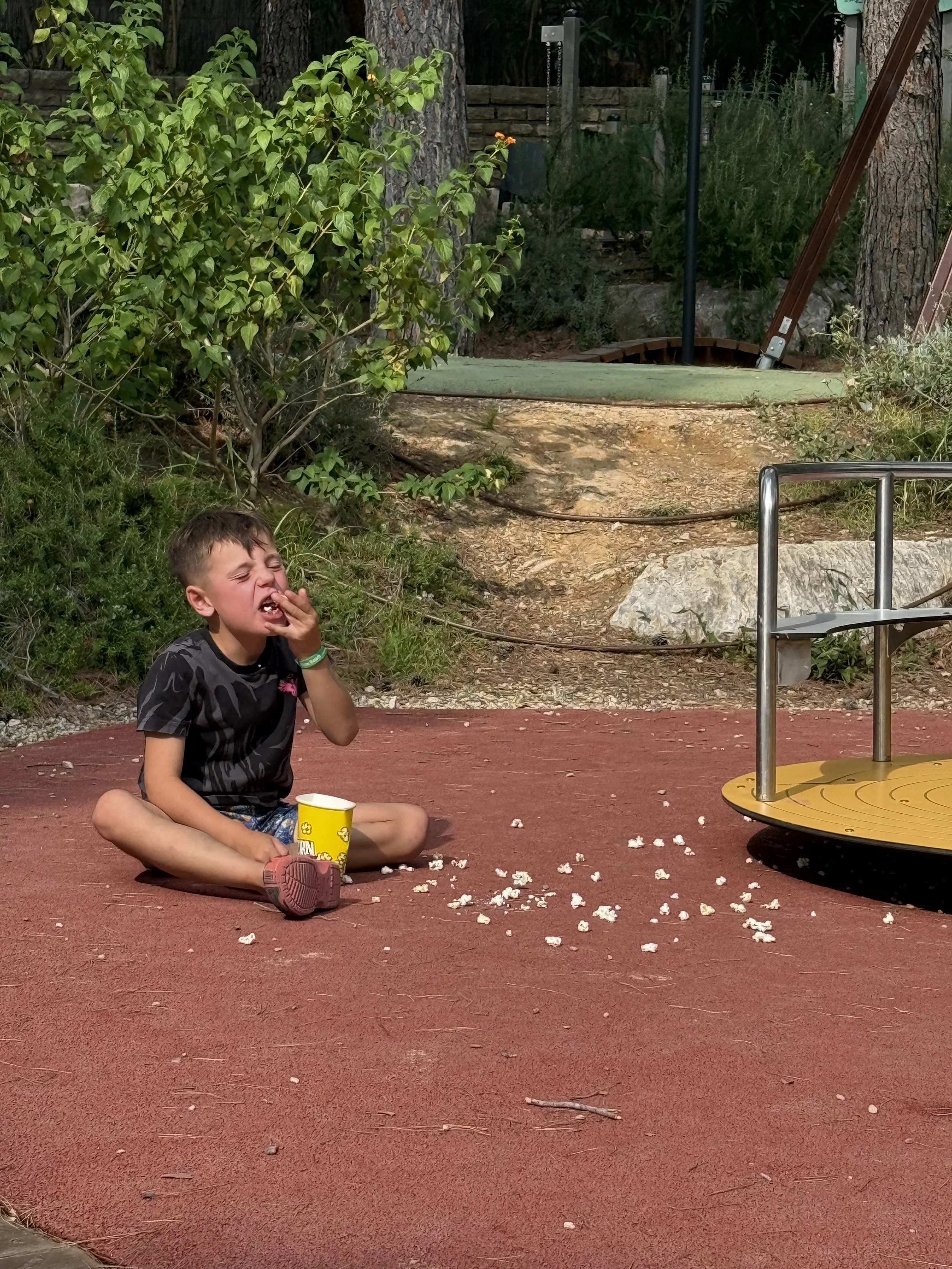 After some more time on the playground I took the kids for snack hour at the cafeteria and they were pleased to see doughnuts. They each took down multiple powdered sugar doughnuts with orange jelly filling while we caught a few Pokemon. Then it was back to the park area to regroup, Kayleen and Red attempted to go to yoga and I took our boys back to have a shower.