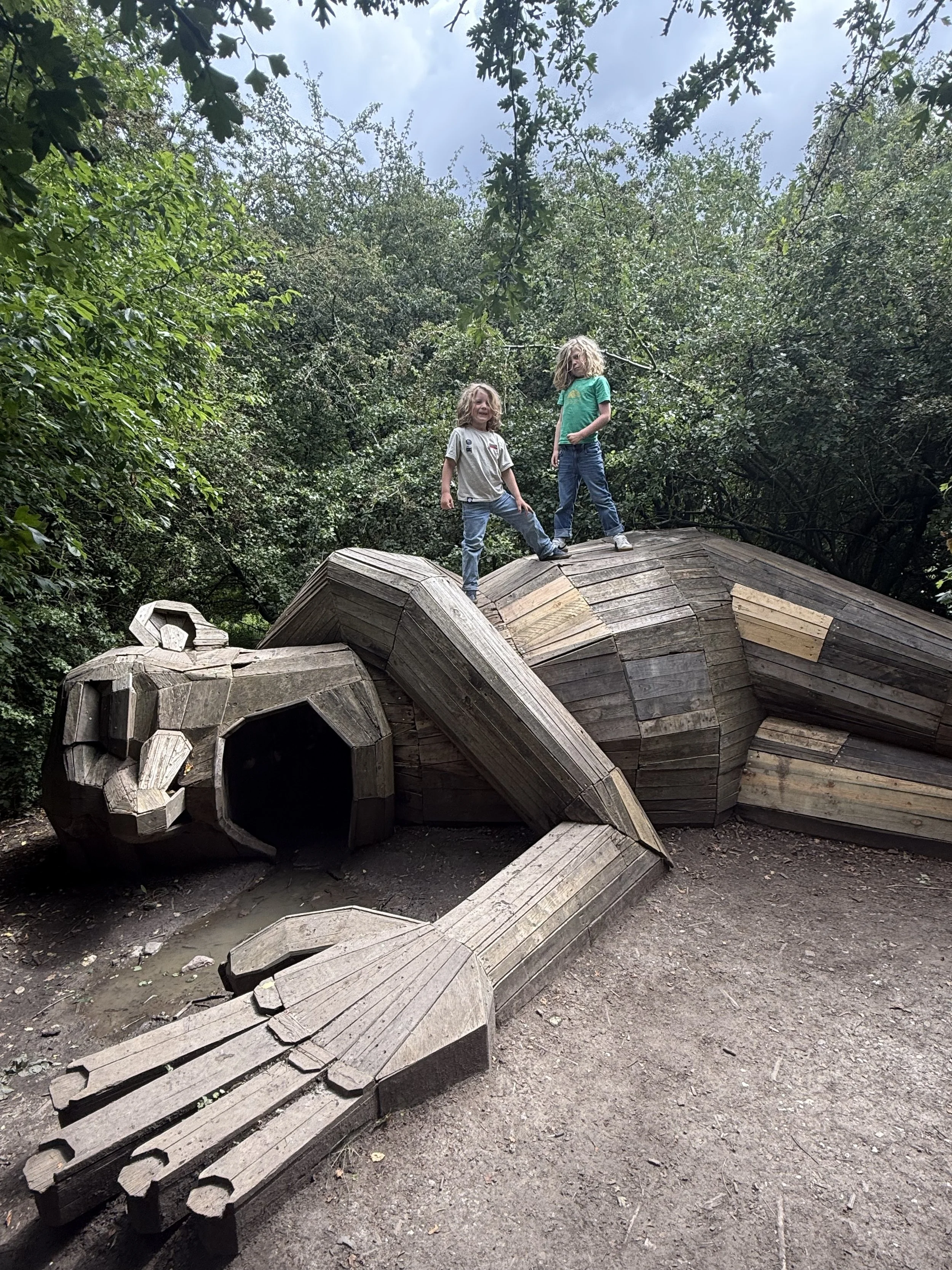 Our next stop was the sleeping Dambo troll just outside of Copenhagen. My mom and dad had seen a bunch of Thomas Dambo’s troll’s in Maine and knew the boys would love them as well. This sleeping troll was lying down so you could climb on and through him though the ground was quite muddy so we discouraged the crawling part. We’re hopeful we can see another one or two during our time in Denmark, too.