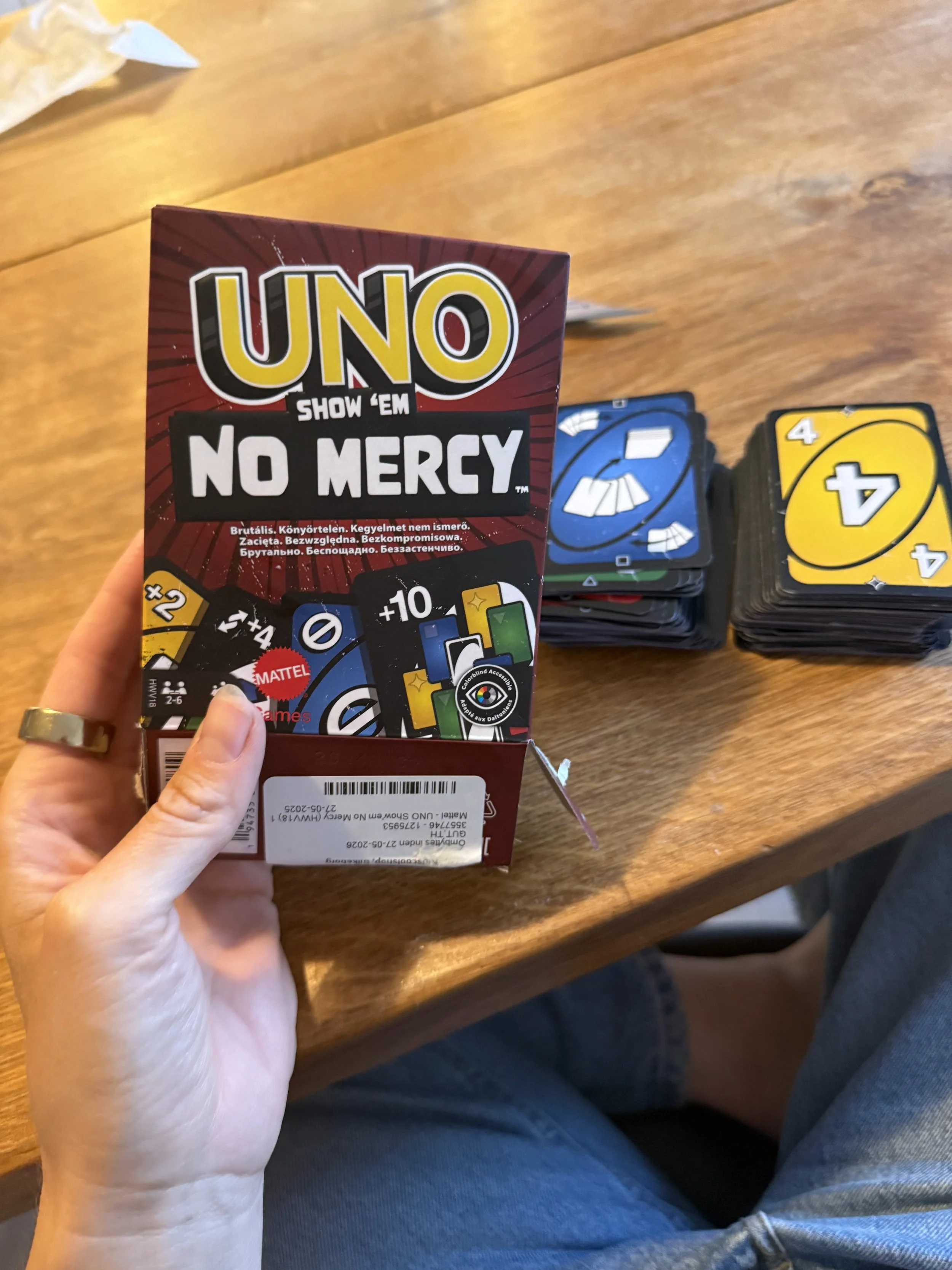 We found Uno, No Mercy at the Airbnb and the boys are excited to give it a try— especially because the front of the box showed a 10+ card!