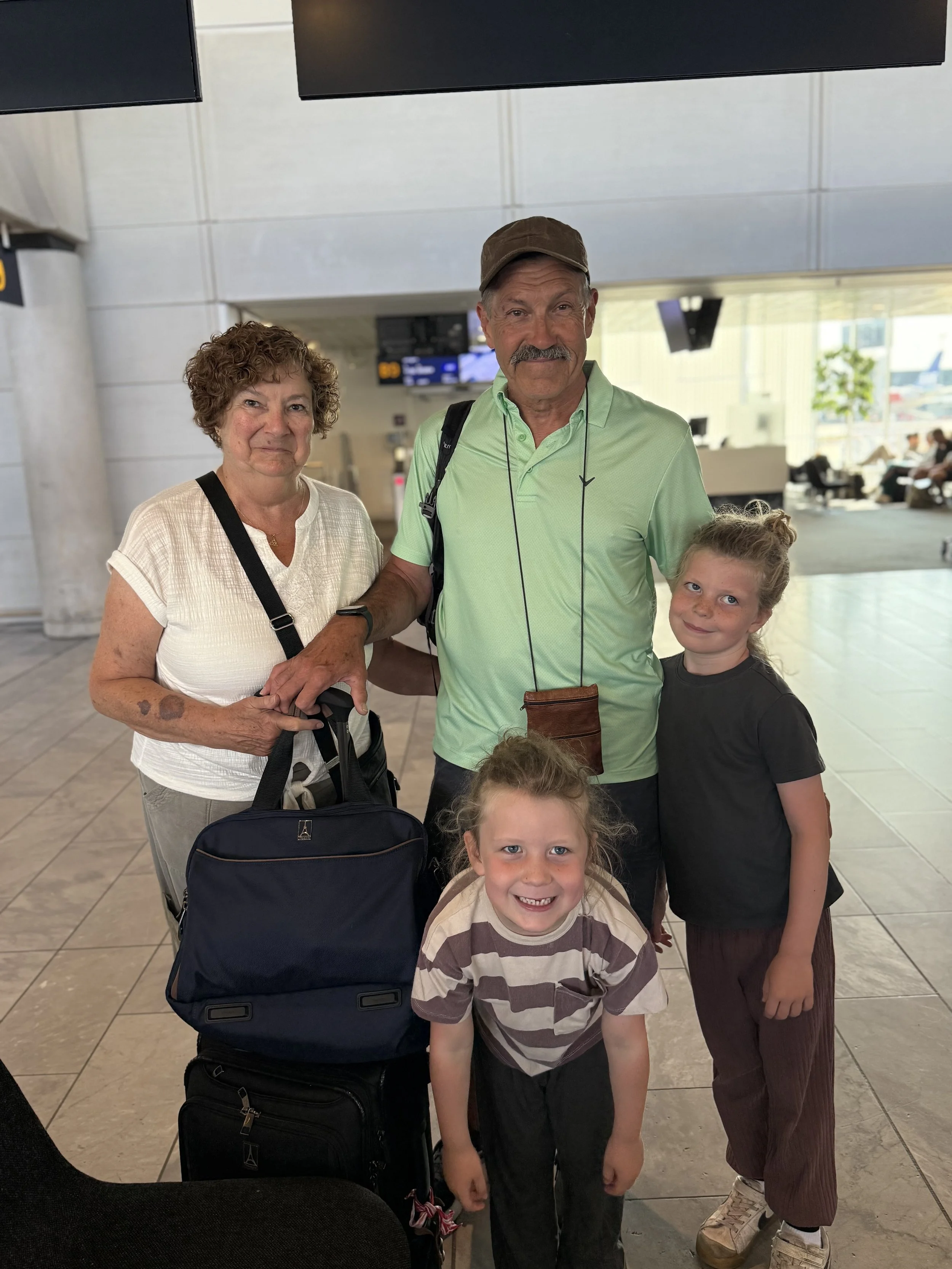 Jim and I lugged the suitcases down the four flights of stairs, easier down than up but still no easy task. Everyone loaded in the van and we were off to the airport. After another robot bag check machine, this one was easier than the last, we made our way to our gate where we said goodbye to Meme and Papa. See you for Christmas in Hawaii!