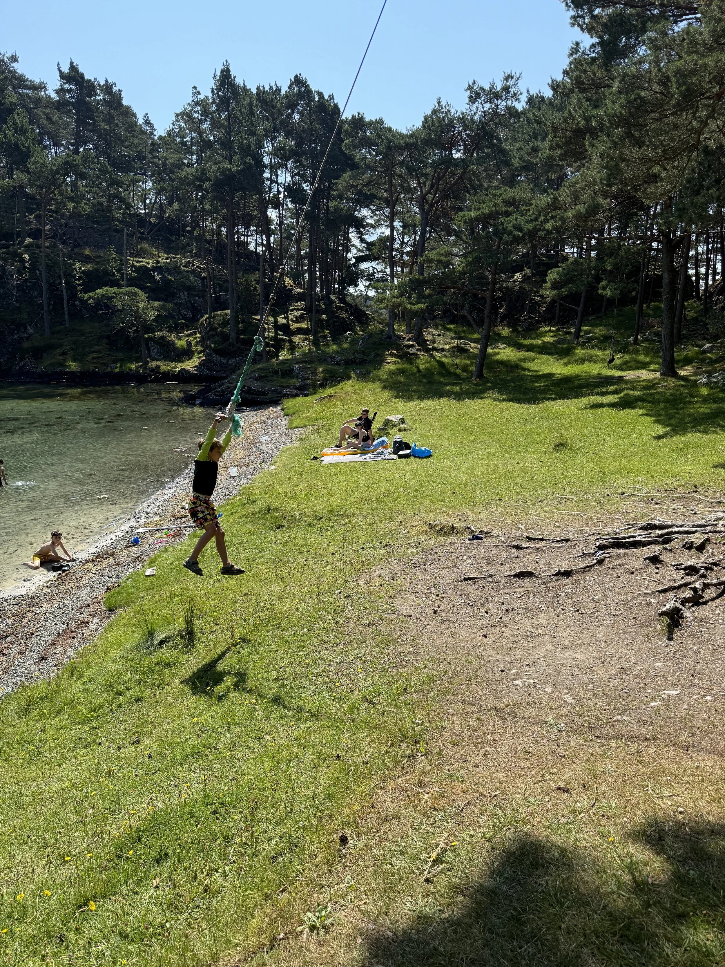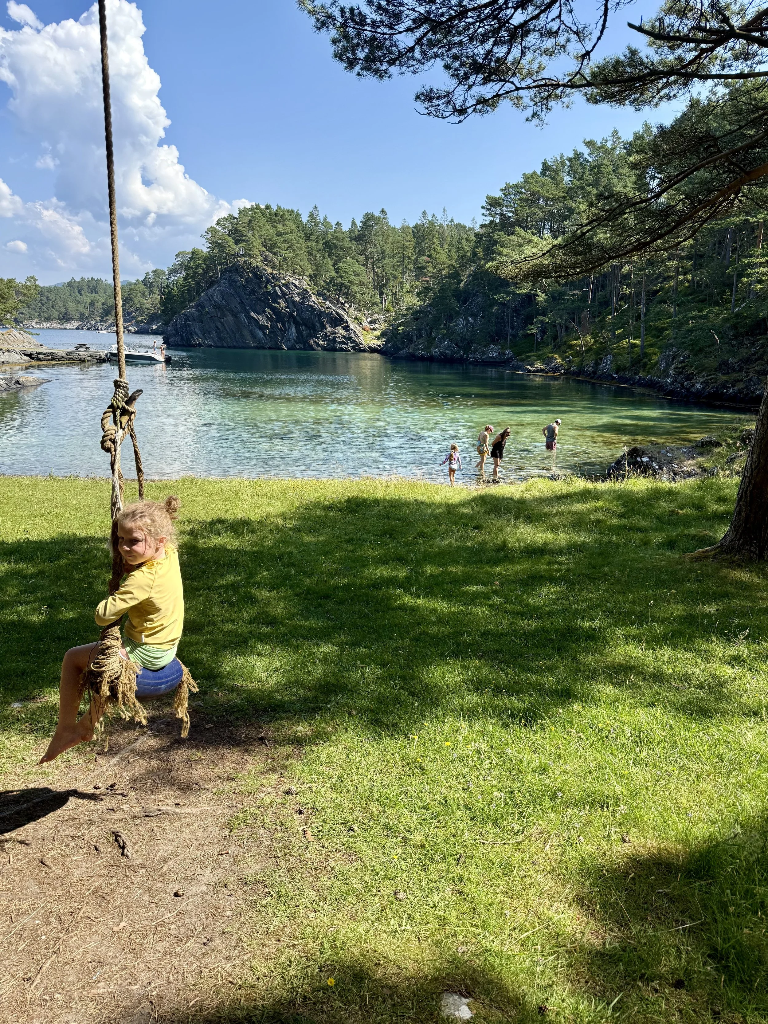 Around noon, we all went down to the marina to spend a few hours on the boat. The kids had been begging for days to go back to Oksabasen island, so we obliged. I spent the 20-minute boat ride in the front with Ollie and Kayleen, enjoying the sun and the music blasting from our Bluetooth speaker, trying to teach Ollie the lyrics to some early 2000s jams (I’m hot cuz I’m fly, you ain’t cuz you not!). I turned the music off as Kyle lowered the throttle and we mosied into the calm bay. The kids barely waited for Kyle to dock the boat before they leaped onto the cement dock and sprinted toward the rope swings. Their practice from a few days earlier was evident – bodies were twirling and landings were generally smooth.
