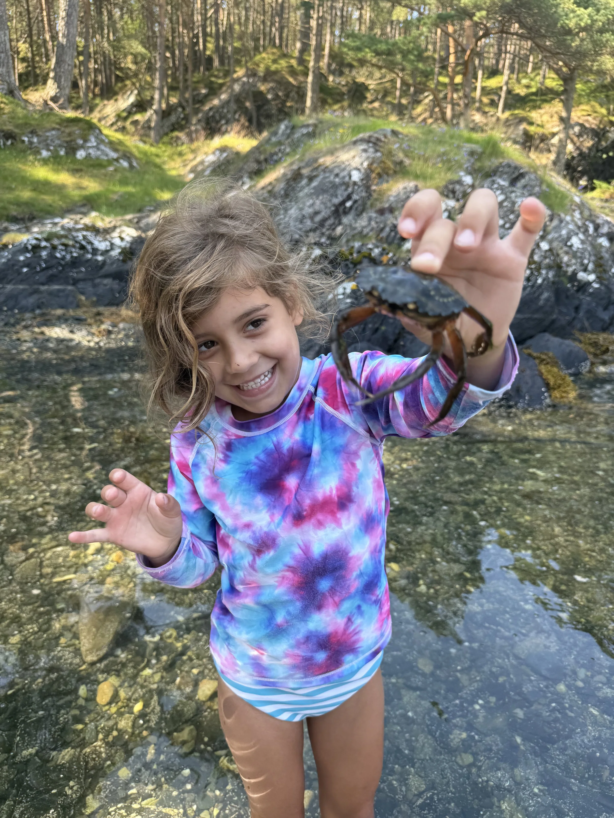 The adults left the kids to the swings and spent some time walking in the water near the shore. I was looking for some good skipping stones (hard to find) and trying to spot another starfish after Jamie found one on Sunday. We started noticing some sizeable crabs and quickly notified Kyle of our finds. Kyle eagerly came over and started trapping crabs between his sandals, proudly showing them off. Liana, always one to gravitate toward wildlife, sprinted to the water from the swings to hold the crabs that Kyle captured.