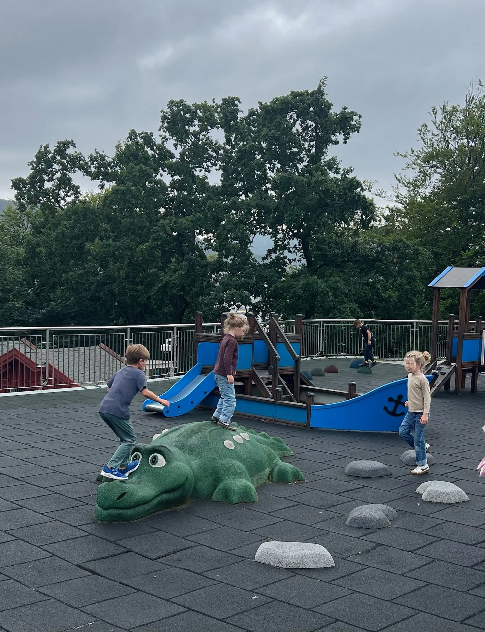 There was a playground area on the roof that gave the kids some space to run free. It overlooked the otter enclosure so we got to take turns watching the kids and otters play. Like most places we were forced to exit through the gift shop. Our kids have been told no so many times in gift shops on this trip they barely ask anymore. We waited for the rest of the crew outside playing on a steep grassy hill, some combination of tag/freeze tag/wrestling.