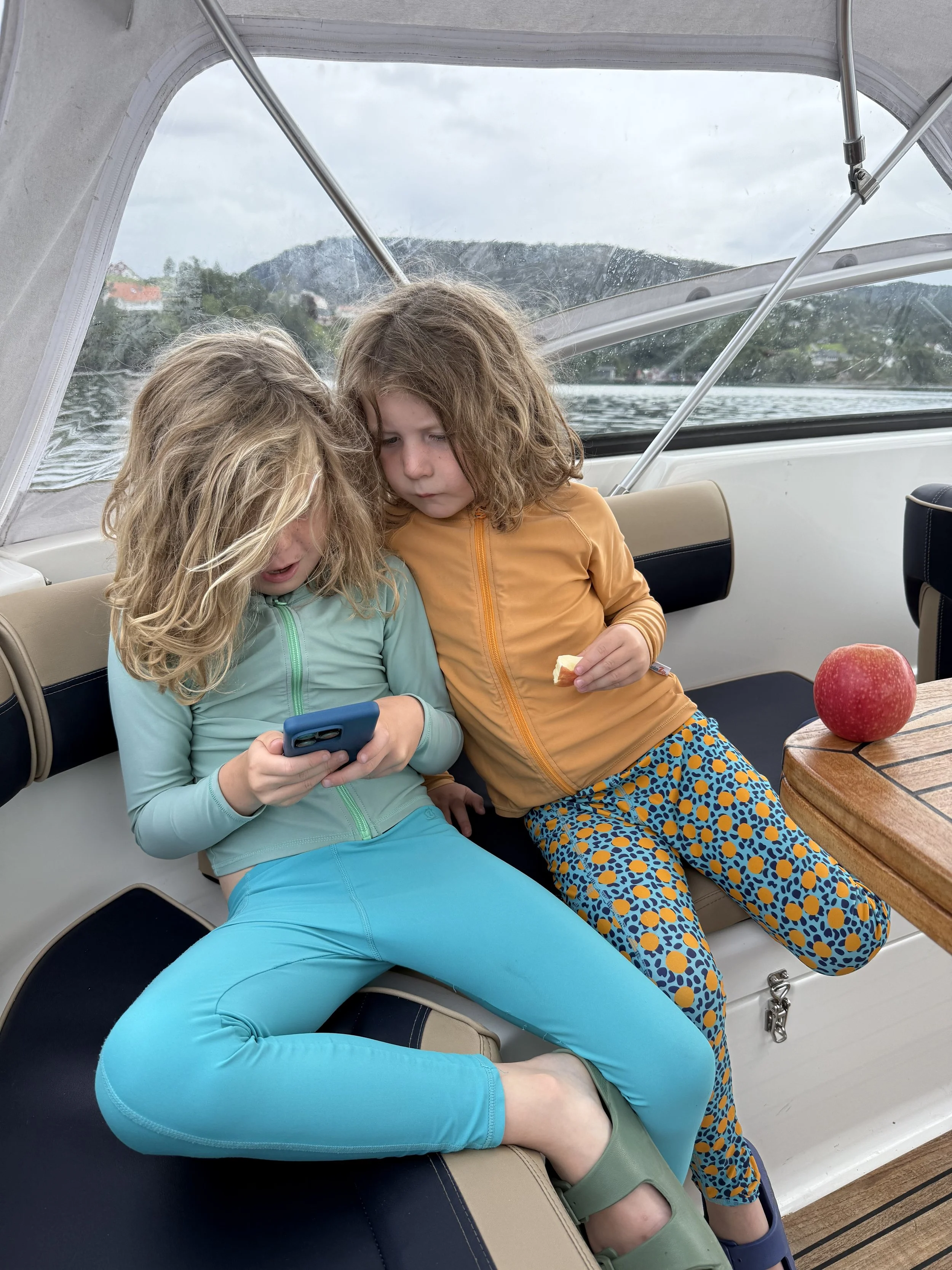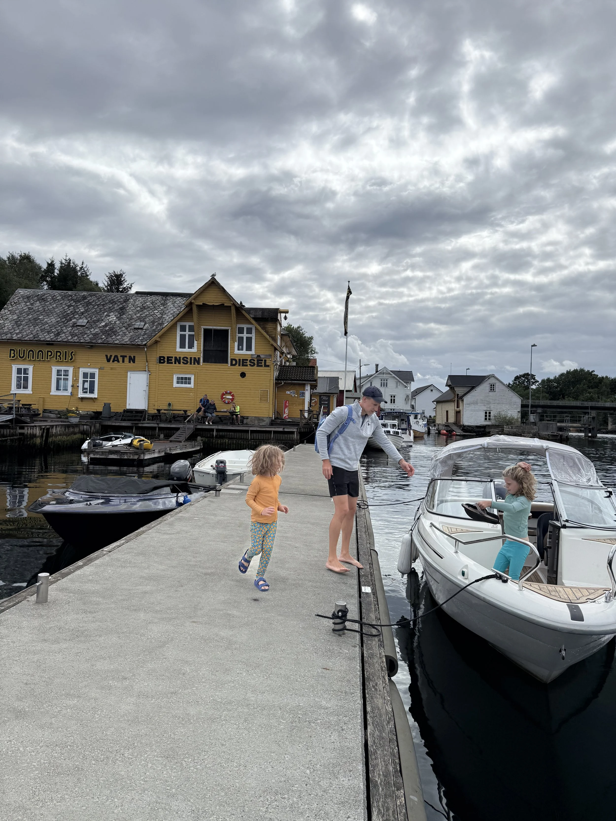 After a slow afternoon, we headed back to the marina for one final boatride. The weather was overcast and in the 60s, but we hoped for one final dip in the fjord and the boys were clamoring to get back out on the tube. We first drove past Oksabåsen island to head to a small market and fuel station to get supplies for one final dinner and to refuel the boat. We also caught and evolved a few Pokemon en route much to the boys’ delight. The grocery trip was a success but the fuel station refused to accept our credit card so that will be a problem we need to solve tomorrow.