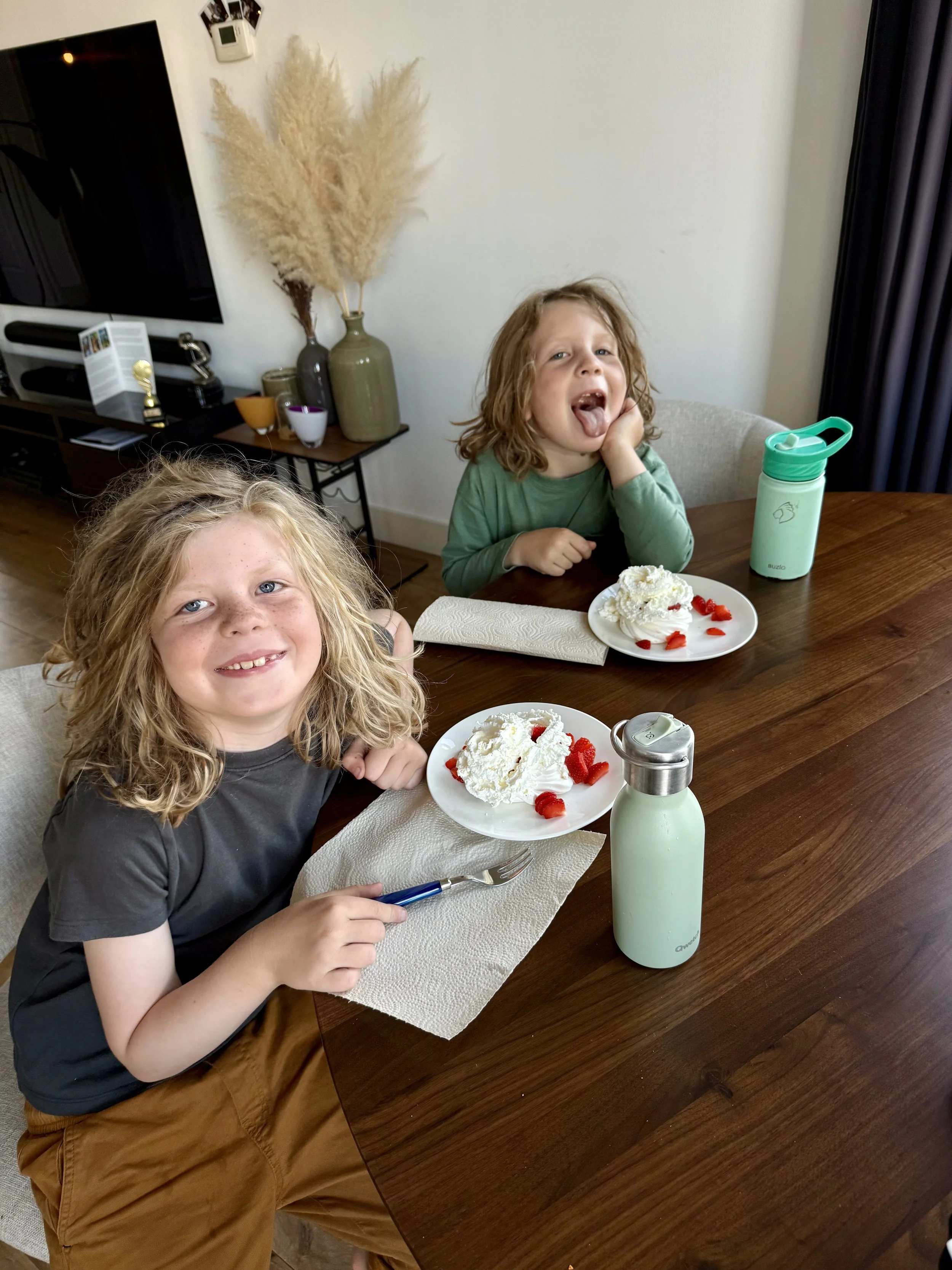 Dessert tonight for the boys was pavlova (“pagloga” or “padyoga” as they call it) with berries and cream. We are loving the availability of pavlova/meringue shells at European markets. They devoured it and raved that it was their favorite dessert. Kyle and I planned to have some too, but after bathing the kids, putting them to bed and showering ourselves, we ran out of steam and opted instead for book reading and bed.