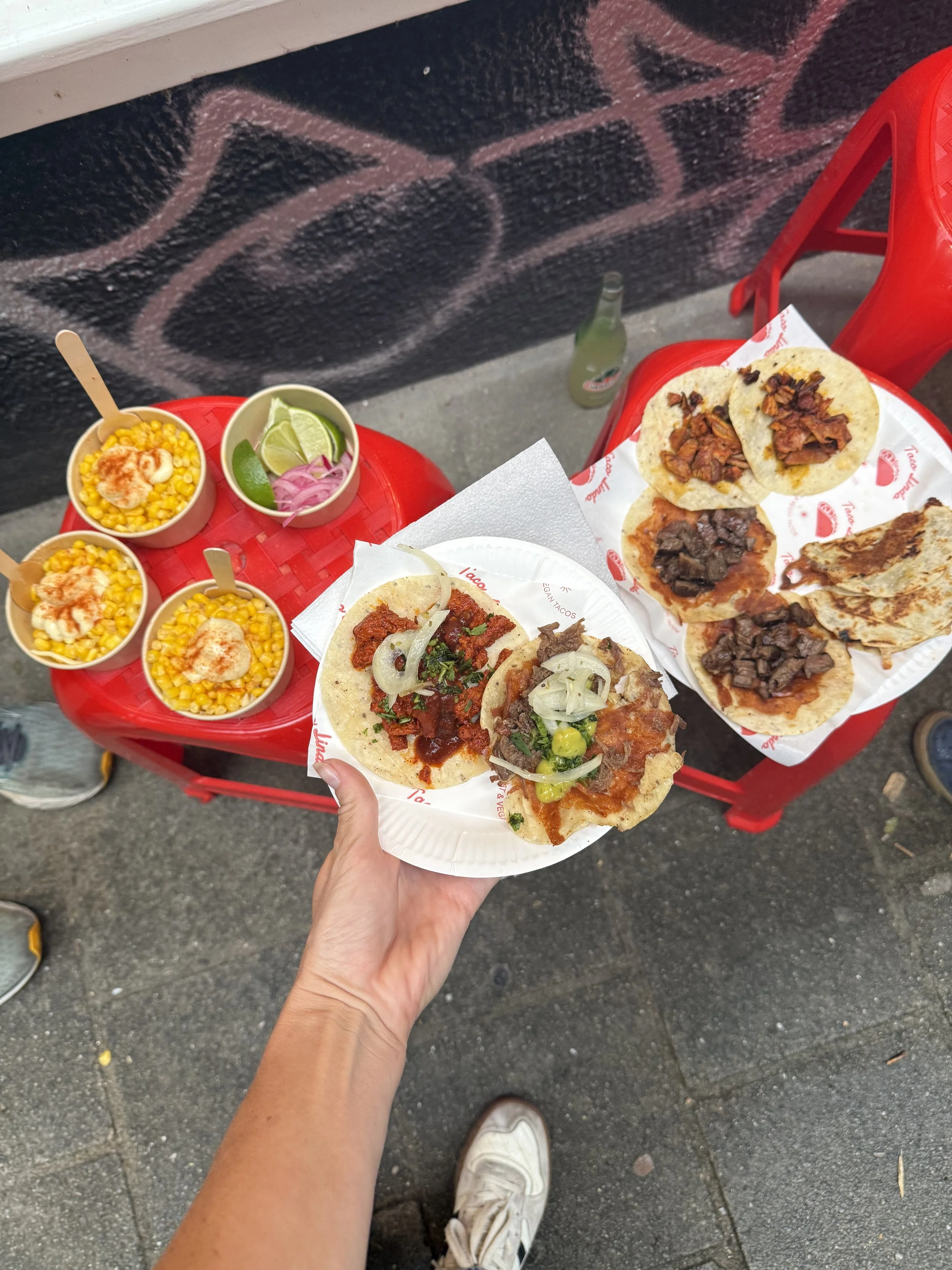 The place was tiny with only a few bar stools inside. We ordered our food and waited outside on some stools close to the building trying to stay out of the rain. We started with 8 tacos and 4 Mexican corns. We loaded Ollie’s tacos up with pickled red onions and he loved them. He ate a steak (asada), birria, and pork taco after which he asked for more. Lenny was not as fast with the tacos, he spent some time on the corn, but when done with his two wanted more. I went back in to order 6 more tacos. When we were done Ollie was the taco eating champ taking down ~5 tacos, the most out of any of us. He happily scarfed Kayleen’s last taco that had green salsa and heaps of cilantro on it. Hopefully he’ll now continually eat these things!