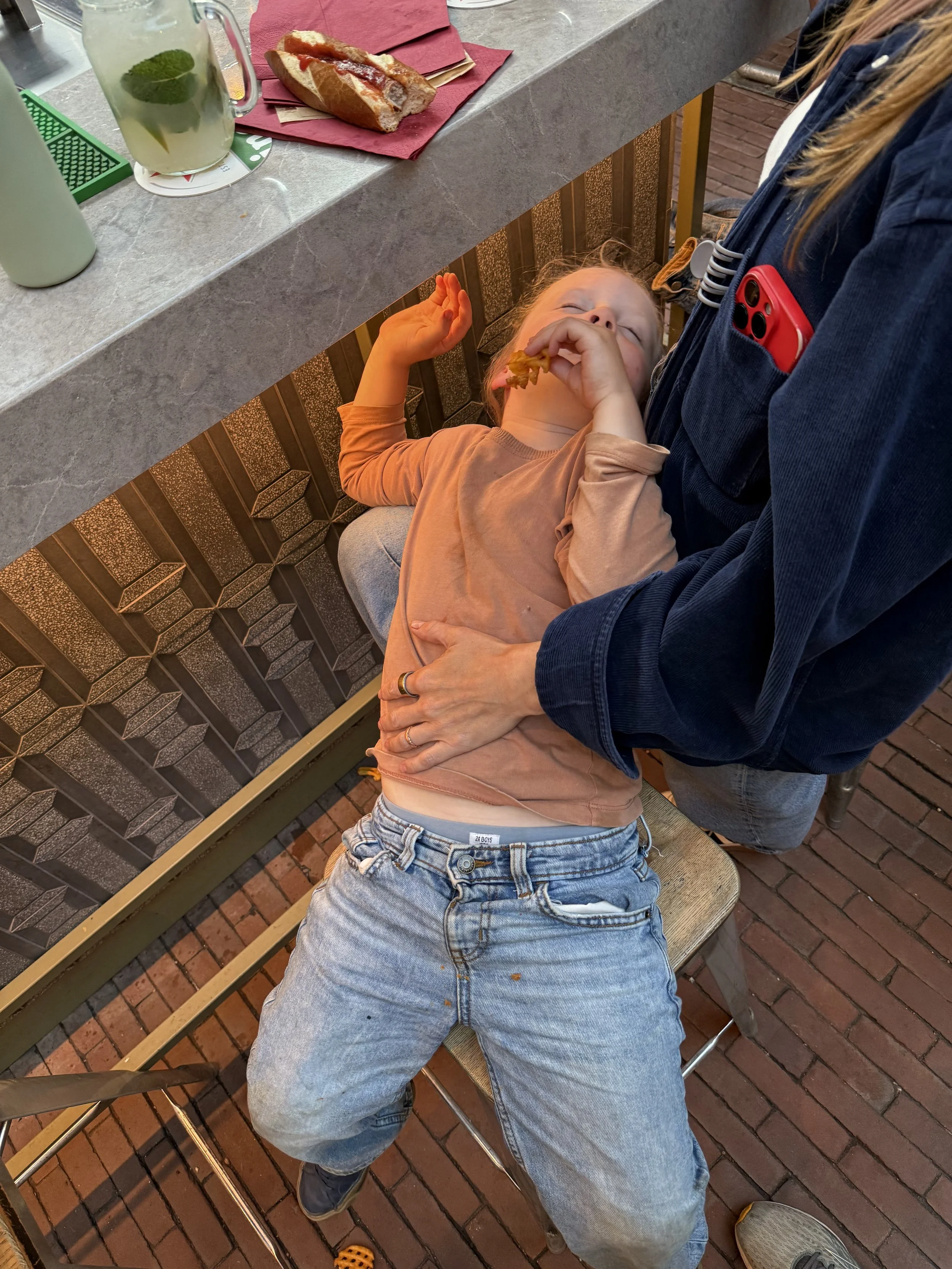 After a brief stop at the park we headed to a food hall, Foodhallen, only a few blocks from our apartment. A lot of restaurants were closed since it was Monday but luckily Foodhallen was open. The boys had hot dogs and waffle fries, the latter Lenny sleep ate while laying across Kayleen’s lap. His brief half sleep was enough to power him up for the walk home and desert once we arrived. Then off to bed as we continue to do our best to get the boys asleep before 10PM.
